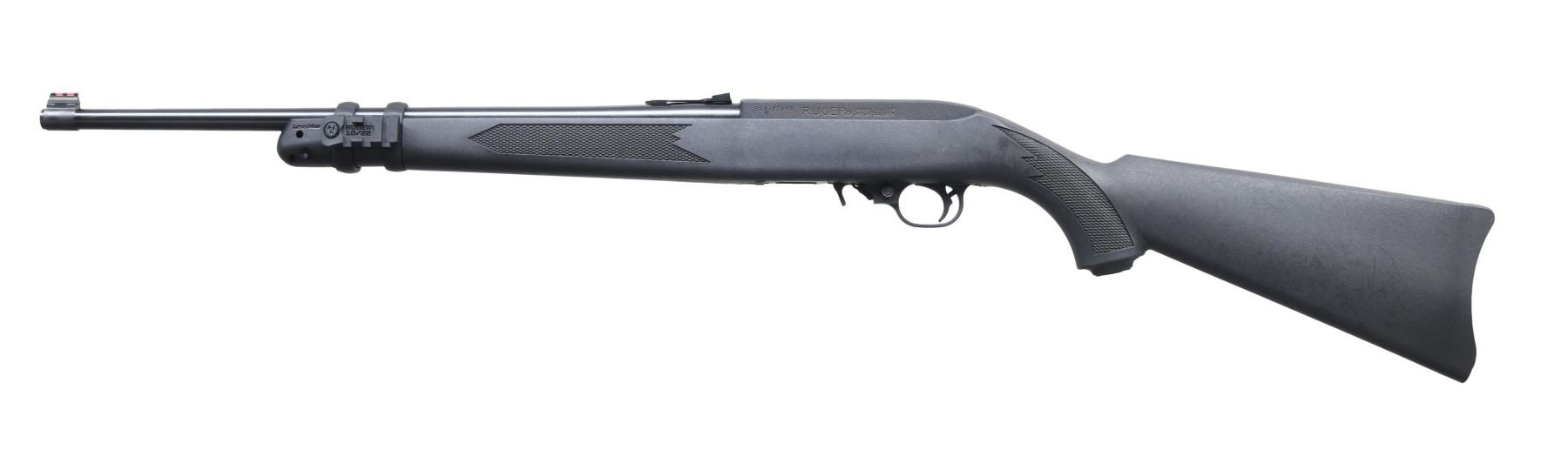LASER SIGHT. Cal. 22 LR. S# 824-77698. Bbl. 18 1/2" with banded front sight having red fiber optic bead and factory supplied William's adjustable green fiber optic rear. Mfg. 2013 (1964 to date for all 10/22's) as limited production Model 11152 having barrel band assembly with Ruger marked LaserMax laser that incorporates an accessory rail on each side. Factory black checkered synthetic stock with grip cap and integral checkered carbine buttplate. Modern production synthetic trigger guard assembly, matte finished receiver (factory drilled and tapped for scope base) and extended magazine release. MAGS: 1 factory 10 rd. CONDITION: laser is inoperable due to dead battery (1/3N); all other aspects near excellent with new, unfired appearance. (25-3336/NW). MODERN. $200-300.
