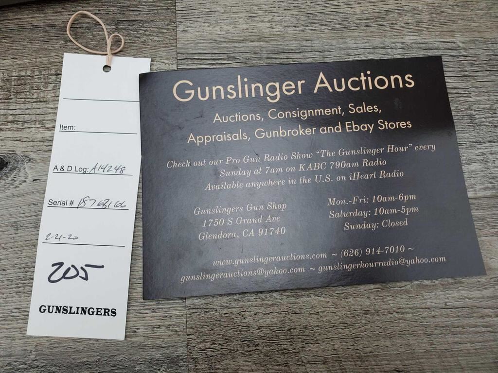 14. ALL FIREARMS WILL BE SOLD BY Gunslinger Auctions, a Federal Firearms License (FFL) Licensee in California. California BUYERS-Must pass the California Bureau of Investigations background check for all firearms. A $47 fee will be charged for the background check. If you do not pass the background check, you still must pay for the firearm(s), and they will be sold at a later auction and appropriate commission will be charged. Guns must be picked up by the purchaser at Gunslinger Auctions. All purchases will be charged to your credit card the day after the auction, once shipping charges are determined, your credit cards will again be charged for shipping. No one but the purchaser will be allowed to pick up the firearms. BUYER'S FROM OUTSIDE CALIFORNIA OR OUT OF AREA BUYERS- IMMEDIATELY FOLLOWING THE AUCTION YOUR CREDIT CARD WILL BE CHARGED FOR YOUR PURCHASES AND BIDDING FEE'S. YOU ARE REQUIRED TO Contact a Federally licensed firearm dealer in your state who will accept shipment and transfer the firearm to you in your state. YOU ARE RESPONSIBLE TO DETERMINE YOUR ABILITY TO PURCHASE A FIREARM IN YOUR STATE. IF YOU FAIL TO QUALIFY IN YOUR STATE YOU WILL THEN OWN A WEAPON THAT YOU CAN'T POSESS. ALL SALES ARE ABSOLUTELY FINAL ON THE DAY OF SALE. Gunslinger Auctions will arrange shipping on all firearms through a local pack/ship company or a national company of your choice. The cost of the shipping will be paid by the purchaser prior to shipment. HANDGUN?S REQUIRE OVERNIGHT SHIPPING. Visa, Master Card and American Express are accepted for payment. YOU MUST BE OVER 21 YEARS OLD TO BUY LONG GUNS. YOU MUST BE OVER 21 YEARS OLD TO BUY HANDGUNS ATF FORMS WILL BE FILLED OUT ON ALL GUNS, with the exception of pre 1898 antique's. Gunslinger Auctions has not fired any firearm in this auction (Unless otherwise noted). As such we cannot and do not warranty these items. Our conditions range from New in Box, Outstanding, Excellent, Very Good, Good, Fair & Poor. Please pay attention to our ratings. They are our opinions ONLY, so you should make every effort to inspect them yourselves.