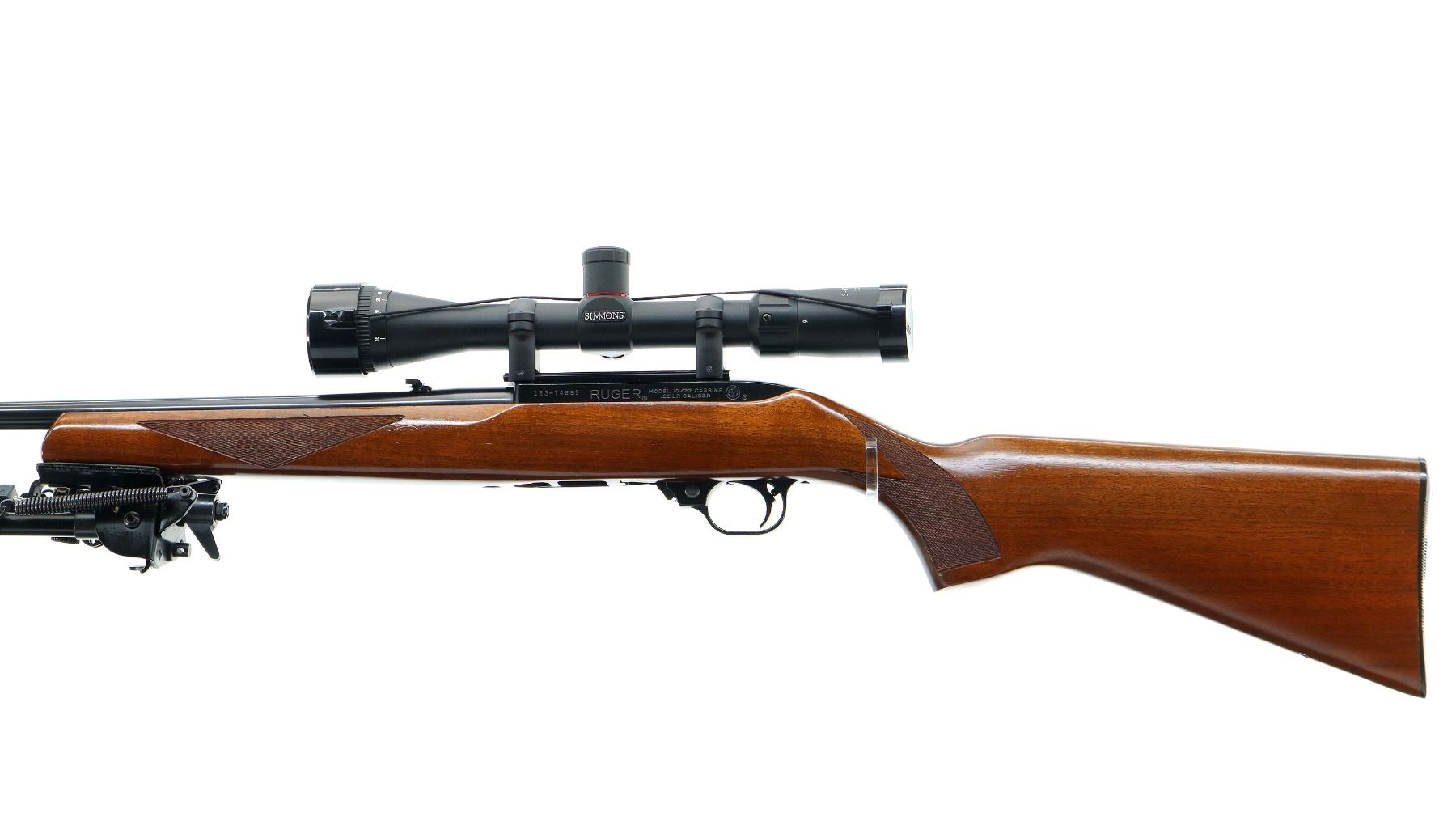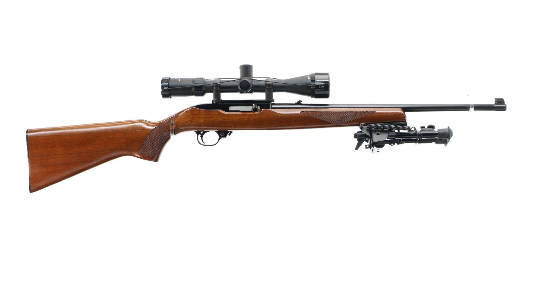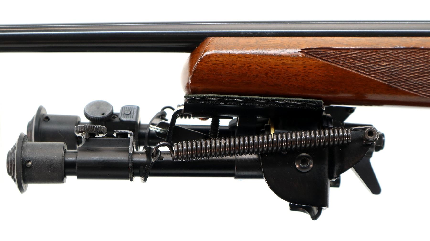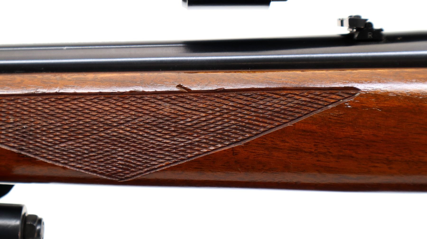 Main Description: Blade front sight with ramp, adjustable folding u notched rear sight, blued barrel, black alloy receiver drilled and tapped with Simmons 22 Mag 3-9x32 WA/AO scope installed, clear optics with duplex crosshair. One piece wood stock, checkered forearm and pistol grip, grooved black polymer butt plate, missing rear swivel stud hole is present, has a front swivel stud with adjustable folding pivoting bipod installed.