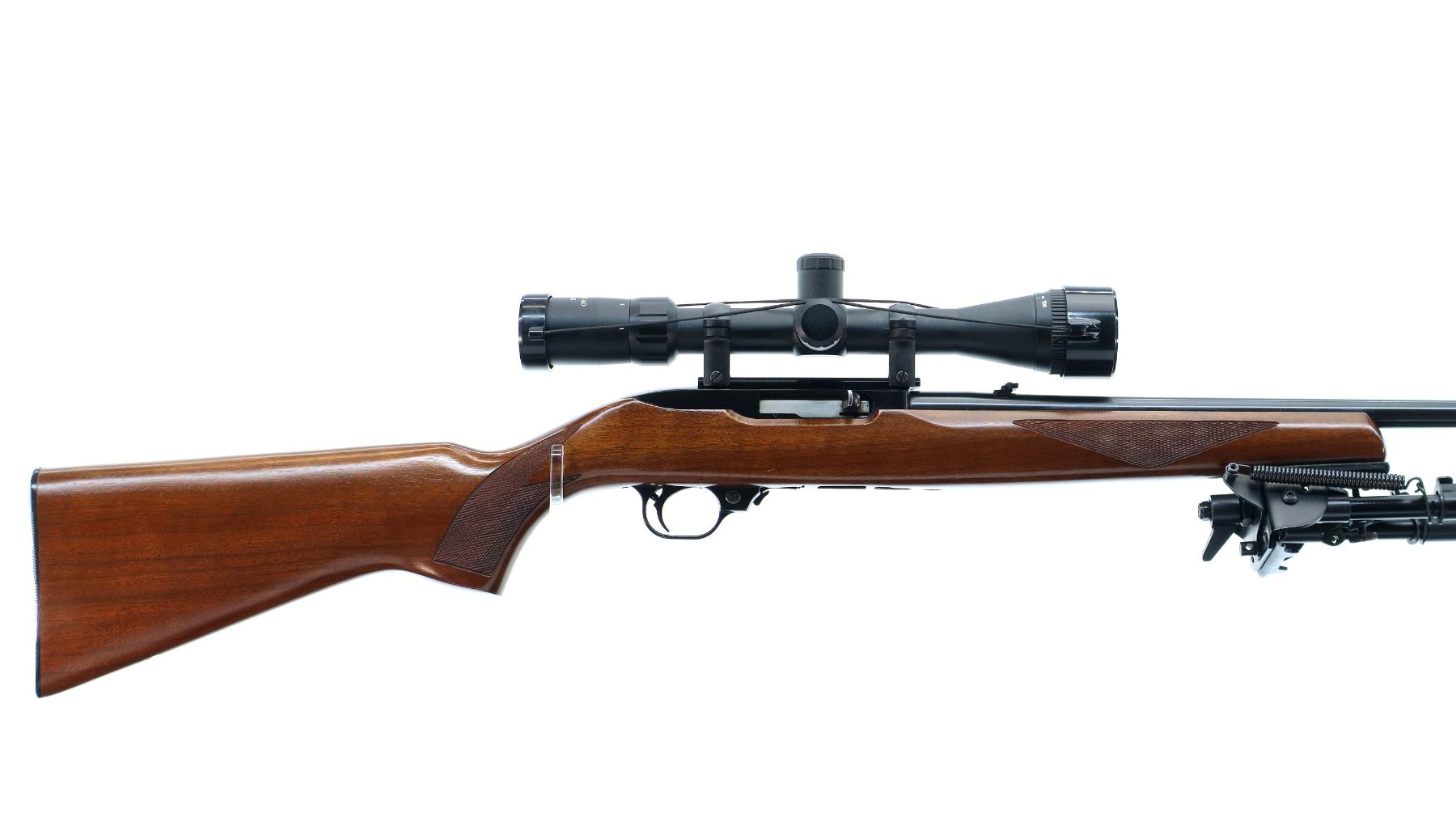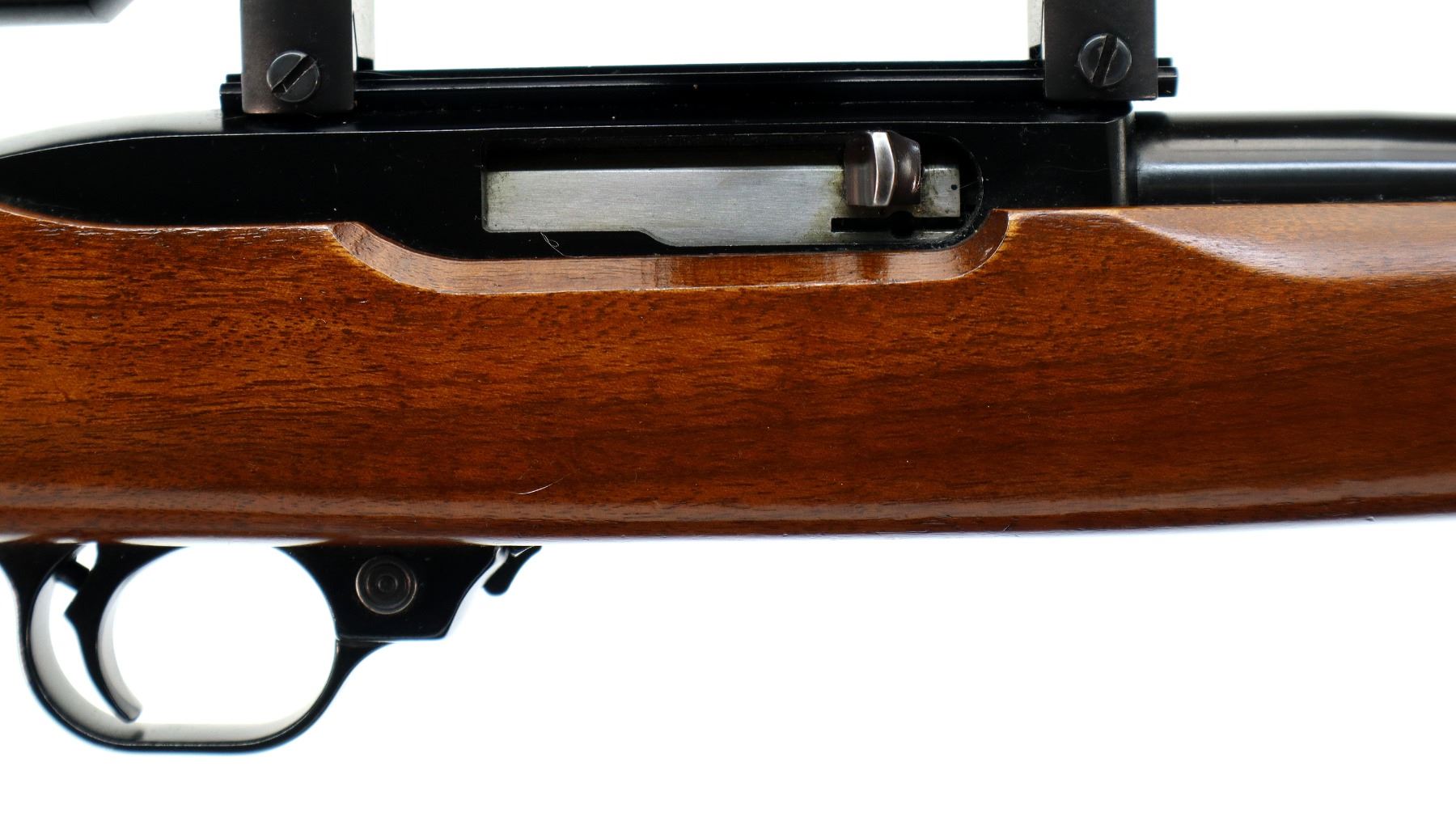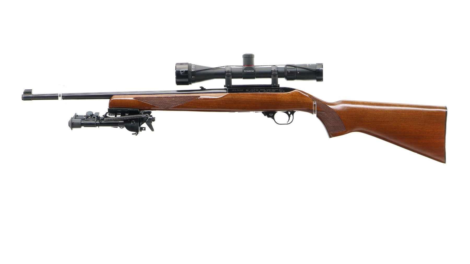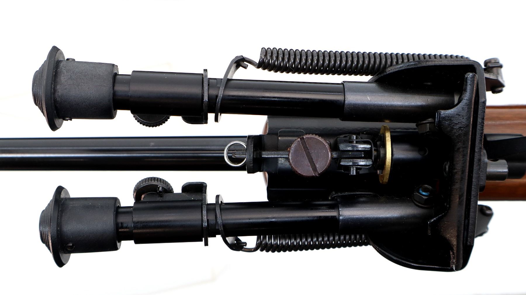 Main Description: Blade front sight with ramp, adjustable folding u notched rear sight, blued barrel, black alloy receiver drilled and tapped with Simmons 22 Mag 3-9x32 WA/AO scope installed, clear optics with duplex crosshair. One piece wood stock, checkered forearm and pistol grip, grooved black polymer butt plate, missing rear swivel stud hole is present, has a front swivel stud with adjustable folding pivoting bipod installed.