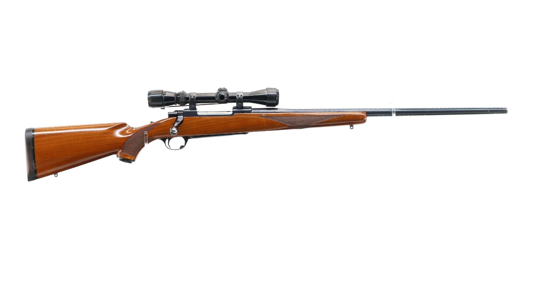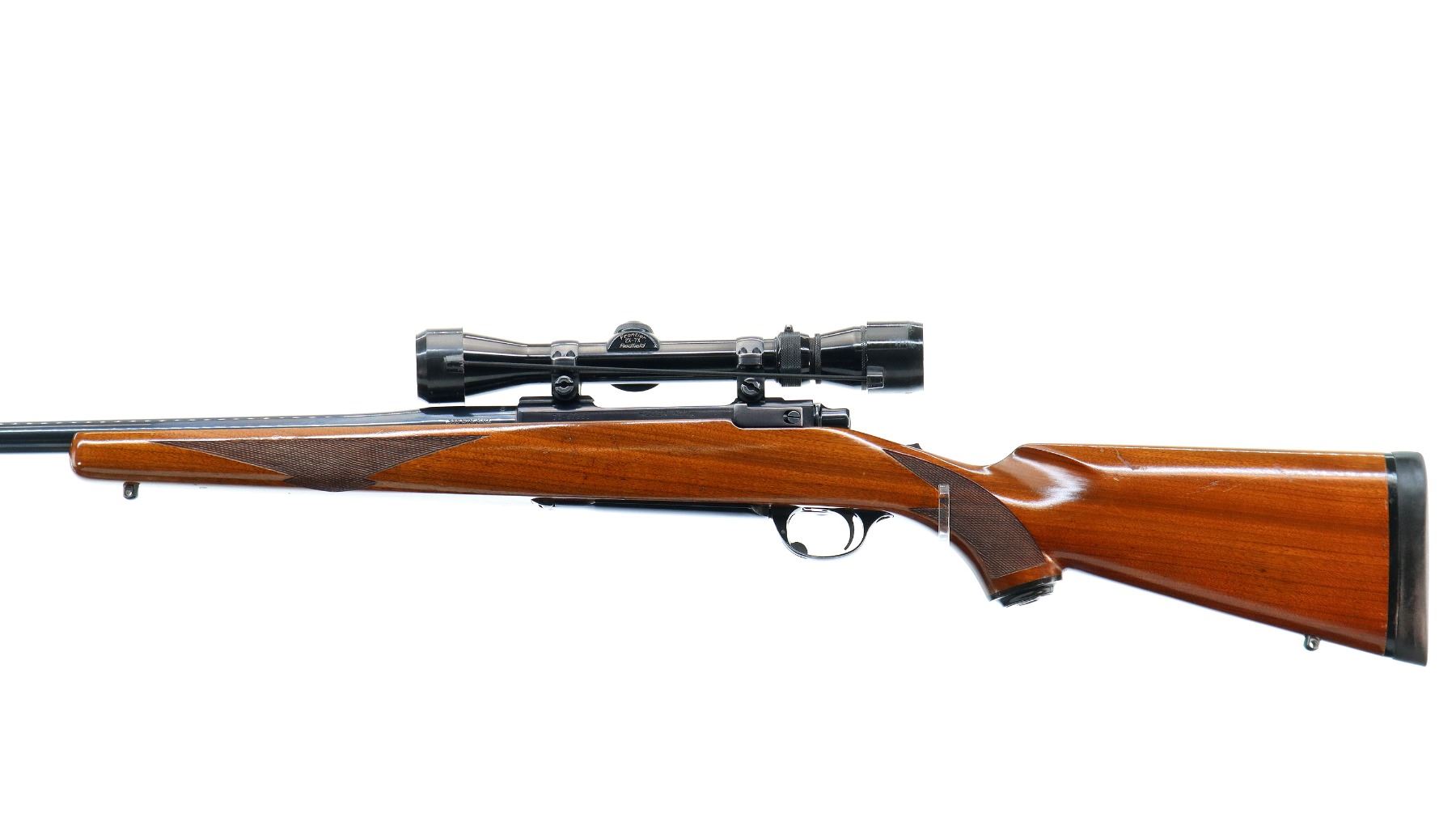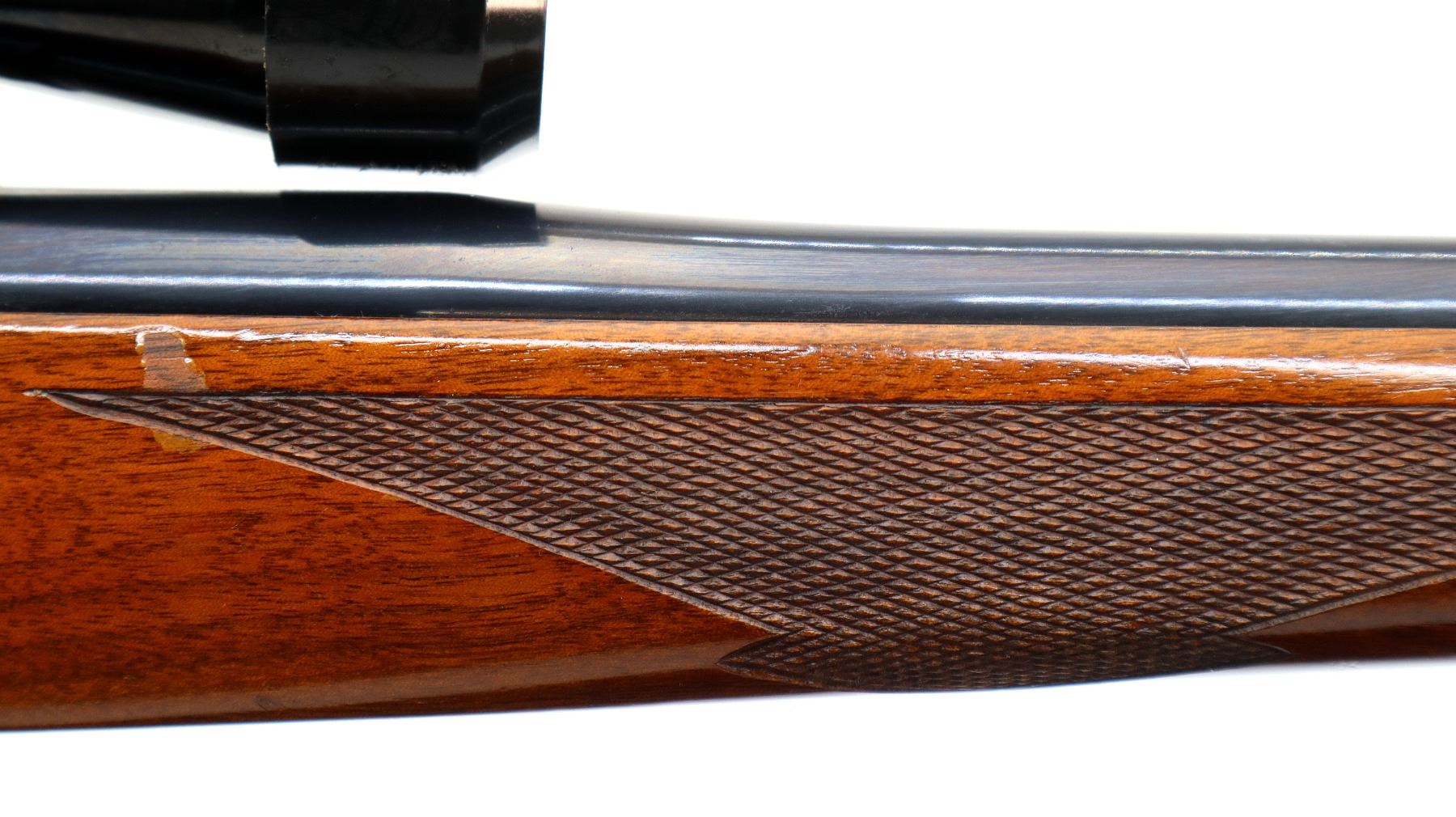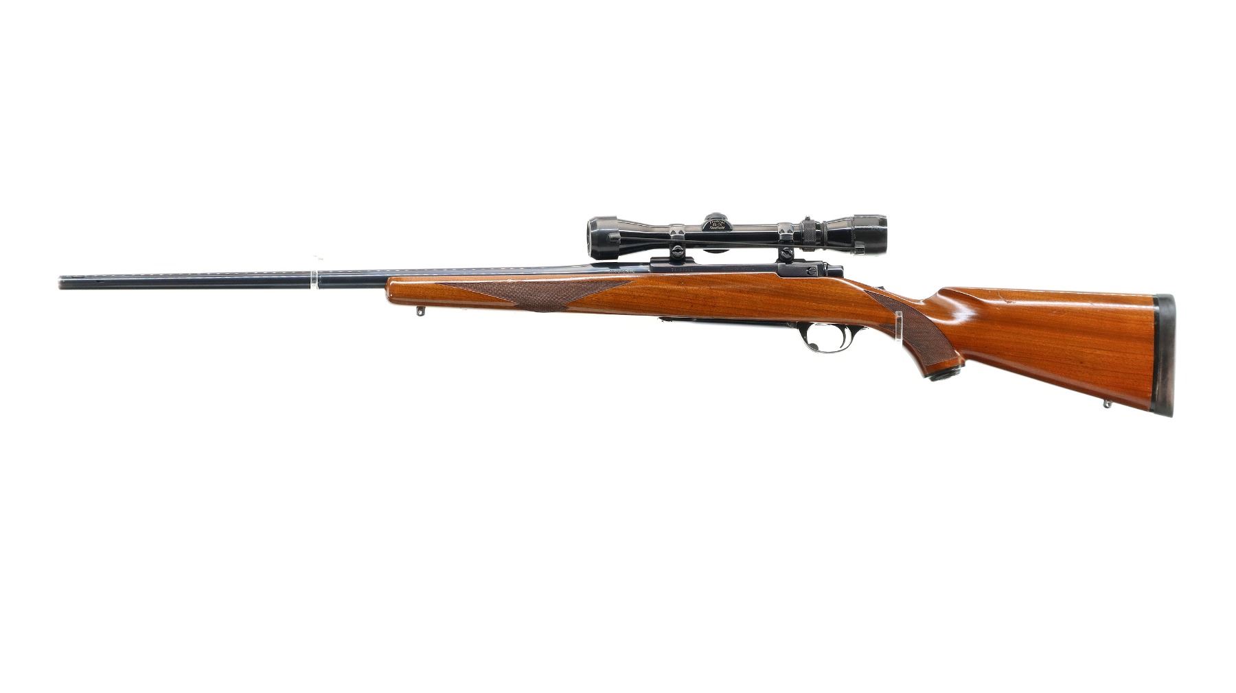 Main Description: No sights, polish blued finish, Magna Ported barrel, receiver has integral scope bases, factory rings with Redfield Frontier 2-7x32 scope installed, clear optics with duplex crosshair. Tang safety. One piece gloss finish wood stock, checkered forearm and pistol grip, black rubber recoil pad, 13.25" LOP, grip cap, hinged floor plate, swivel studs.