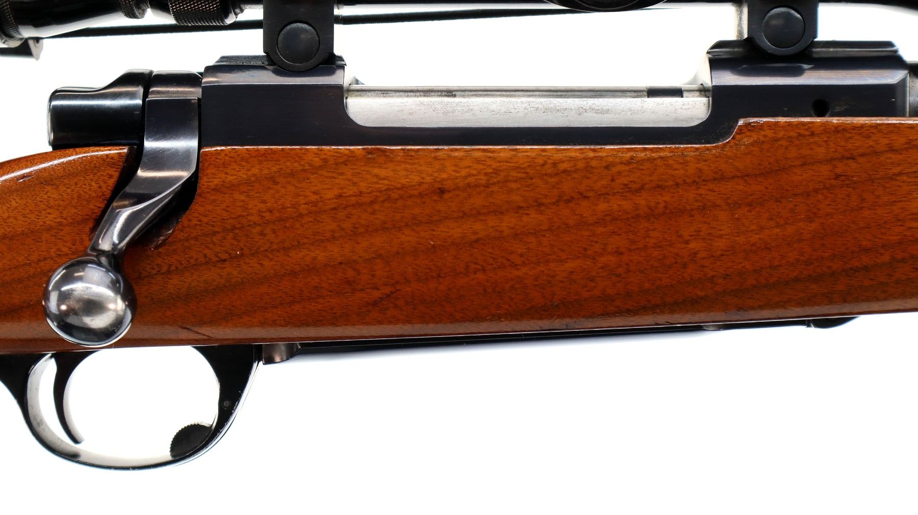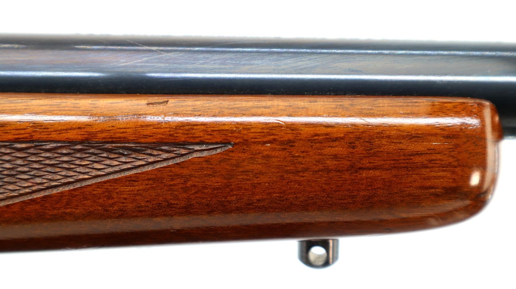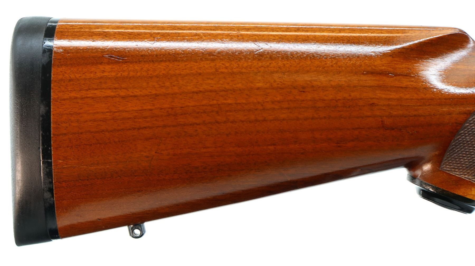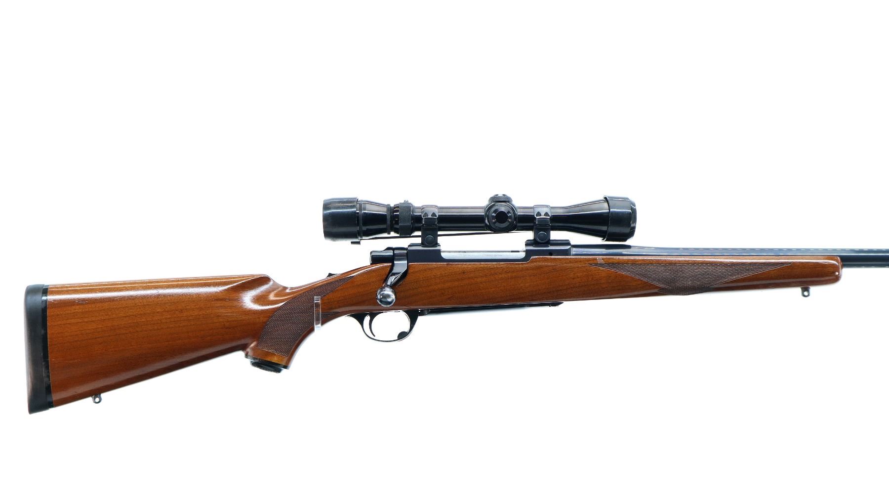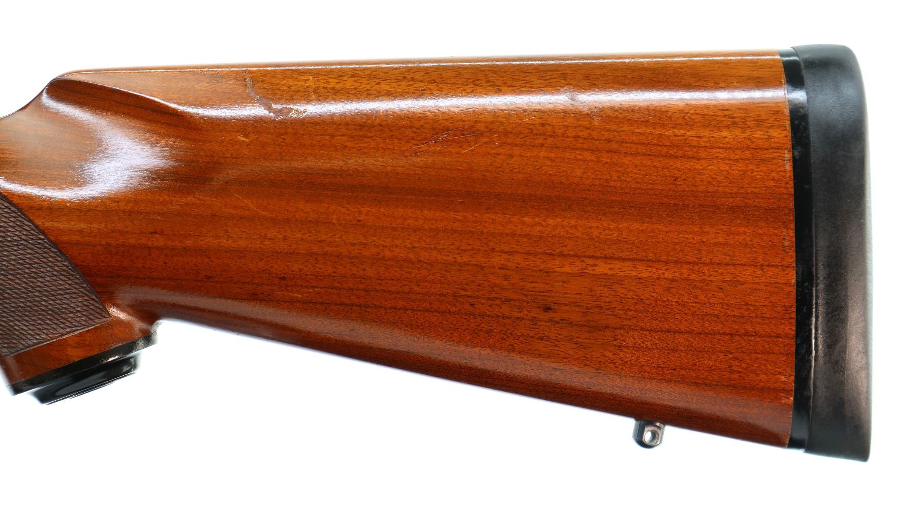 Main Description: No sights, polish blued finish, Magna Ported barrel, receiver has integral scope bases, factory rings with Redfield Frontier 2-7x32 scope installed, clear optics with duplex crosshair. Tang safety. One piece gloss finish wood stock, checkered forearm and pistol grip, black rubber recoil pad, 13.25" LOP, grip cap, hinged floor plate, swivel studs.