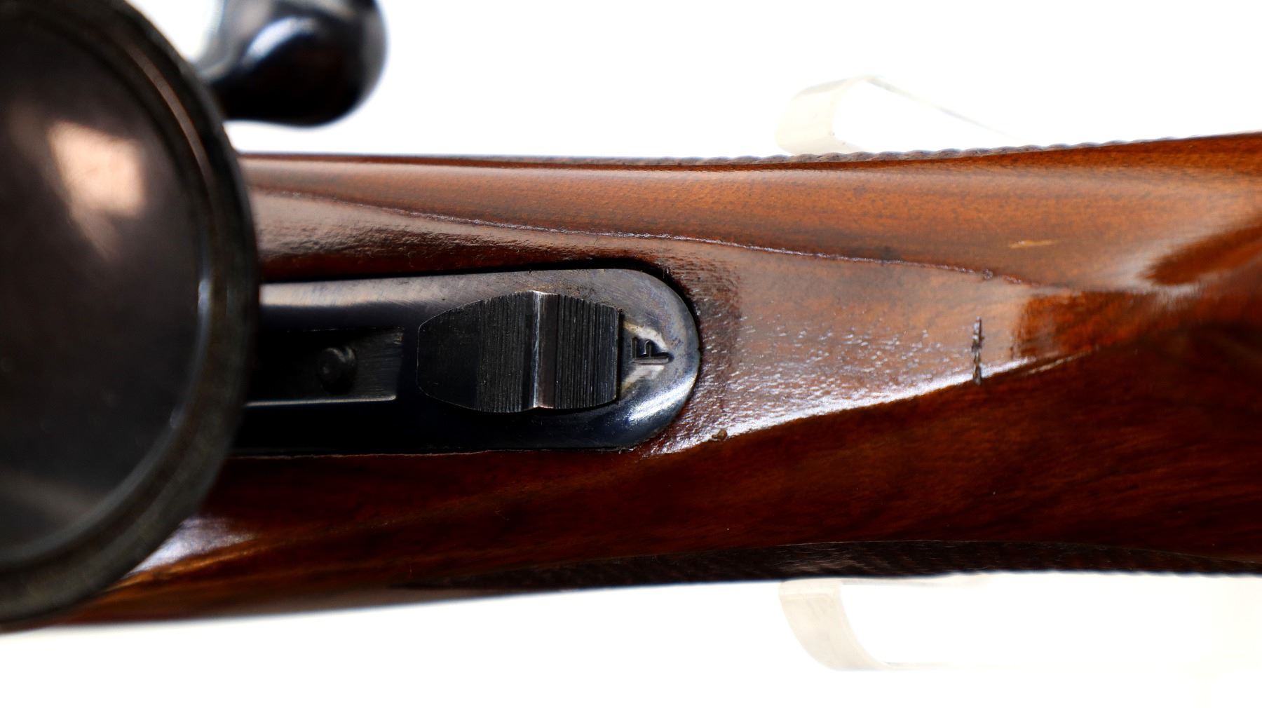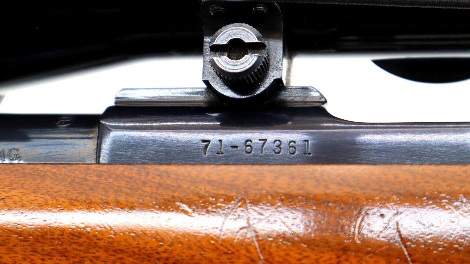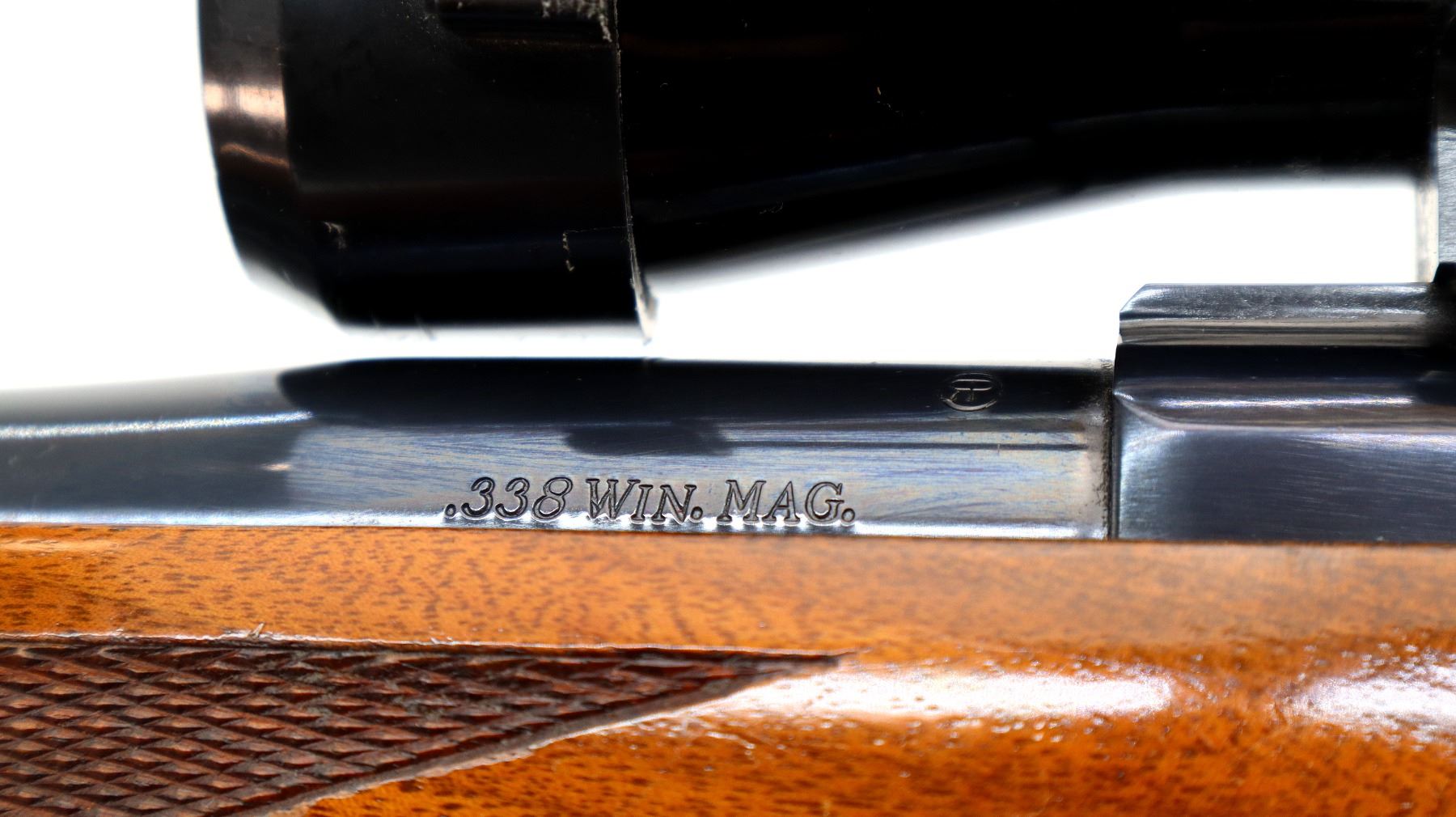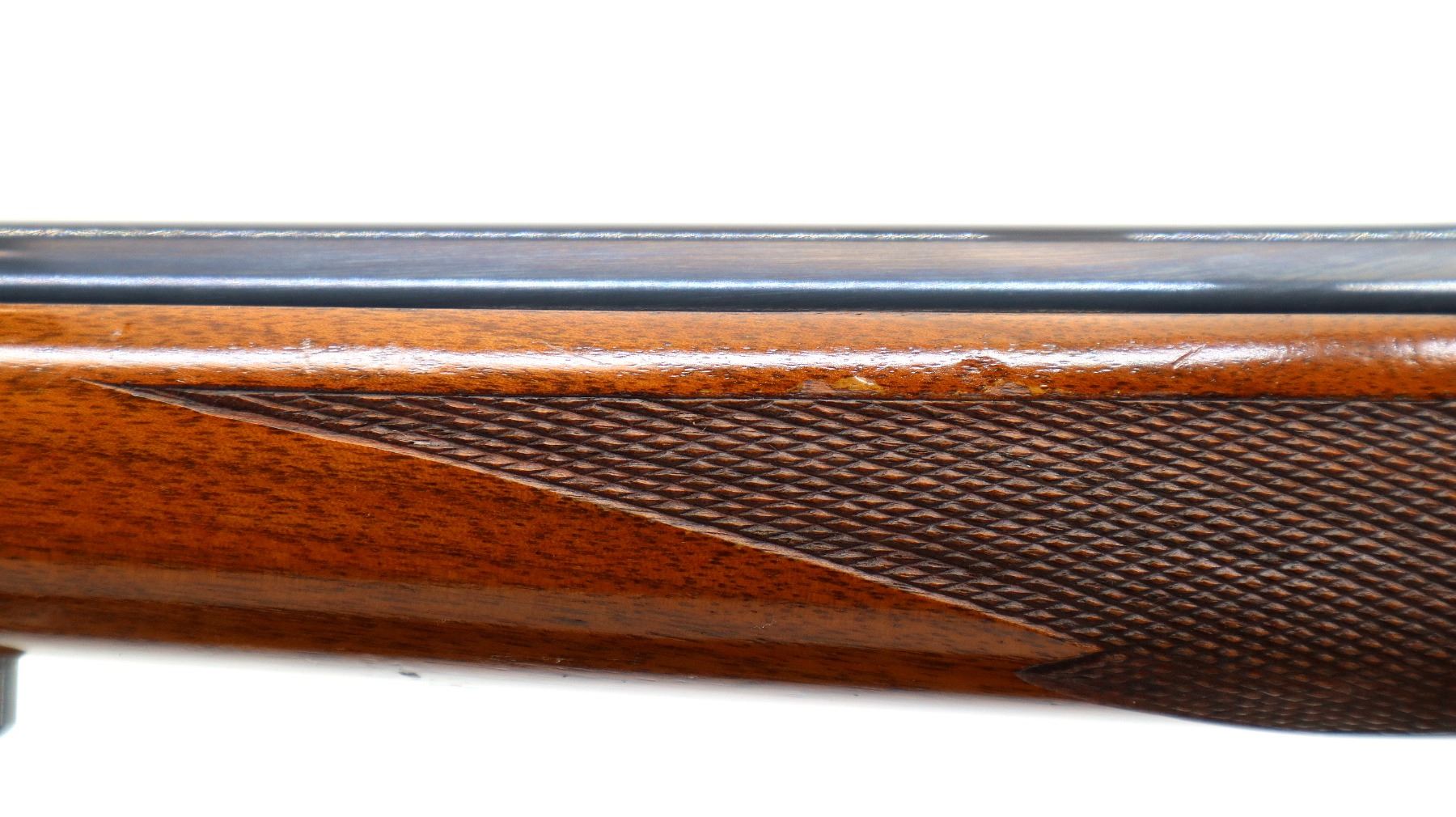 Main Description: No sights, polish blued finish, Magna Ported barrel, receiver has integral scope bases, factory rings with Redfield Frontier 2-7x32 scope installed, clear optics with duplex crosshair. Tang safety. One piece gloss finish wood stock, checkered forearm and pistol grip, black rubber recoil pad, 13.25" LOP, grip cap, hinged floor plate, swivel studs.