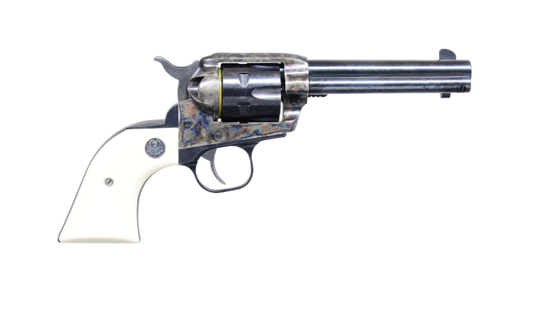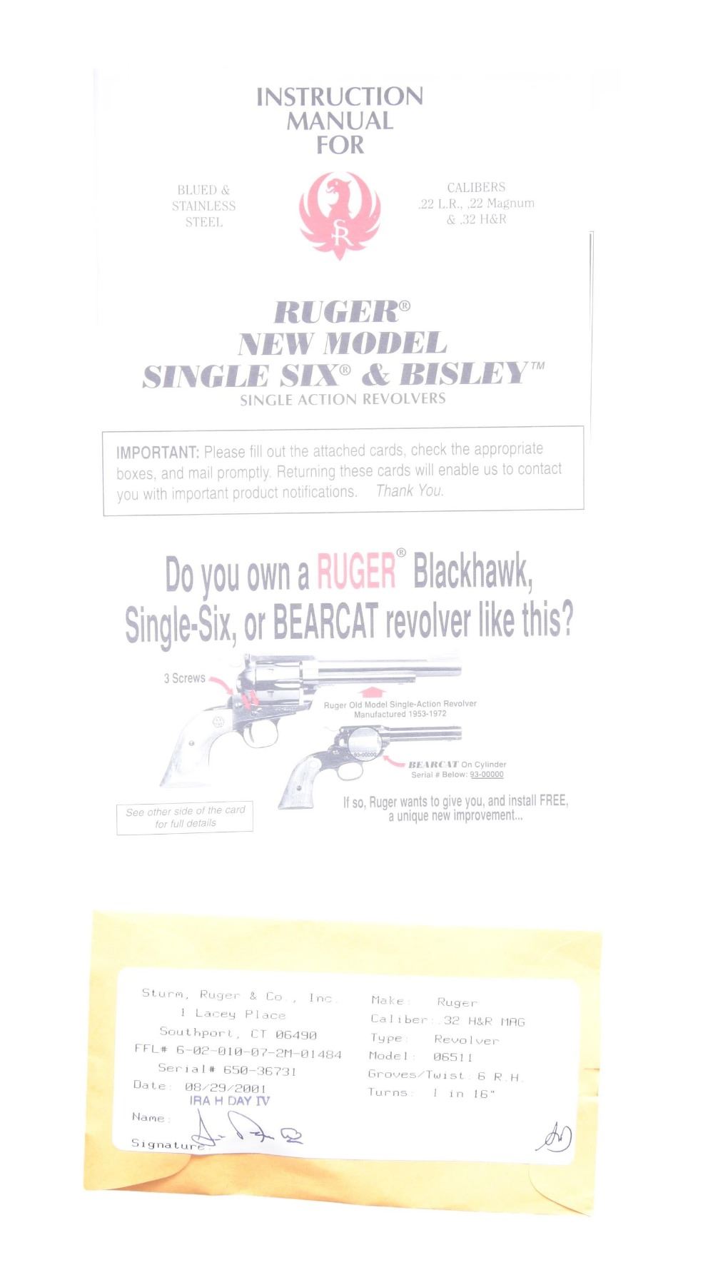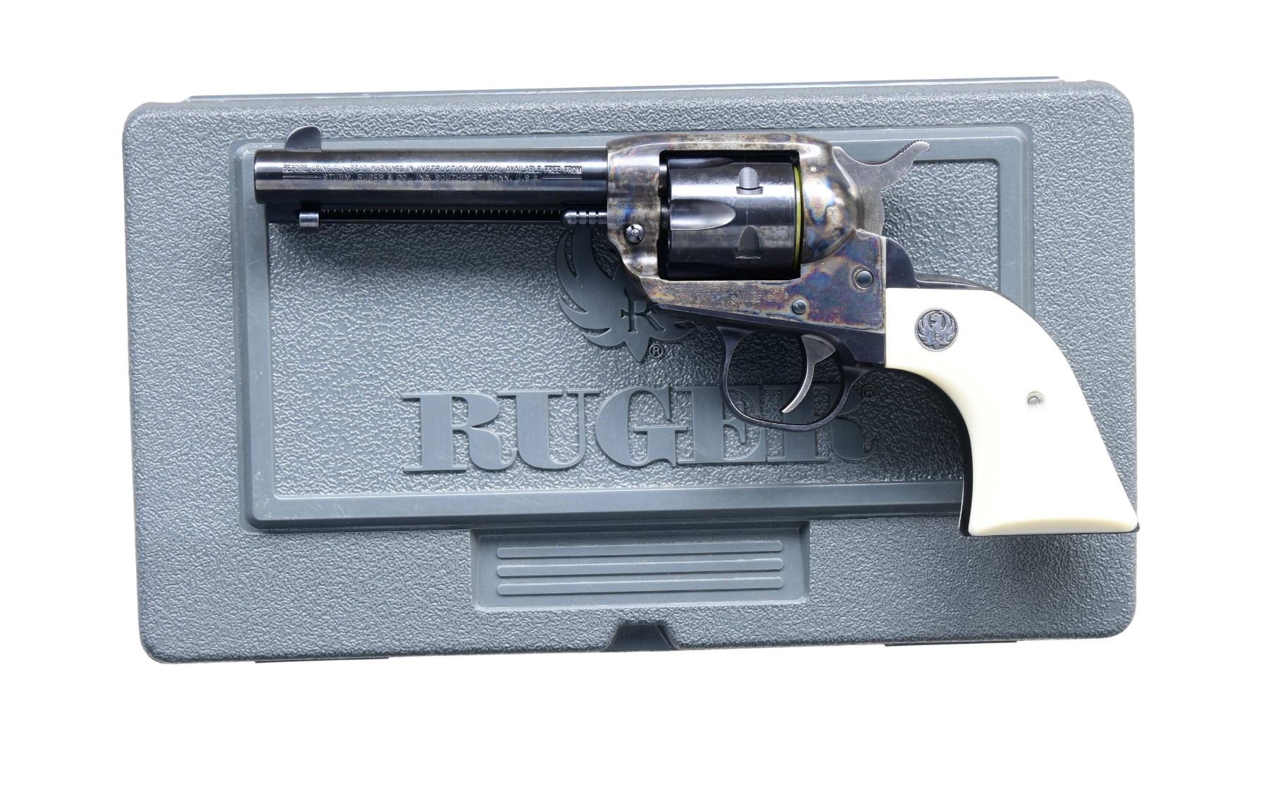 WITH MATCHING FACTORY BOX. CAL. 32 H&R MAG. S# 650-36731. Mfg. 2001 as Model 06511 & Catalog No. SSM-4F-S-I. Barrel measures 4 5/8" w/ fixed sights. Blued finish with a case-hardened short grip frame. Fluted 6 shot cyl. White plastic grip panels with a Ruger medallion. UNATTACHED ACCESSORIES: Factory box, instruction manual, and test cartridge. CONDITION: Near excellent overall w/ bright bore. (24-2968/MD). MODERN. $400-$600.