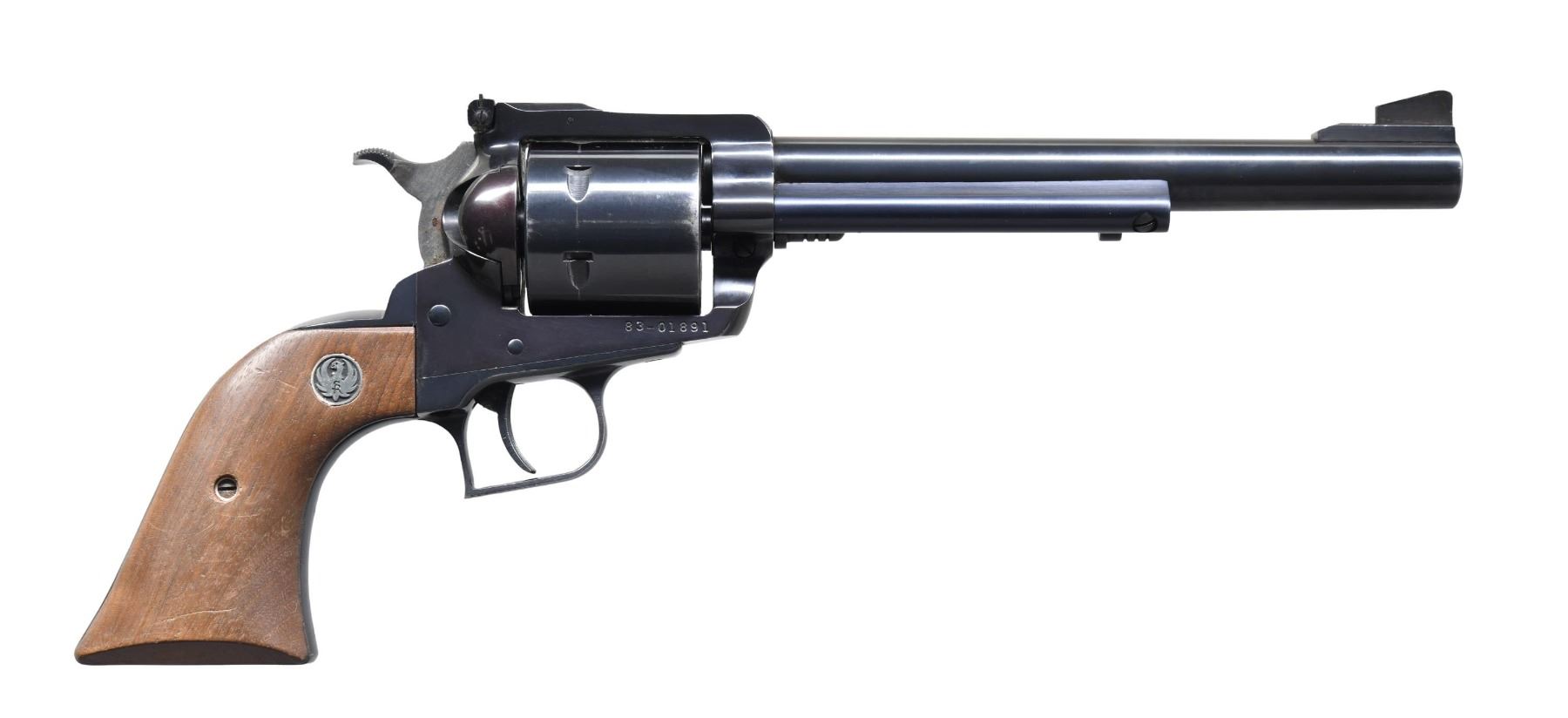 Cal. 44 Mag. S# 83-01891. Bbl. 7 1/2" with ramped base having serrated blade; frame mounted factory adjustable rear. Mfg. 1979 (1973 to date) with blued finish plus unfluted 6rd. cylinder and oiled walnut grips having silver eagle medallions. Blued steel to include Dragoon style grip frame; alloy ejector housing. UNATTACHED ACCESSORIES: near excellent black nylon Uncle Mike's Sidekick holster; size 4. CONDITION: good to very good overall with wear marks on grips and high edge finish wear. Near excellent bore. (25-3425/NW). MODERN. $250-400.