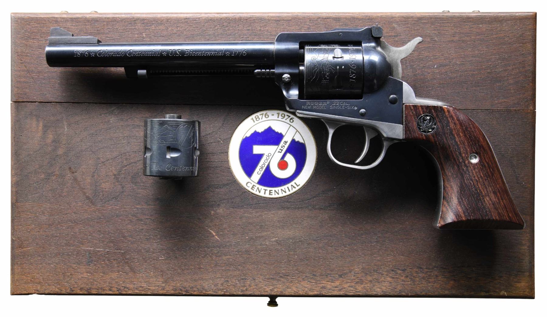 Cal. 22 LR / 22 Mag. S# 76-03707. Bbl. 6 1/2" with screw attached serrated blade on ramped base front sight; frame mounted factory adjustable rear. Mfg. 1976 (1973 to date for all NM Single-Sixes) with Colorado Centennial and US Bicentennial barrel markings; no "warning marks" (initiated late 1977 to early 1978). Blued with stainless grip frame having Colorado Centennial markings on its butt. Matching numbered, unfluted 6 rd. cylinder with Colorado Centennial markings. Rosewood grips and alloy ejector housing. UNATTACHED ACCESSORIES: matching numbered 22 Mag. cylinder with identical appearance to LR cylinder. Fitted presentation case with porcelain medallion on lid and gold markings on blue satin interior of lid; outlined blue velvet base. Interior is near excellent; exterior has crack on lid caused by separation of glued segments. CONDITION: near excellent overall but has been fired with slight residue in frame plus faint cylinder turn line (same for extra cylinder). Near excellent bore and grips. (25-3201/NW). MODERN. $300-450.