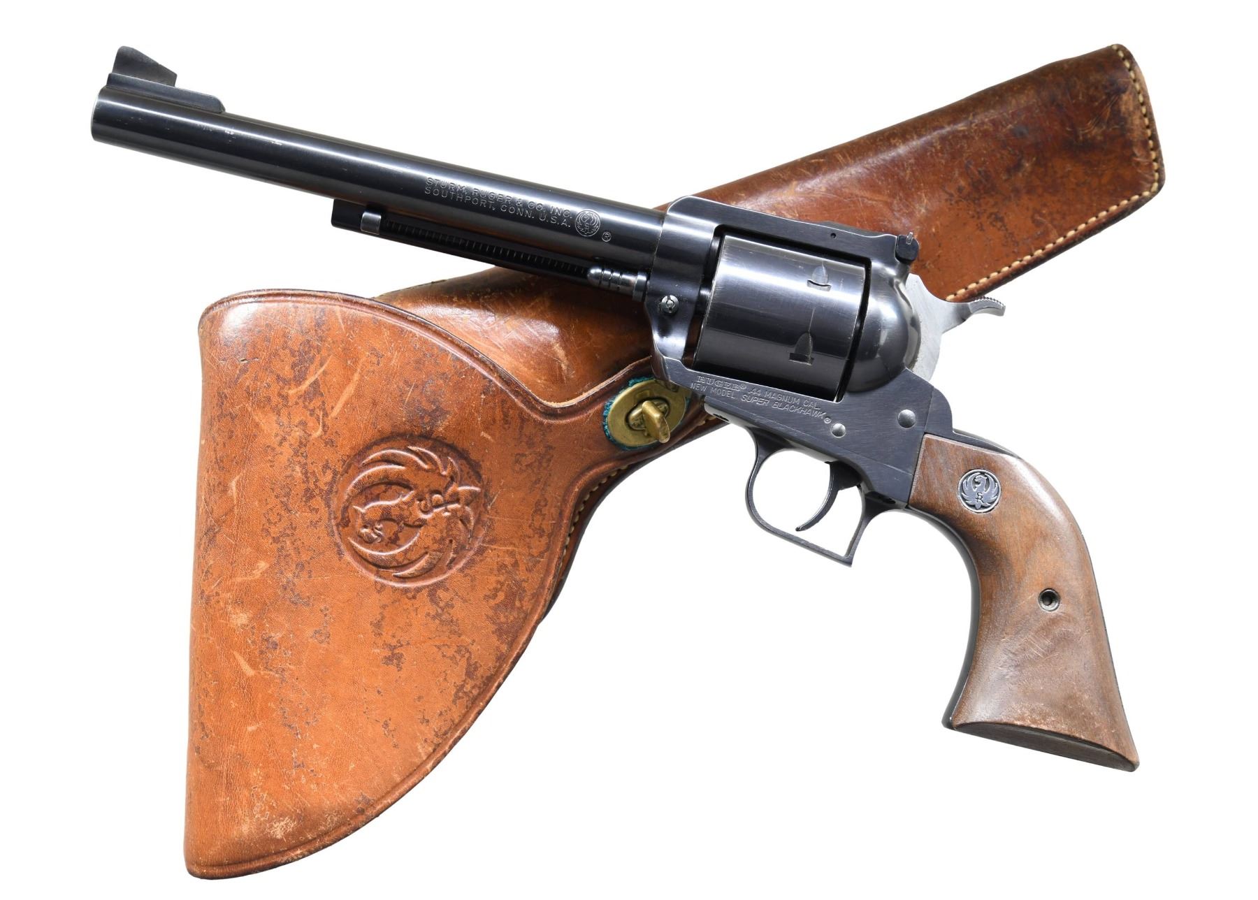 HOLSTER. Cal. 44 Mag. S# 82-18947. Bbl. 7 1/2" with ramped base having serrated blade; frame mounted white outlined factory adjustable rear. Mfg. 1977 (1973 to date) without "warning marks" (initiated late 1977 to early 1978). Blued finish with unfluted 6rd. cylinder and oiled walnut grips having silver eagle medallions. All steel to include Dragoon style grip frame except alloy ejector housing. UNATTACHED ACCESSORIES: factory flap holster made by Bianchi with Super Blackhawk size marking. Numerous stains and scuffs plus verdigris on brass fittings but no damage. Would benefit from good leather treatment and cleaning. CONDITION: very good overall with light handling marks and faint cylinder turn line. Near excellent bore. (25-3189/NW). MODERN. $350-500.