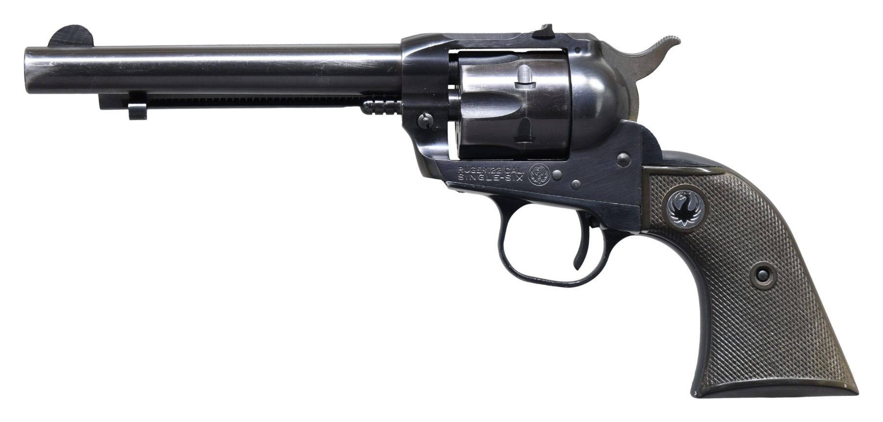 Cal. 22 LR. S# 144796. Bbl. 5 1/2" with serrated blade front sight; fame mounted windage drift adjustable rear sight. Full slotted steel ejector housing having flat faced ejector rod head. Proper XR3 alloy grip frame with checkered hard rubber grips having black eagle medallions. Has not had factory safety recall performed; original lockwork. Later thick trigger, drilled through base pin latch and base pin having wide bands. CONDITION: very good overall with holster-like high point wear, light cylinder turn line, marks on bottom of triggerguard and thinning near muzzle. Very minimal hand wear on grips. Near excellent bore. Timing off; overcome on 4 chambers by full hammer pull but still off on 2 (should be corrected before using). PROVENANCE: From the Estate of Jon Thomas, Gunsport, LTD. (25-1131/NW). CURIO. $250-400.