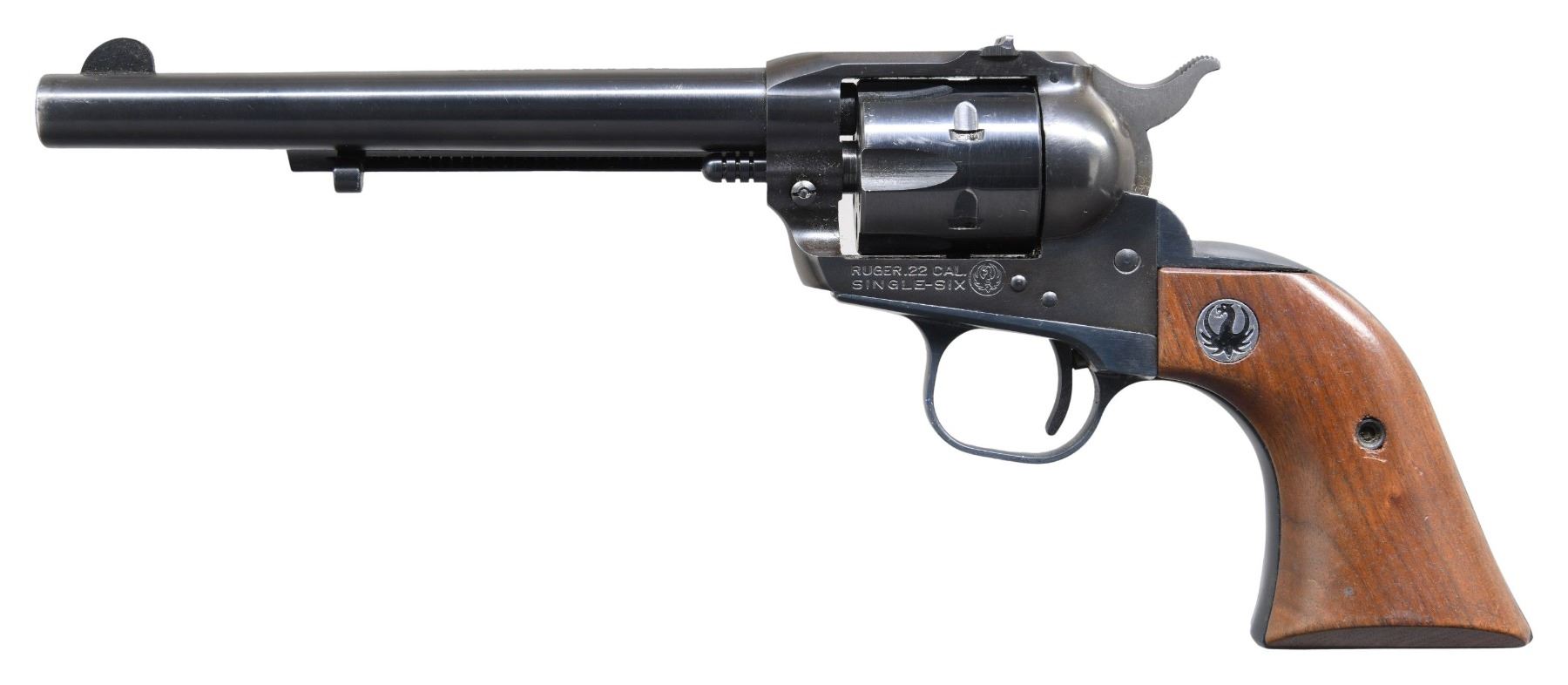 Cal. 22 LR. S# 454703. Bbl. 6 1/2" with serrated blade front sight; frame mounted rear sight is drift adjustable for windage. Mfg. 1966 (1961-1973) with smooth walnut grips having black eagle medallions. Has not had Ruger safety update recall done; original Old Model parts. Matching numbered 22 LR cylinder; missing 22 Mag. cylinder. CONDITION: all aspects near excellent including bore and grips; original finish with no visible flaws other than it is missing its 22 Mag. cylinder. True, top collector quality. (25-1567/NW). CURIO. $300-450.