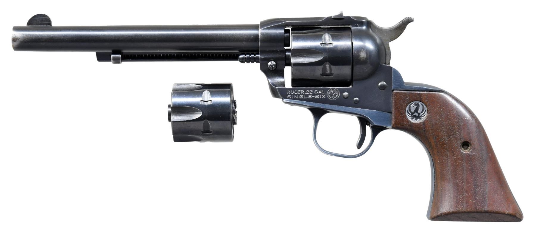 Cal. 22 LR. / 22 Mag. S# 20-03865. Bbl. 6 1/2" with serrated 1/2 moon blade front sight; frame mounted drift adjustable rear. Mfg. 1969 (1961-1973) using XR3-RED alloy grip frame having oiled walnut grips with black eagle medallions plus alloy ejector housing. Original lockwork without factory safety update. Matching numbered 22LR cylinder. UNATTACHED ACCESSORIES: 22 Mag. cylinder numbered 267 with very good appearance around body with no turn line; wear marks on each end to include wear on front caused by contact with breech end of barrel due to incorrect fitment. Poor red felt cylinder bag. CONDITION: good general appearance with notable signs of use and high edge wear plus thinning on grip frame. Ejector housing retained with incorrect style screw. Spots of peppery oxidation on cylinder and at muzzle. Light handling marks on grips. Near excellent bore. (25-3250/NW). CURIO. $200-300.