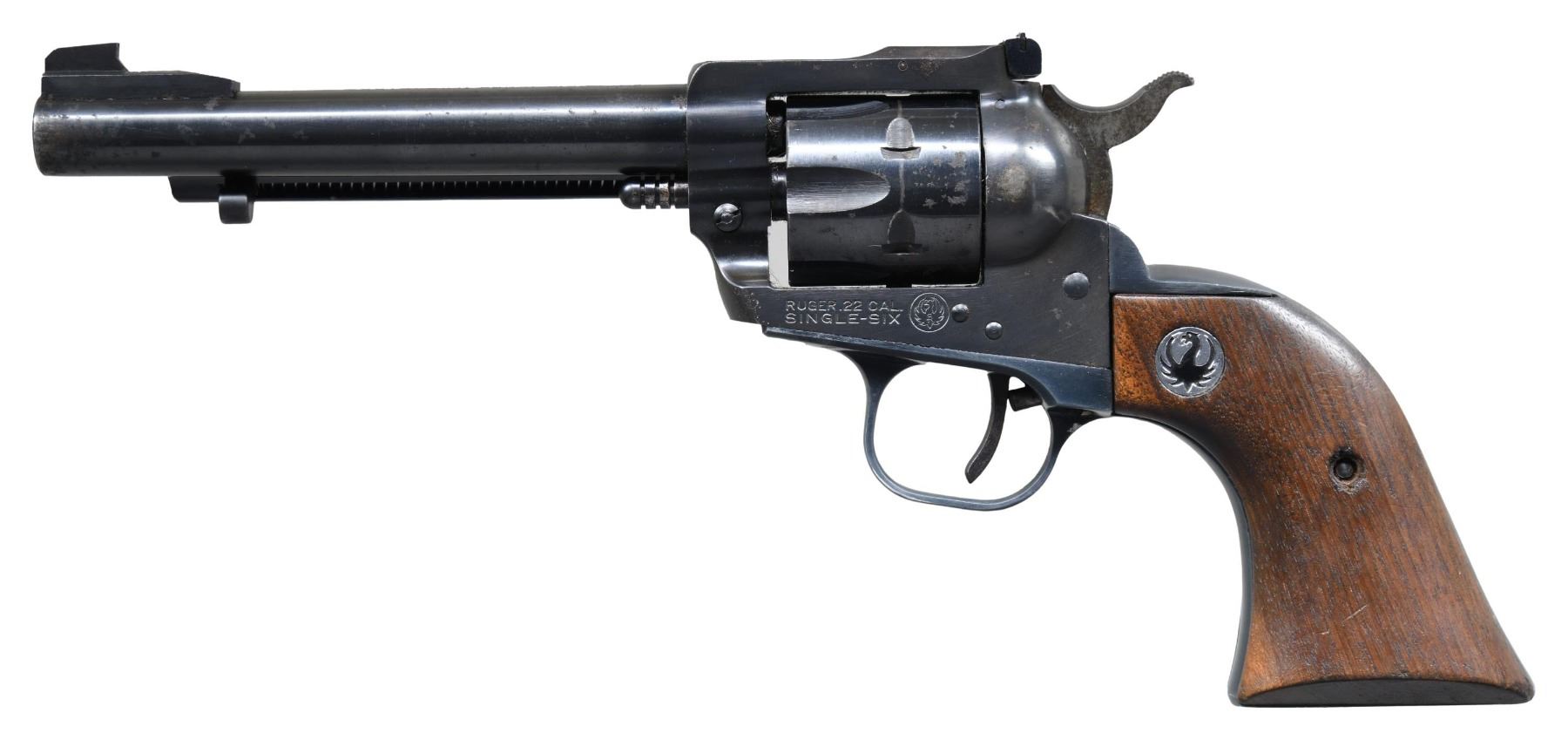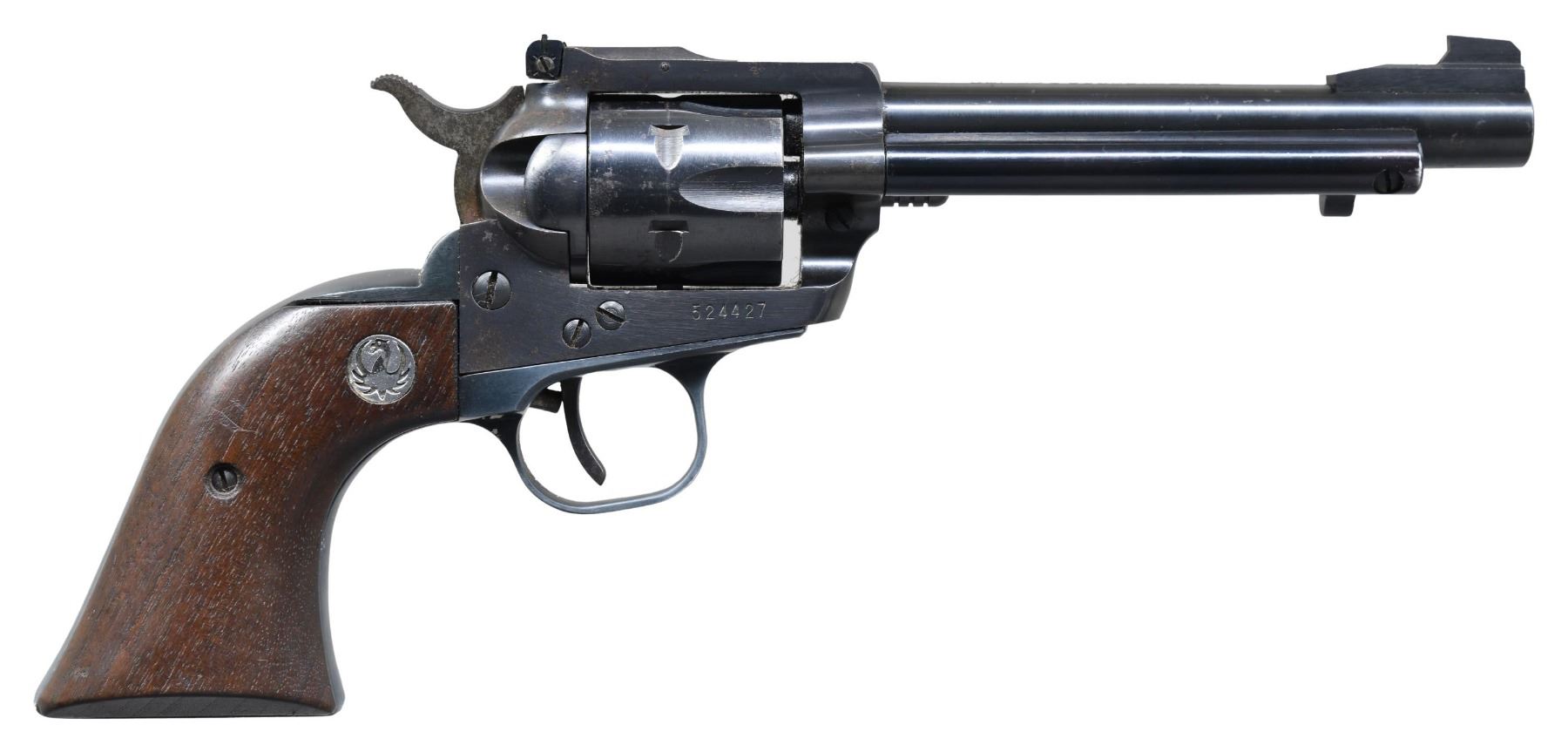 Cal. 22 LR. 524427. S# 524427. Bbl. 5 1/2" with screw attached ramped base having Patridge blade; factory frame mounted adjustable rear sight. Mfg. 1966 (1964-1972) as convertible (missing 22 Mag. cylinder) with XR3-RED alloy grip frame having smooth oiled walnut grips (black eagle medallions). Retains original lockwork; has not had factory safety update performed. Black anodized alloy ejector housing. Matching numbered 22 LR cylinder. CONDITION: generally good finish with scattered light to medium oxidation along with some slight high point wear. Good grips with light handling marks and mild hand wear. Near excellent bore. (25-1574/NW). CURIO. $300-500.