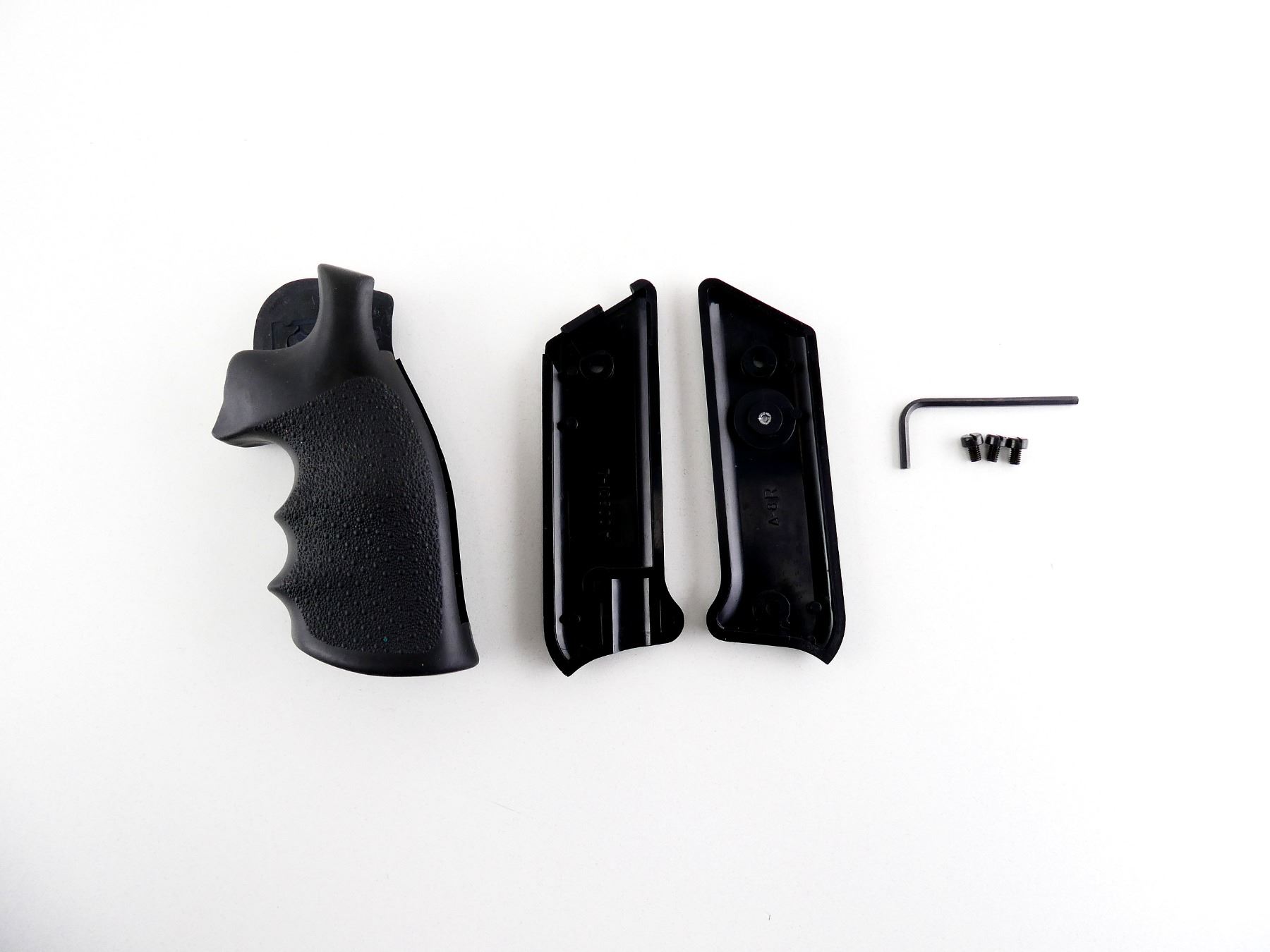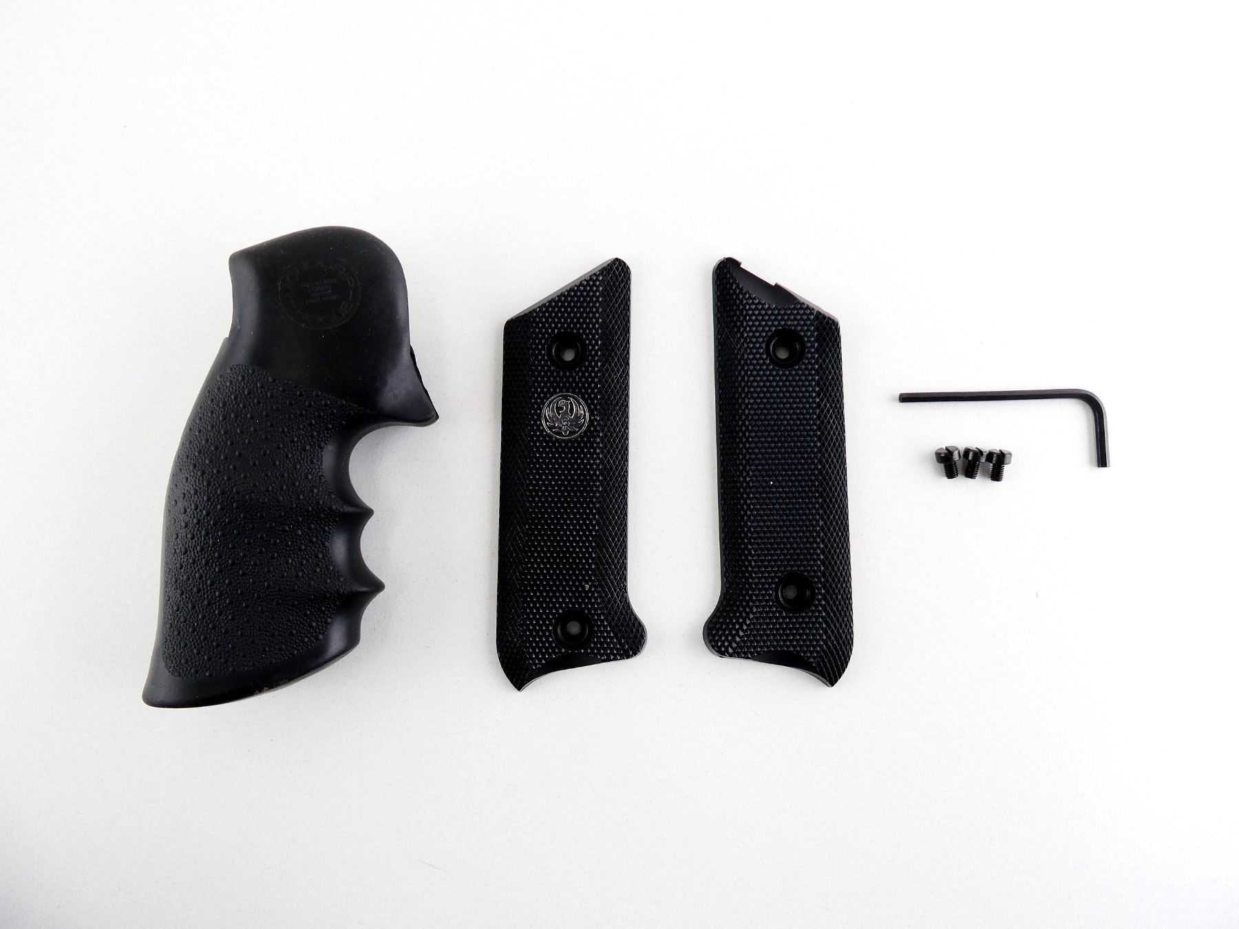 LOT INCLUDES; (1) HOGUE MONO GRIP, BLACK RUBBER & (1) SET RUGER BLACK POLYMER GRIPS WITH SCREW. MAY REQUIRE FITTING. SEE PHOTOS.