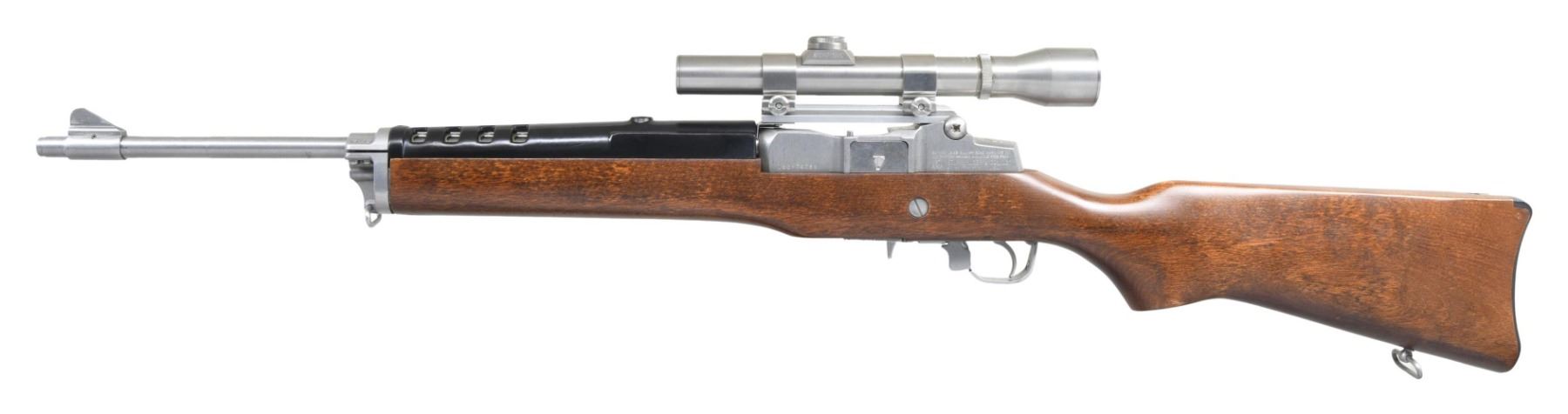 Cal. 223 Rem. S# 183-74082. Bbl. 18 1/2" with banded blade front sight. Mfg. 1983 (1974 to date) as stainless model with sling swivels and black fiberglass handguard. Walnut stained birch carbine stock having black Celcon carbine buttplate. Rear sight removed and replaced with silver colored Weaver No-Drill scope mount holding stainless Weaver K4-S duplex reticle scope; Weaver is the only company to make a true stainless scope; all others are brushed aluminum. MAGS: 1 factory 5 rd. CONDITION: very good to excellent appearance with a couple of light stock marks. Metal finish and bore are near excellent. Exterior of scope is near excellent but optics are slightly cloudy (useable) due to residue on interior side of front lens. (25-3314/NW). MODERN. $500-750.