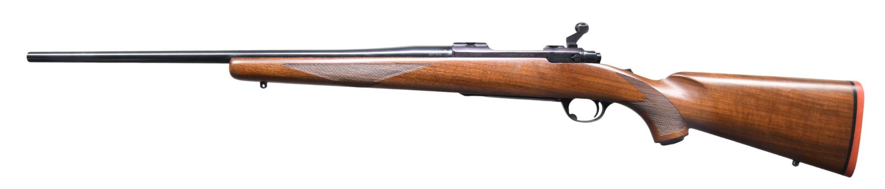 Cal. 243 Win. S# 70-50292. Bbl. 22" sporter weight without "warning" marks (initiated 1977). Mfg. 1972 (1968-1992) with tang safety, flat bolt handle and claw extractor for controlled round feeding. Checkered walnut stock with grip cap, sling studs and red butt pad. Receiver factory machined for Ruger scope rings. Black anodized alloy hinged trigger guard; balance (including floorplate) is blued steel with body of bolt and extractor in-the-white. CONDITION: all aspects are near excellent including bore; appears new and unfired. (24-3125/NW). MODERN. $500-750.