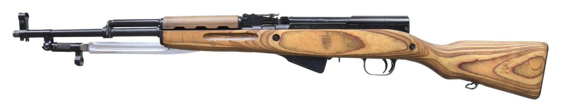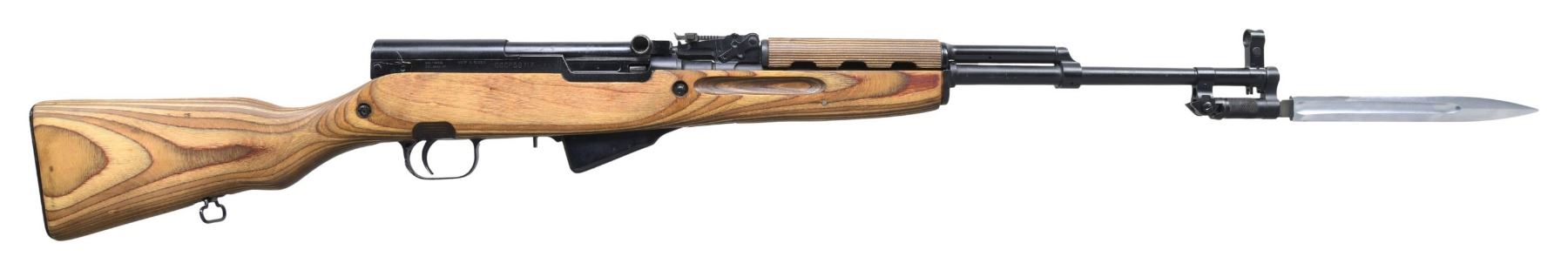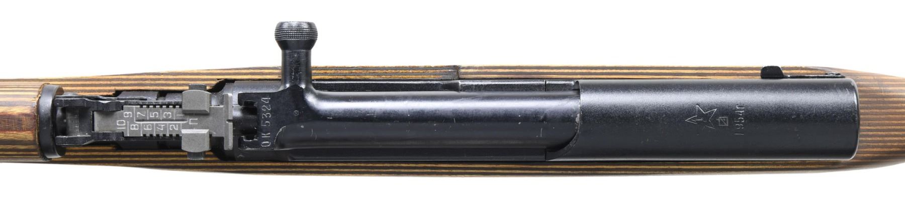 Cal. 7.62x39. S# CCCP58717. Import marked on right side of receiver. Bbl. 20 1/2". Rifle is marked w/ original serial number "OK5324" on receiver, bolt cover, bolt, trigger guard, buttstock & magazine. Receiver cover is marked on top w/ Tula arrow & five pointed star. Boxed overhaul mark & dated "1954r". Tangent rear sight graduated to 1,000 meters. Post front sight w/ protective hood. 9 1/2" fullered blade folding bayonet. Cleaning rod is not present. Laminated hardwood stock set. UNATTACHED ACCESSORIES: cleaning kit in butt. CONDITION: stock set has very light wear & handling marks w/ arsenal rework finish. Metal retains 90% of its arsenal rework finish w/ light wear & handling marks. Very good shiny bore. (25-2312/RW). CURIO. $400-600.