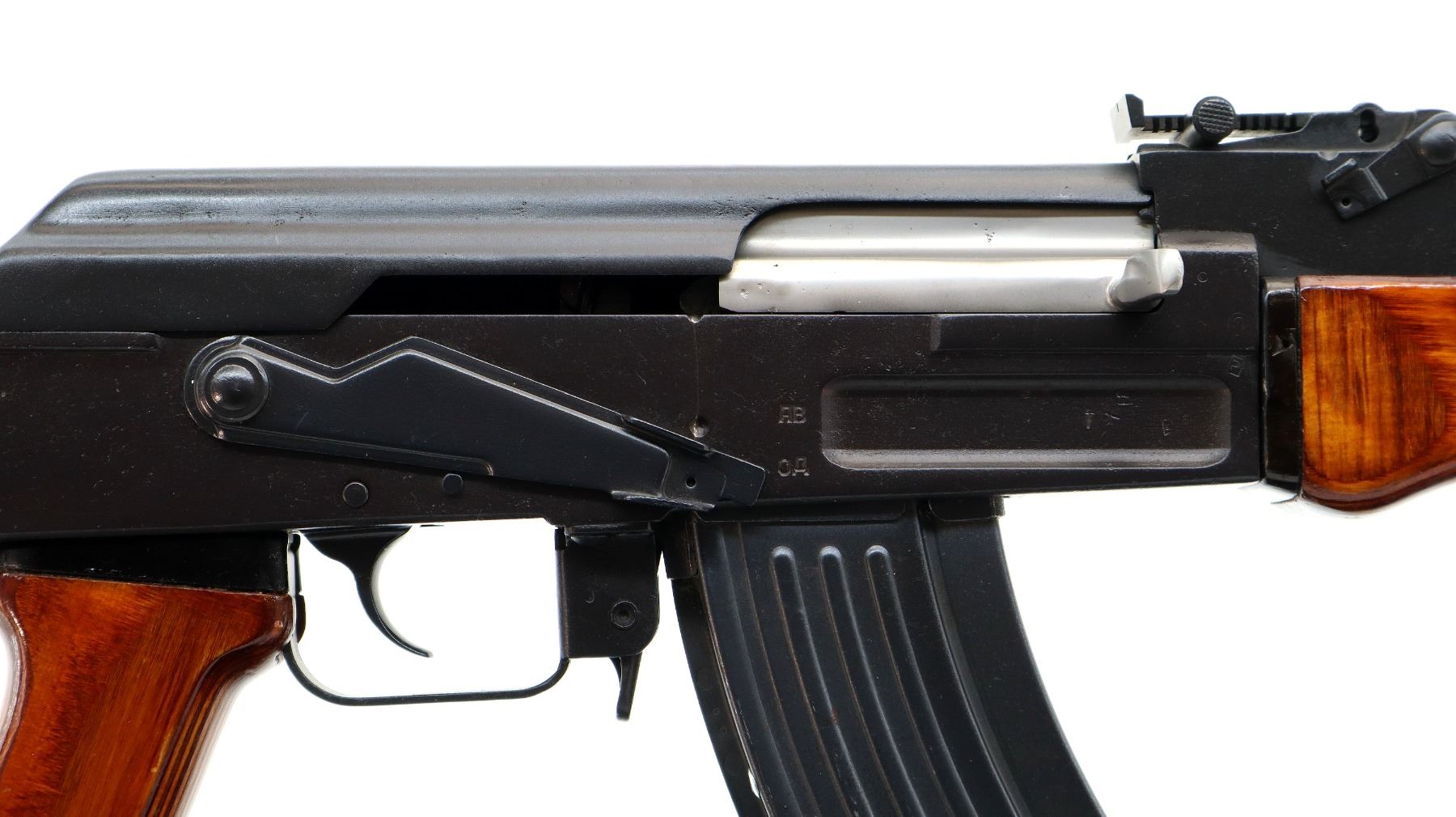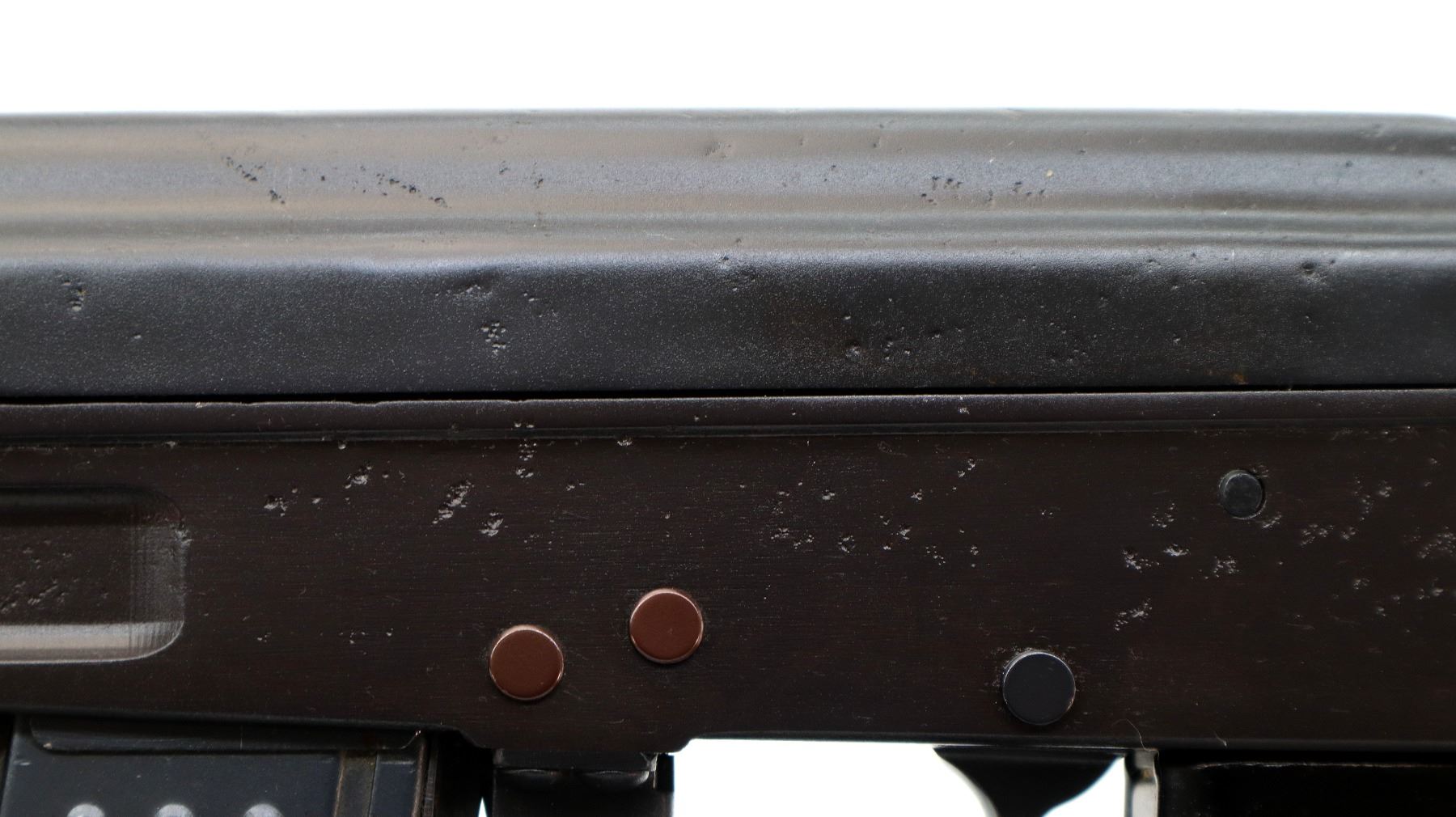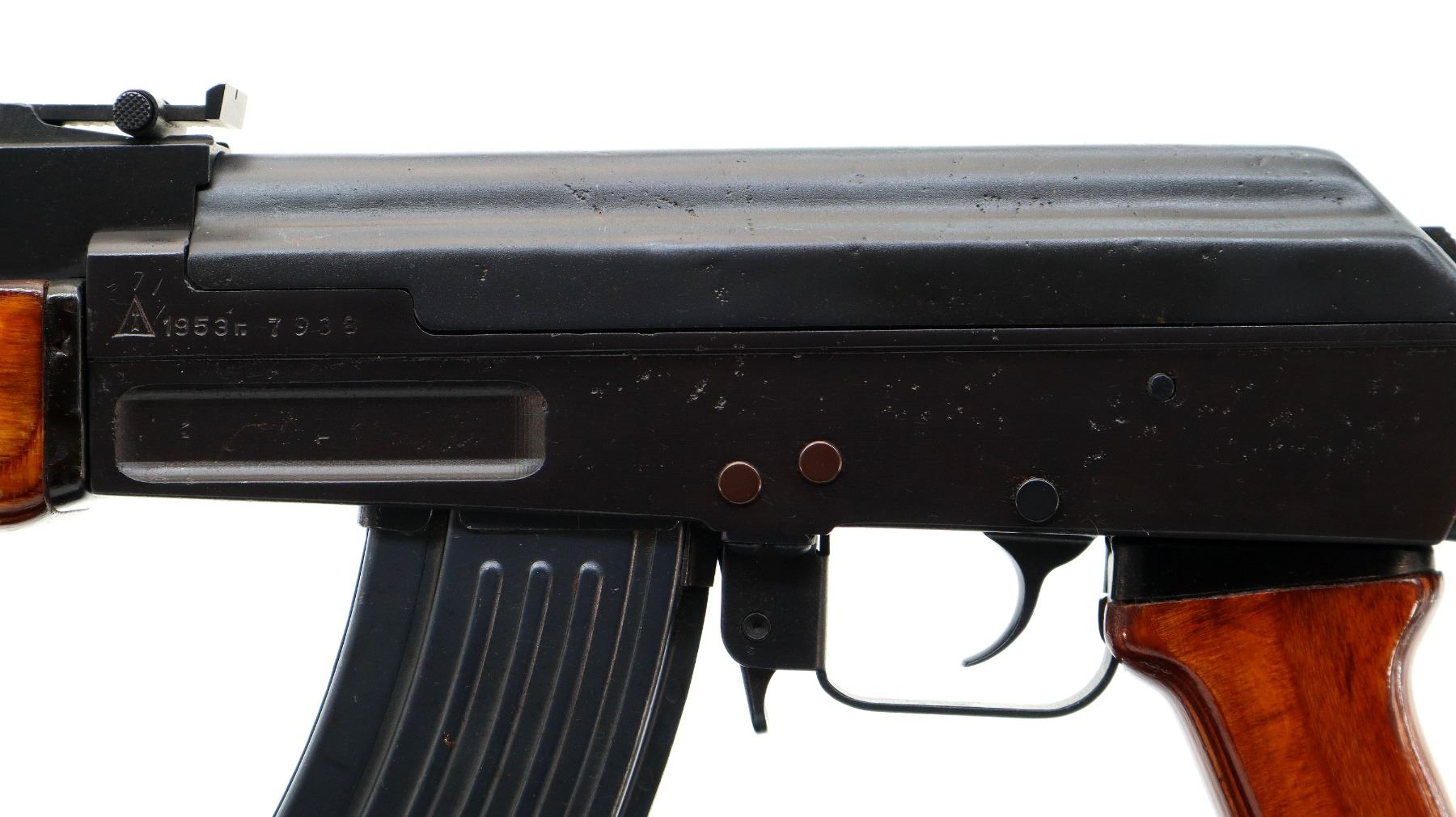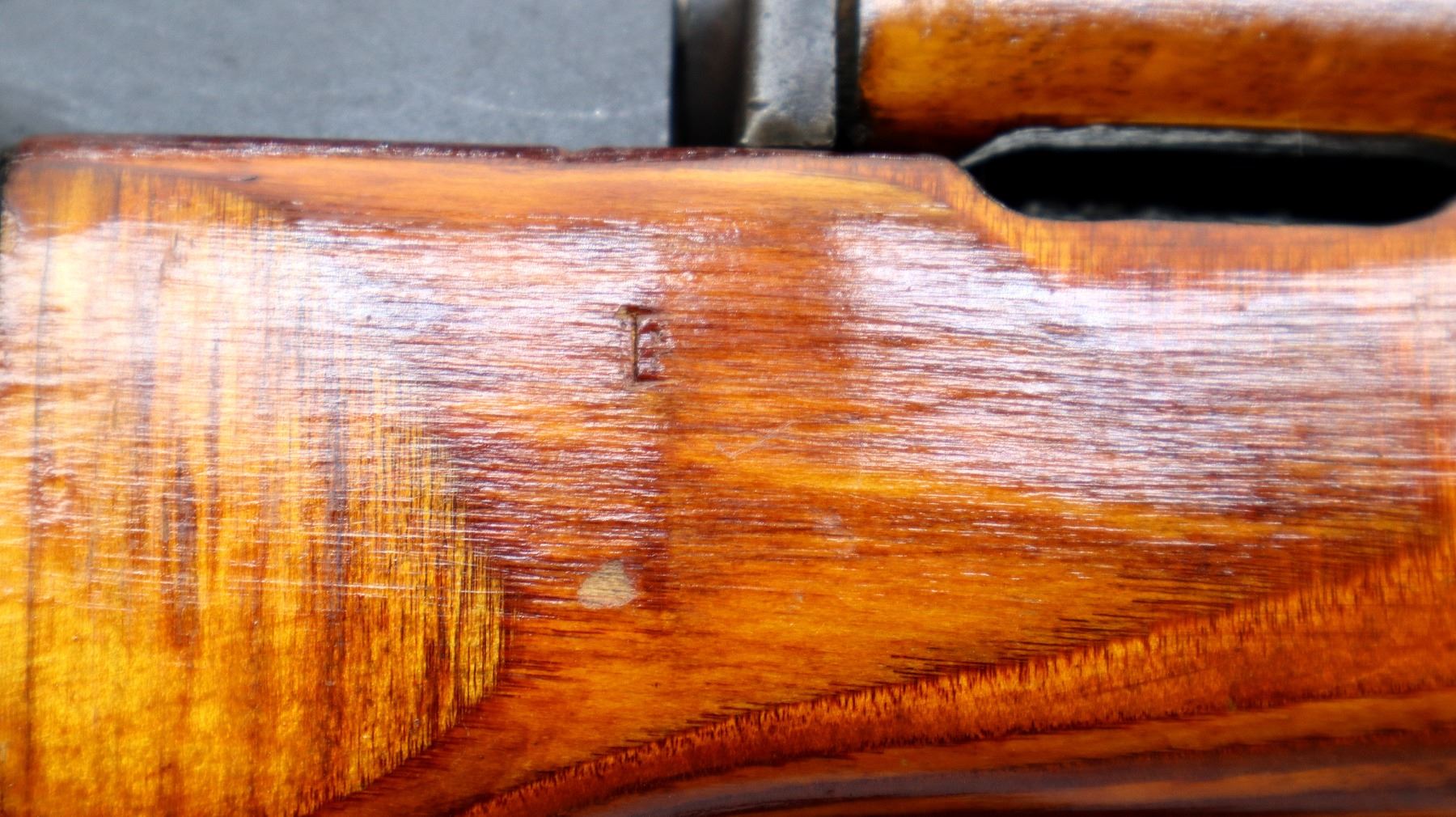 Main Description: Canadian 12-3 Prohibited, PAL with 12-3 Class Required. This item may be called in for a technical inspection, which will delay the transfer. If you don’t have this class of license and would like this item deactivated, it can be done for an additional fee of $250.00. Manufactured by Izhevsk 1953. Post front sight with hood and ramp, adjustable u notched rear sight, black painted metal finish with pitting underneath. Four piece full military wood stocks, ventilated handguards, pistol grip, smooth steel butt plate with trap, missing rear swivel holes are present, has the front sling swivel, cleaning rod and bayonet lug. Has threaded muzzle with cap.