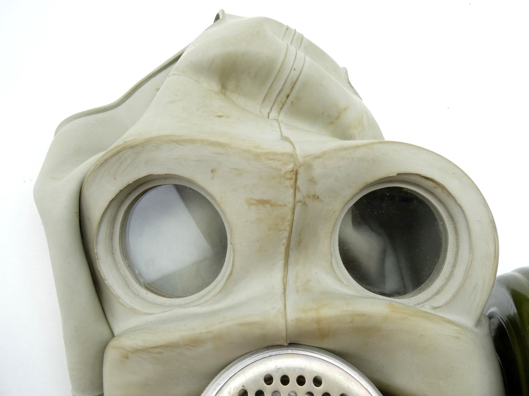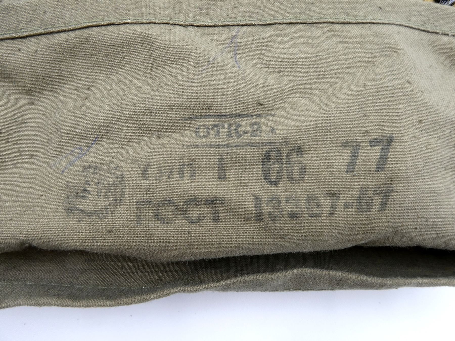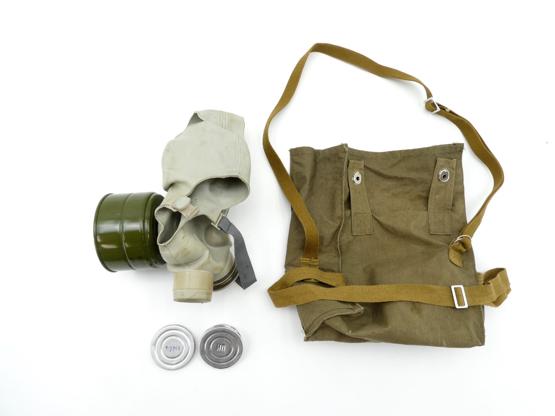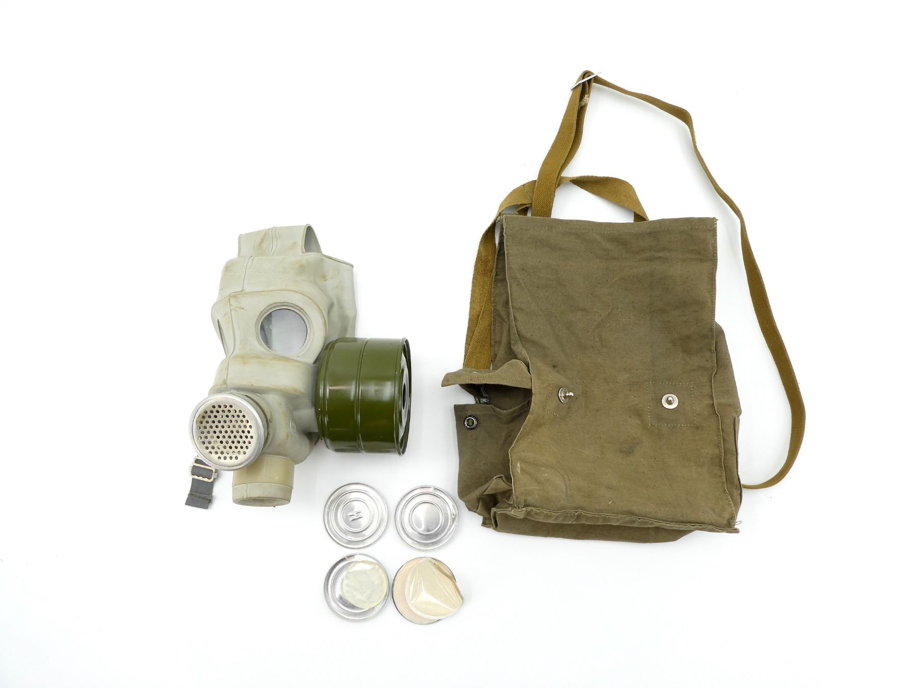 LOT INCLUDES; (1) PMG GAS MASK, GREY RUBBER MASK WITH GREEN PAINTED METAL FILTER ATTACHED, MASK MARKED: "794, C77, 2", FILTER MARKED: "EO-18K, III-77, 116-5 470", "15, C, 9", "24", CLEAR LENSES, INTACT, ADJUSTABLE HEAD STRAP, SHOWS AGE / WEAR, (1) BROWN CANVAS CARRIER BAG, MARKED: "OTK-2, ??? ? 06 77, ROCT 13367-67", TAN CANVAS SHOULDER STRAPS & (2) CIRCULAR TINS WITH SPARES LENSES, SOME LENSES ARE WARPED FROM AGE, VARIOUS MARKINGS ON TINS. SEE PHOTOS.