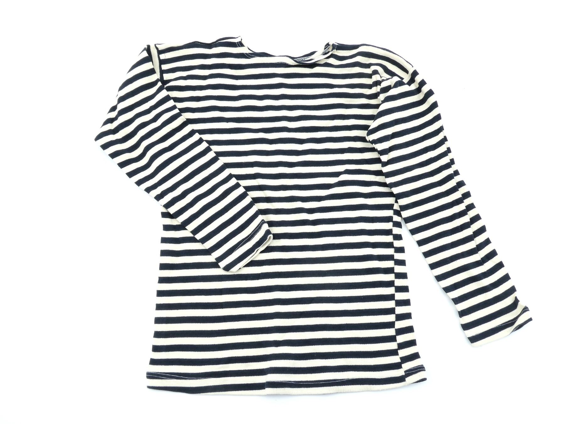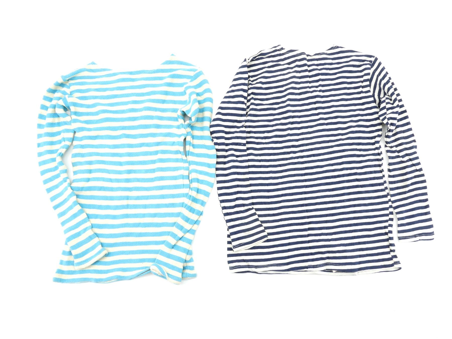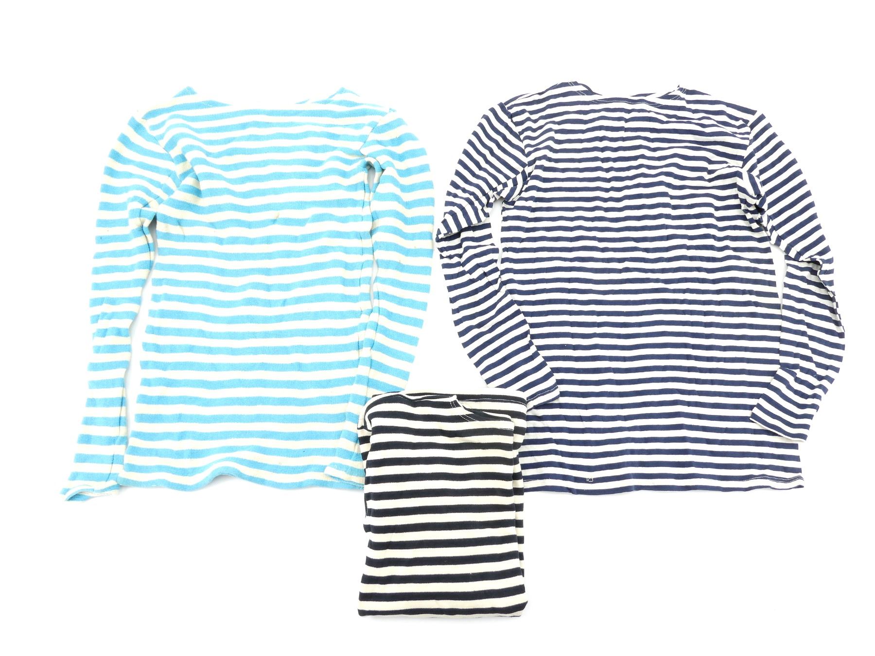 LOT INCLUDES; (1) LIGHT BLUE STRIPED LONG-SLEEVED SHIRT, CONSIGNOR STATES: "FOR SPETZNATS (COMMANDO) SHIRT), NO VISIBLE MARKINGS, SHOWS WEAR, SHOULDER WIDTH APPROX. 16.5", (1) BLUE STRIPED LONG-SLEEVED SHIRT, CONSIGNOR STATES: "WORN BY ARMY PARATROOPERS, NEW UN-ISSUED", PAPER LABEL STILL ATTACHED AT BOTTOM OF SHIRT, DATED: "05, 87", VARIOUS OTHER MARKINGS ON LABEL, SHOULDER WIDTH APPROX. 17" & (1) DARK BLUE STRIPED LONG-SLEEVED SHIRT, CONSIGNOR STATES: "WORN BY NAVY SAILORS", NO VISIBLE MARKINGS, SHOWS WEAR, SHOULDER WIDTH APPROX. 20.5". SEE PHOTOS.