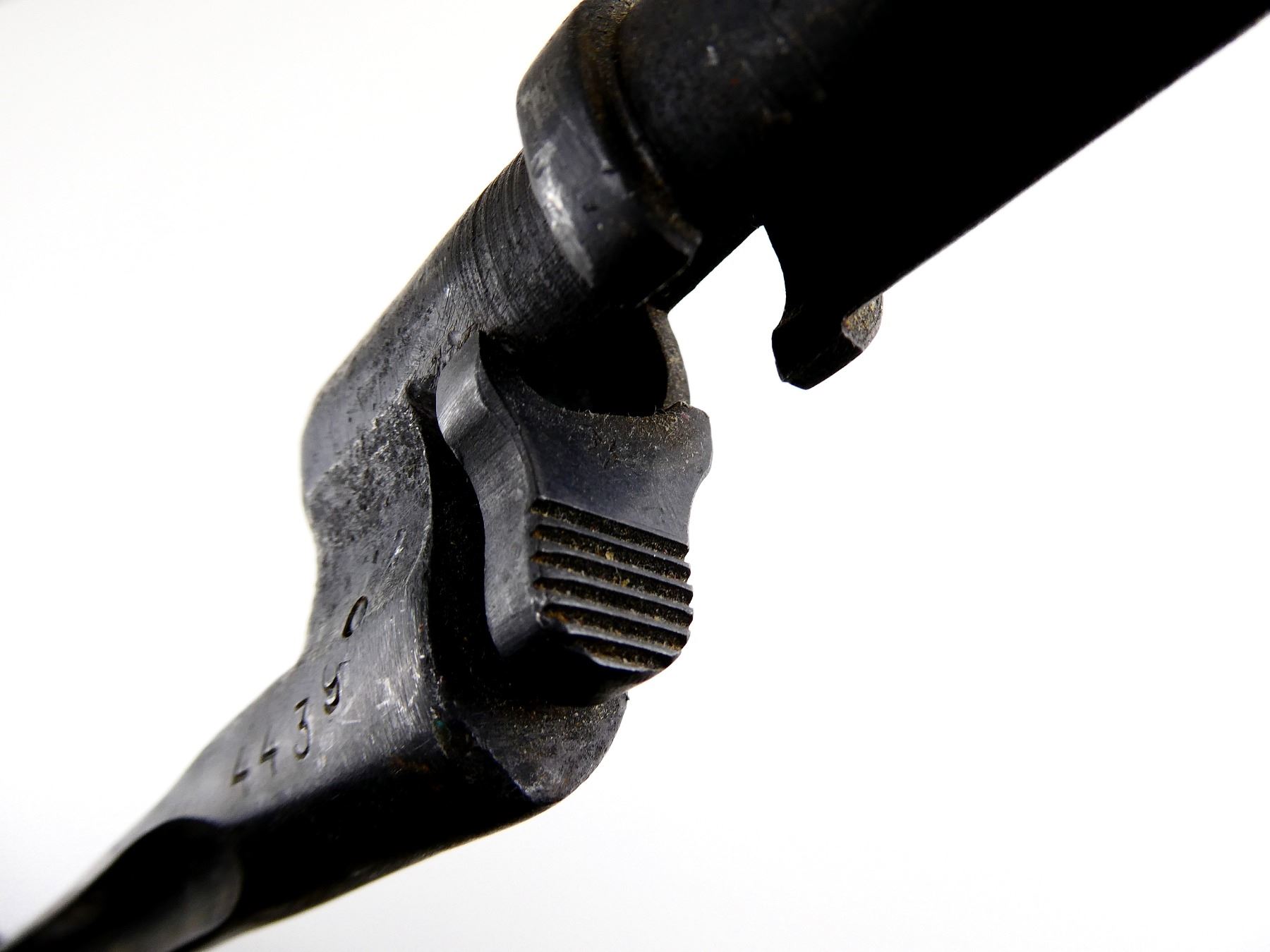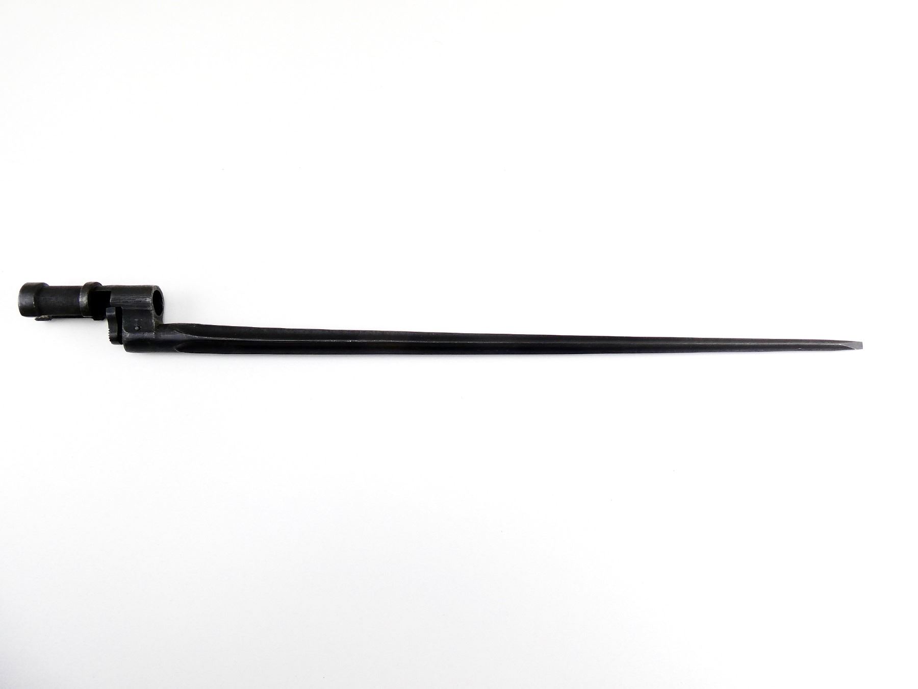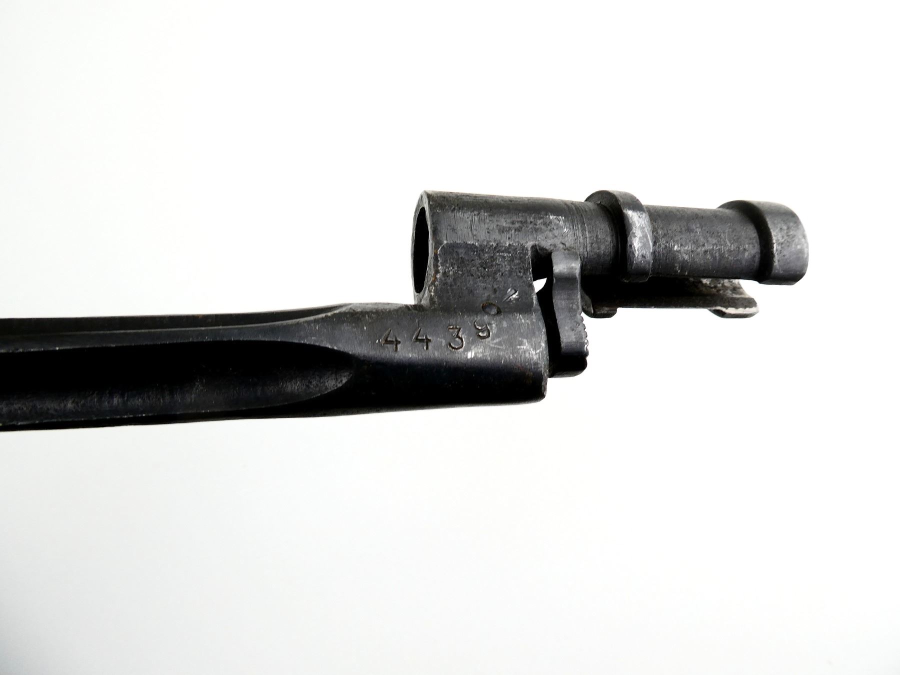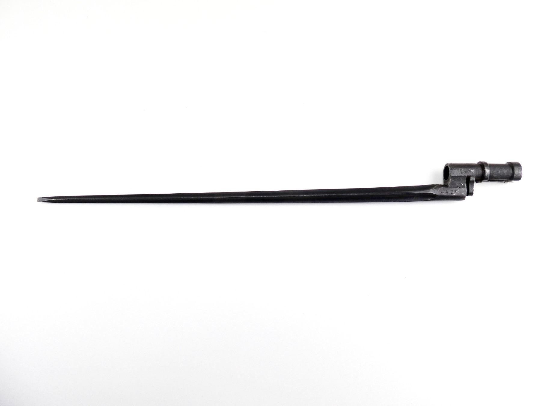 (1) FITS 7.62MM M1891/30 MOSIN NAGANT RIFLES, CRUCIFORM BLADE, BLUED STEEL, SOCKET MARKED: "4439" & OTHER FAINT PROOF MARK ON RELEASE BUTTON, NO SCABBARD, BLADE APPROX. 16 7/8" & OAL APPROX. 19.75". SEE PHOTOS.