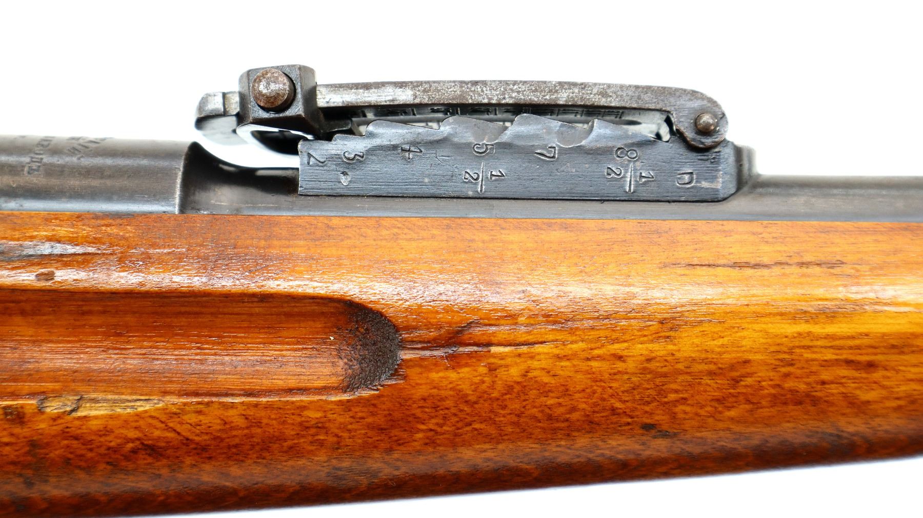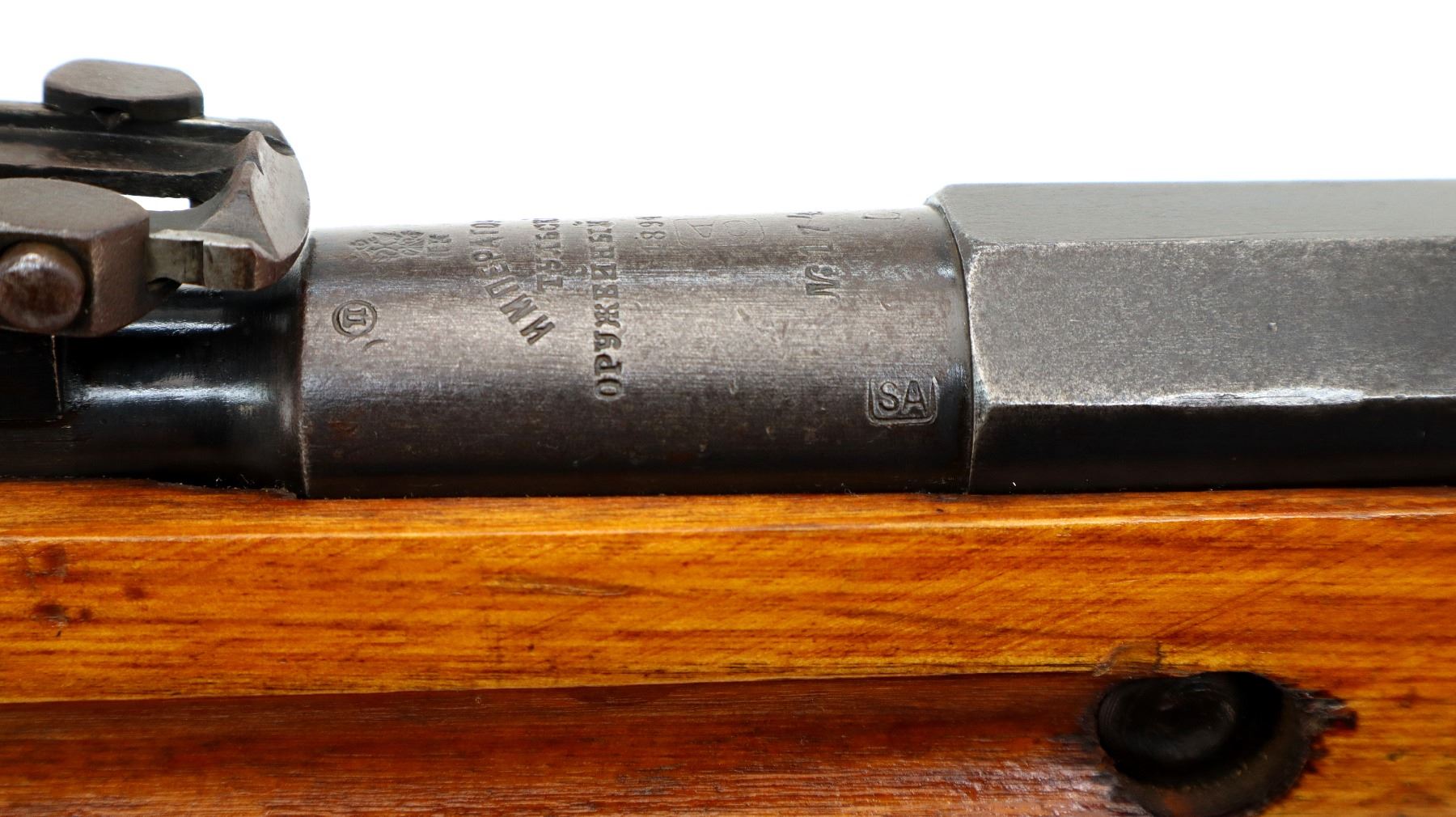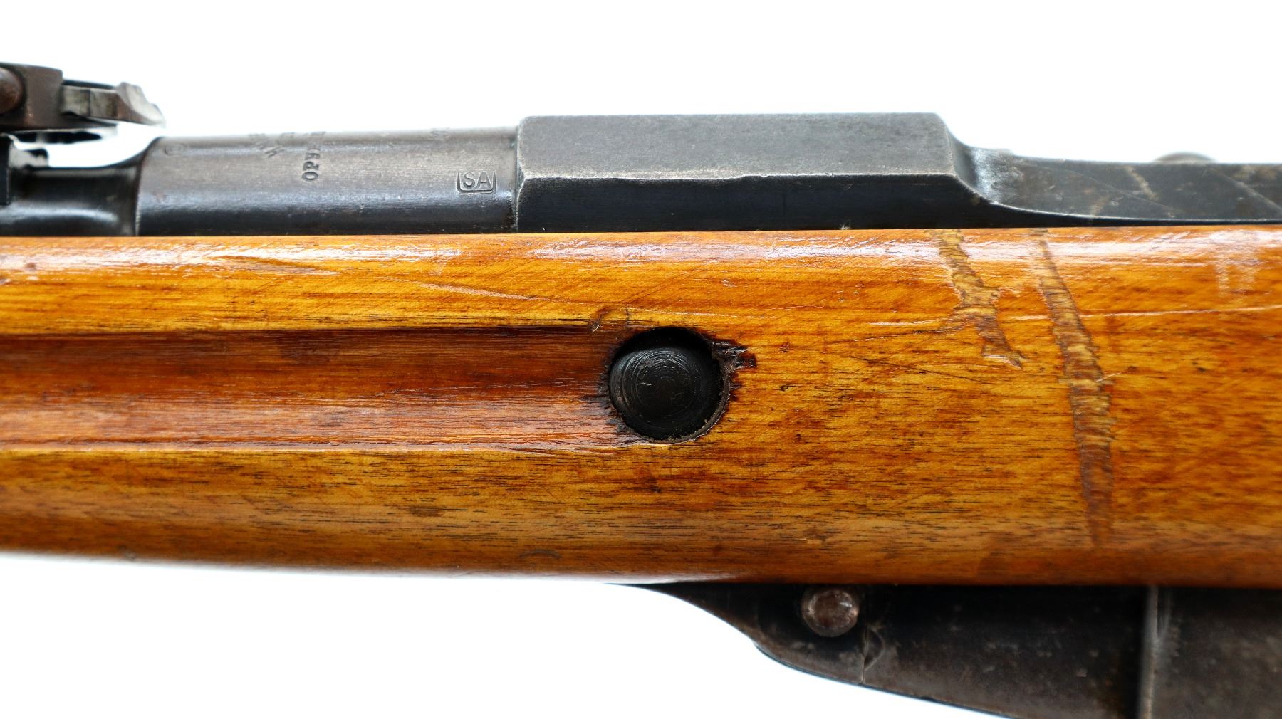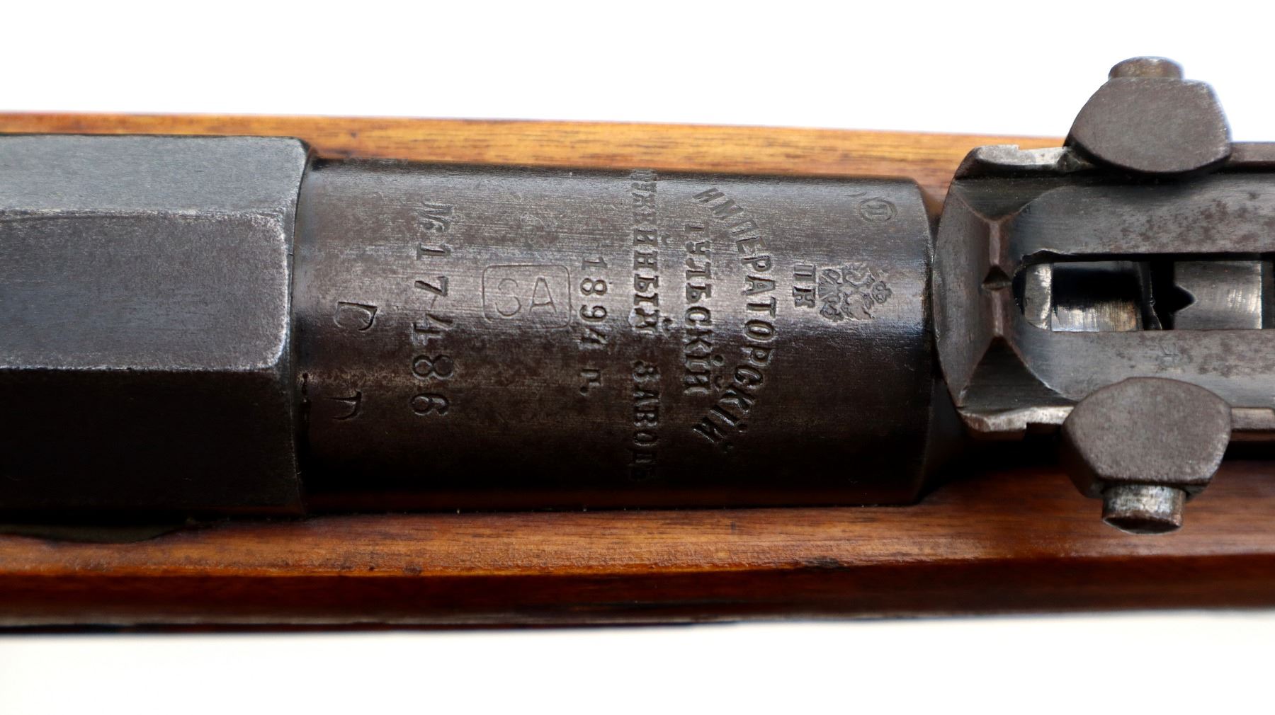 Main Description: Manufactured by Tula Imperial 1894, serial numbers mismatched. Blade front sight with ramp, adjustable u notched rear sight, barrel has SA in a box indicating Finnish Military Ownership, hex receiver, straight bolt handle. Two piece full military wood stocks, handguard is cracked, finger grooved forearm, smooth steel butt plate, stock cracked at heel, arsenal repaired at toe, sling slots and cleaning rod.