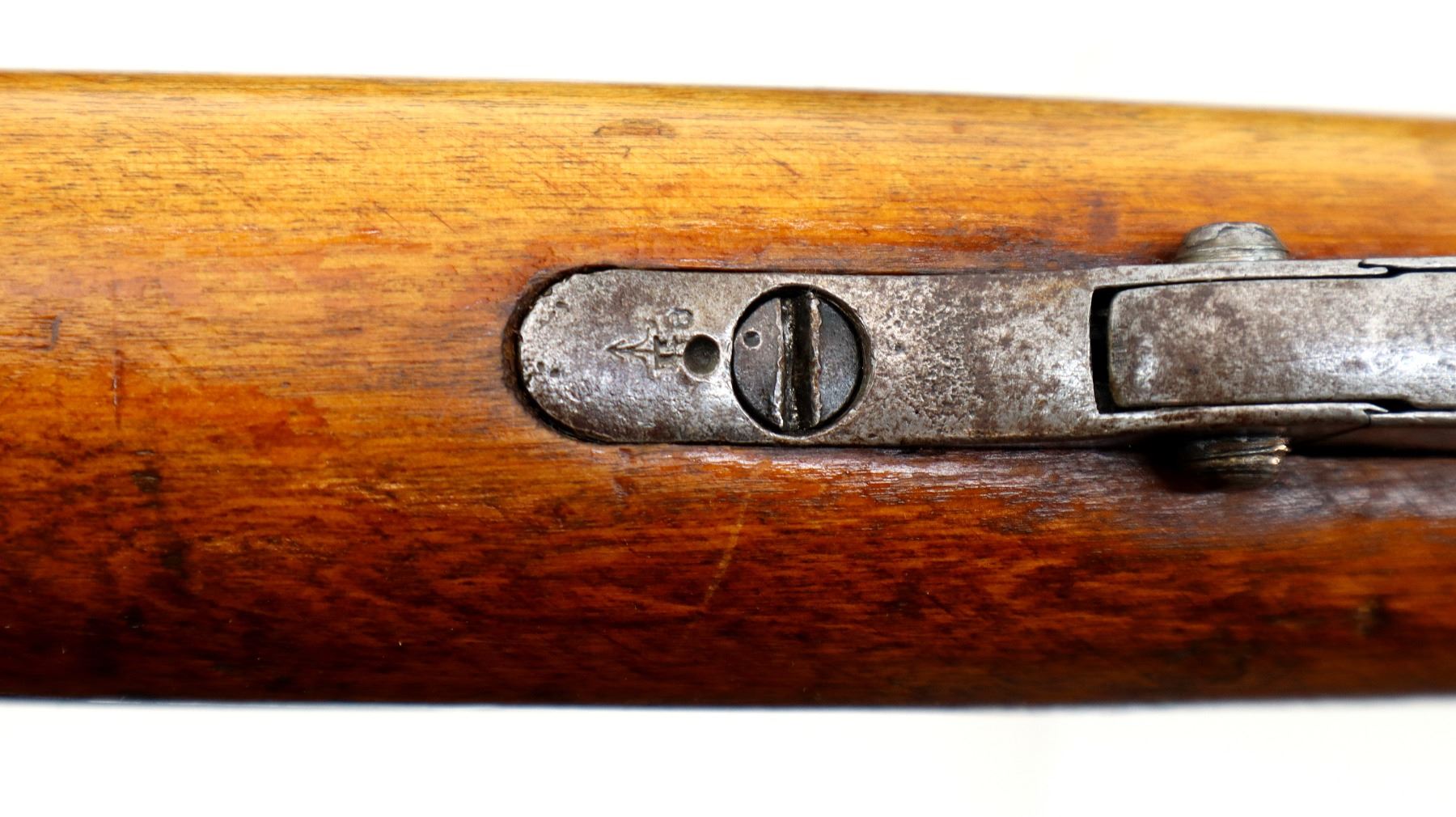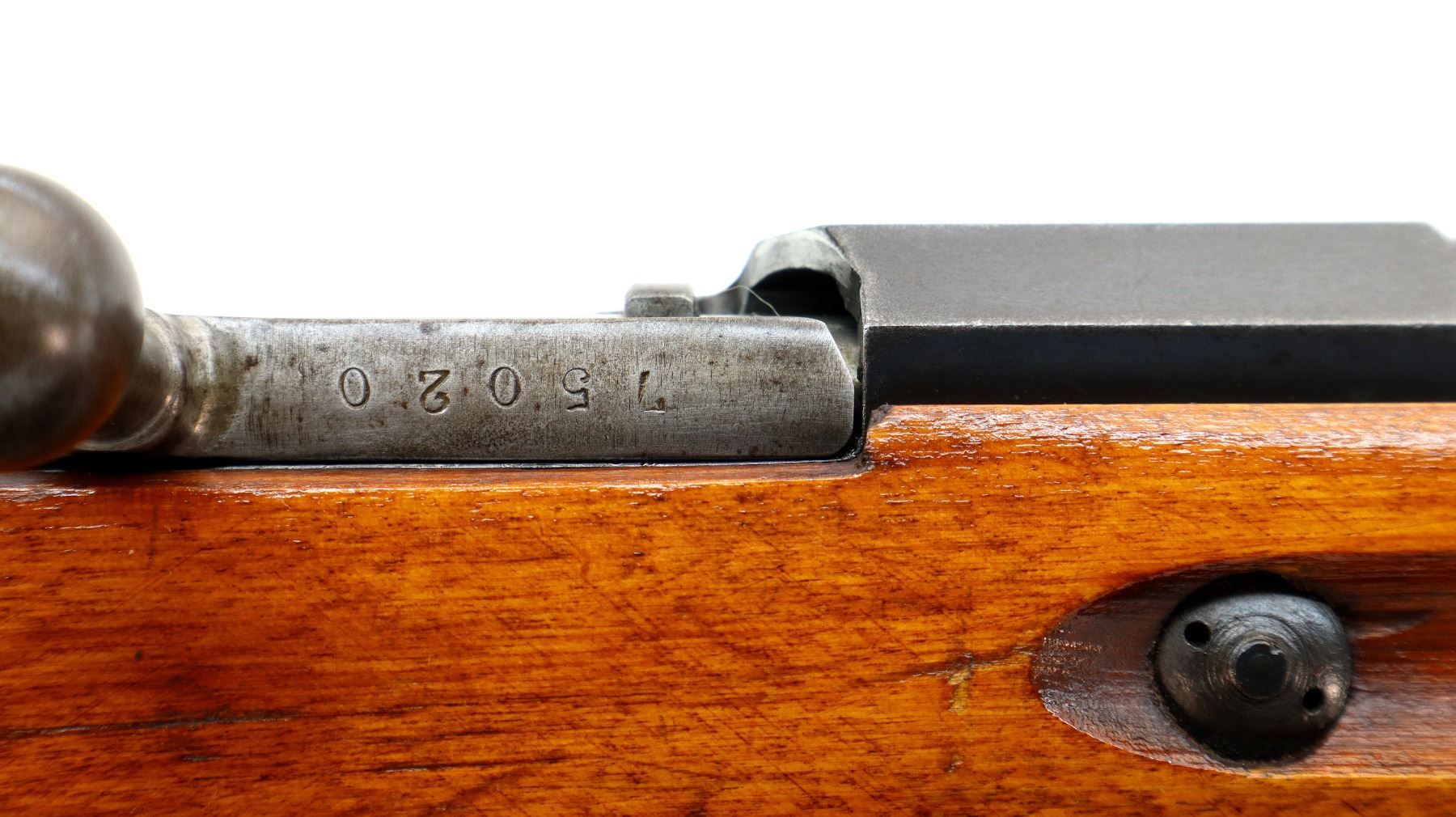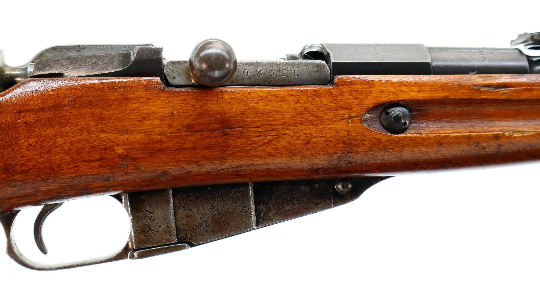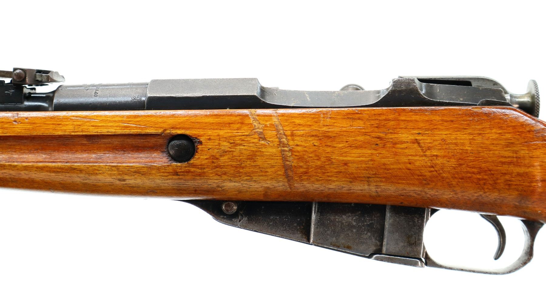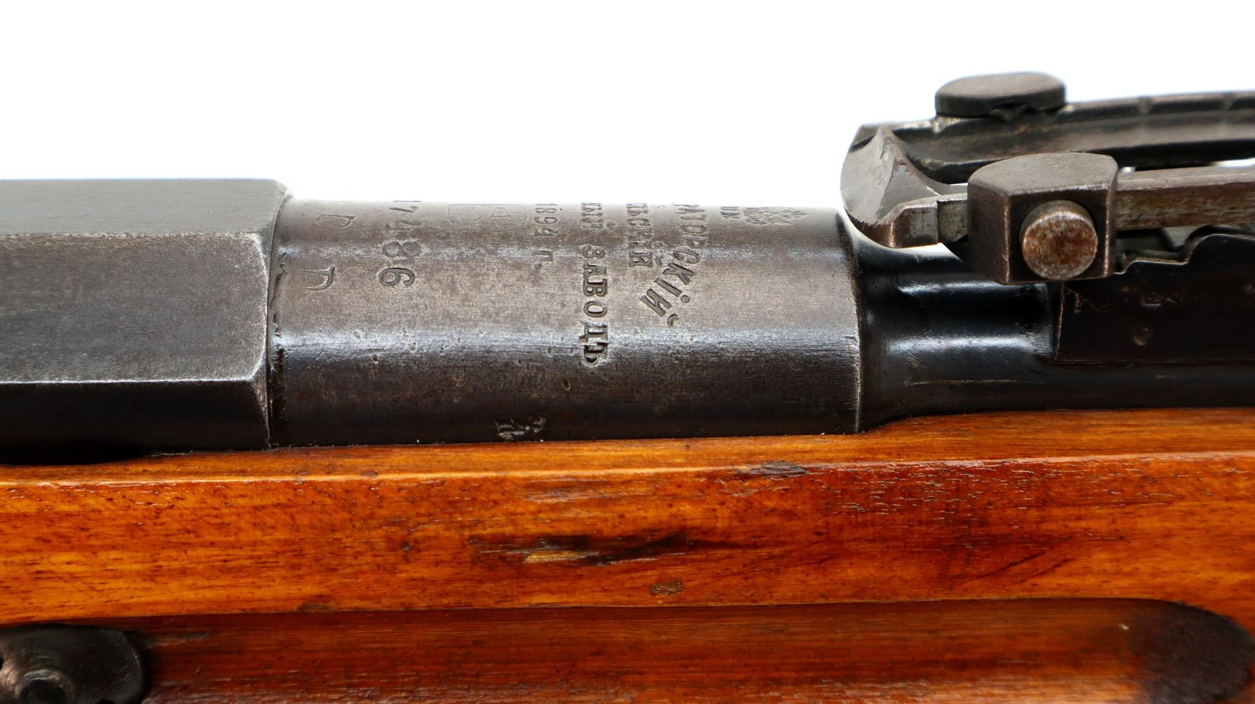 Main Description: Manufactured by Tula Imperial 1894, serial numbers mismatched. Blade front sight with ramp, adjustable u notched rear sight, barrel has SA in a box indicating Finnish Military Ownership, hex receiver, straight bolt handle. Two piece full military wood stocks, handguard is cracked, finger grooved forearm, smooth steel butt plate, stock cracked at heel, arsenal repaired at toe, sling slots and cleaning rod.