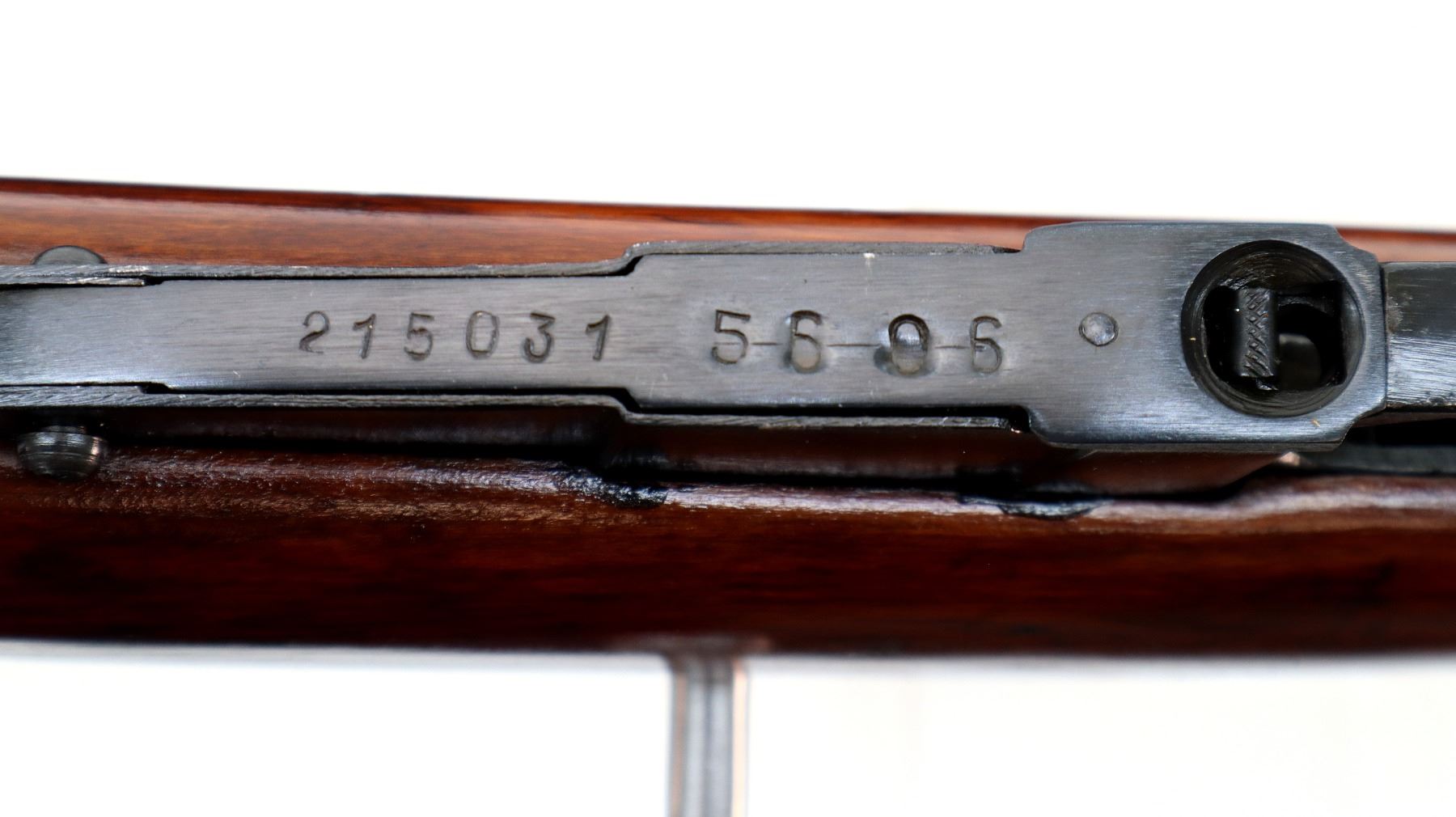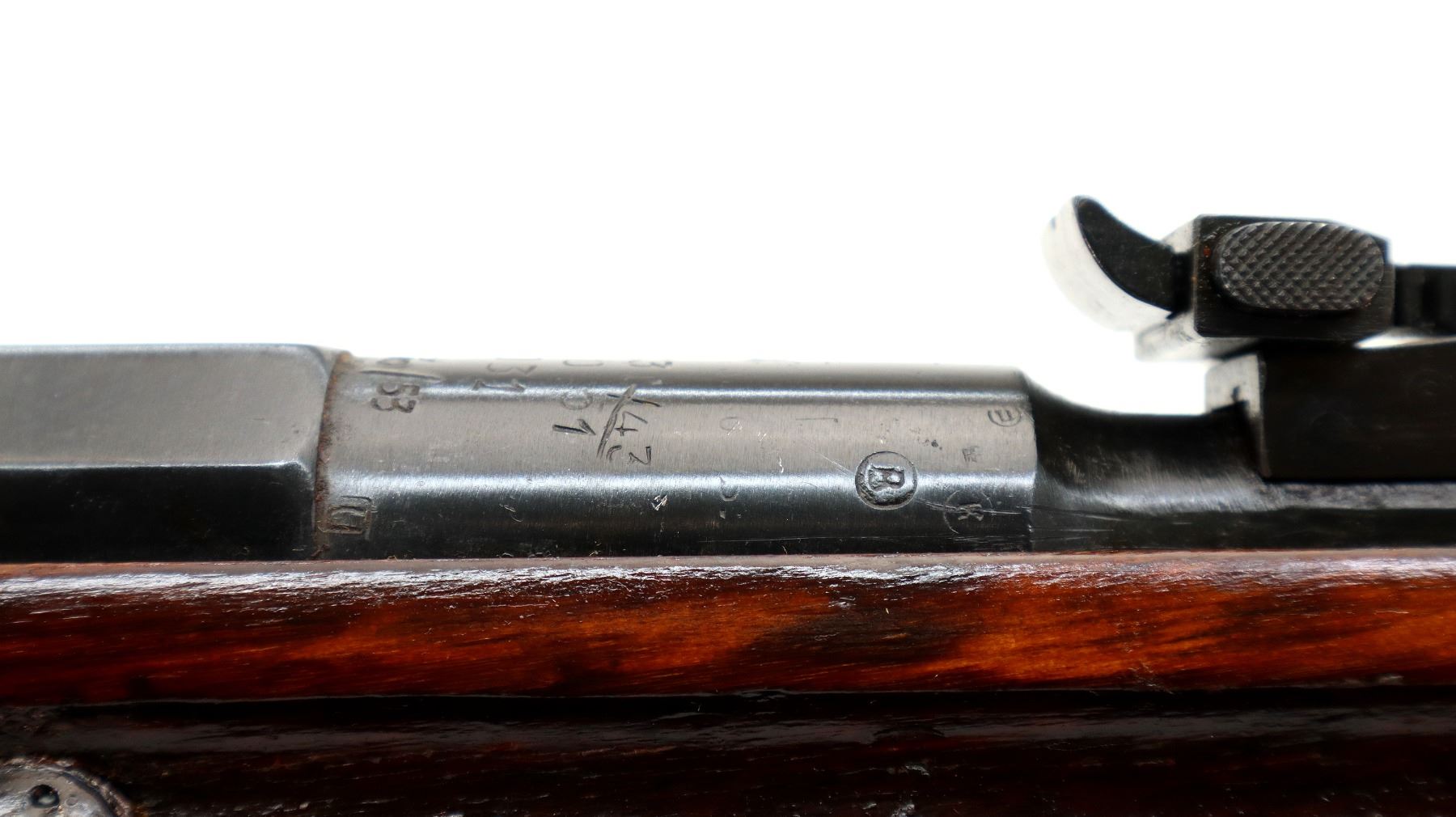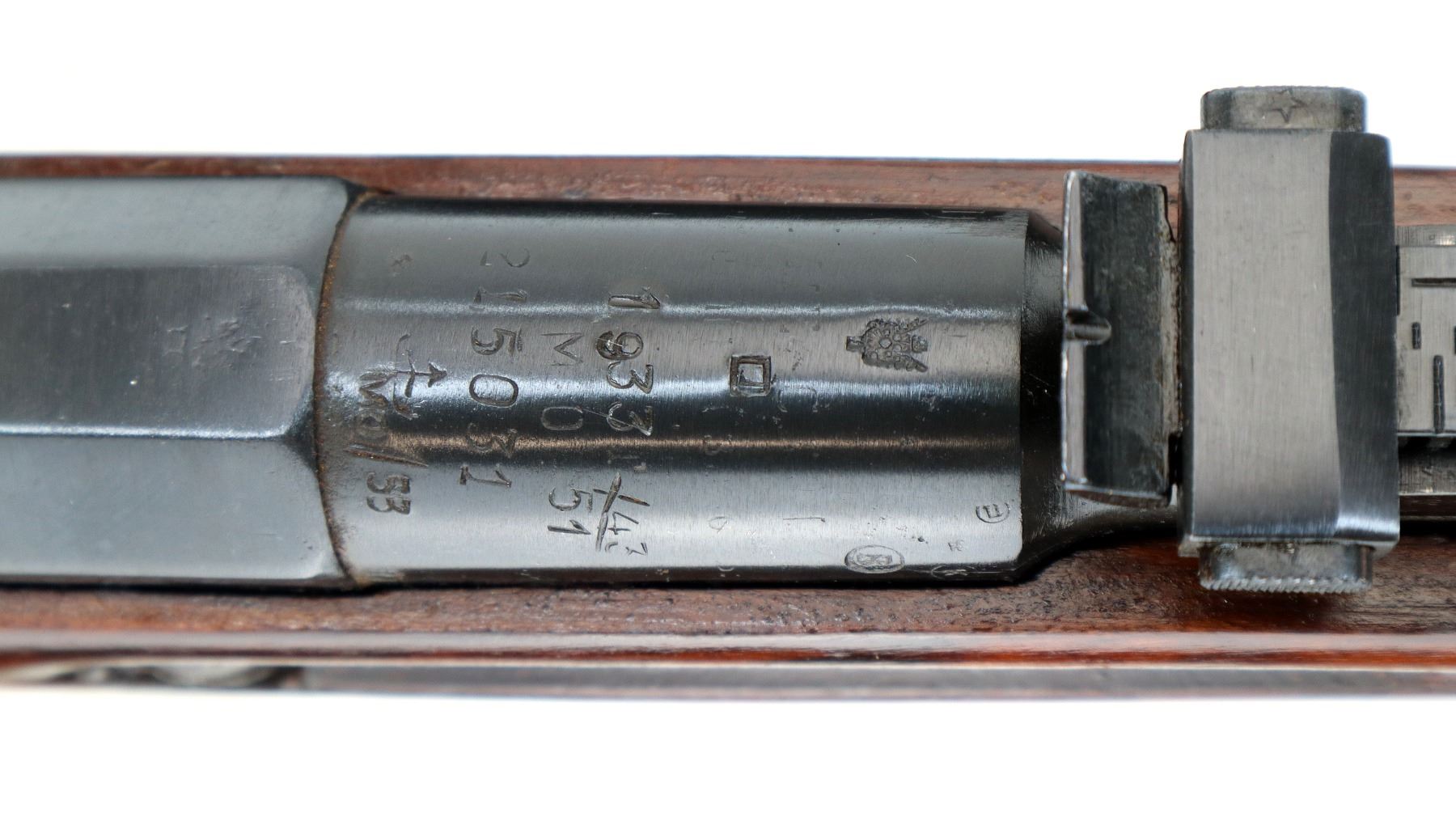 Main Description: Dated 1933, arsenal rebuilt numbered to match, has MO (Ministry of Defense) triple marked dated 43, 51 and 53. Post front sight with hood and ramp, adjustable u notched rear sight, blued finish, hex receiver, silver bolt with straight handle. Two piece full military wood stocks, finger grooved forearm, straight grip, smooth steel butt plate, sling slots, cleaning rod.