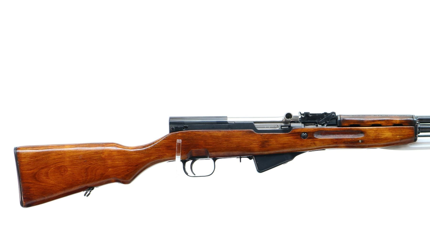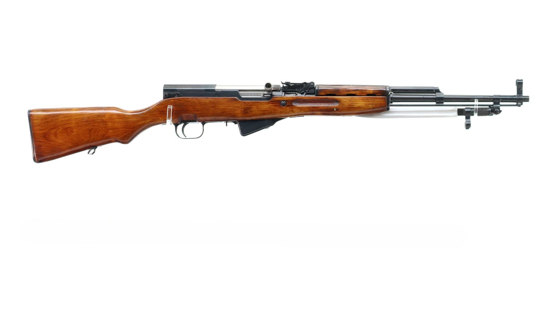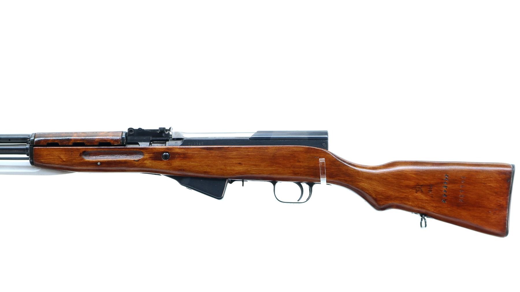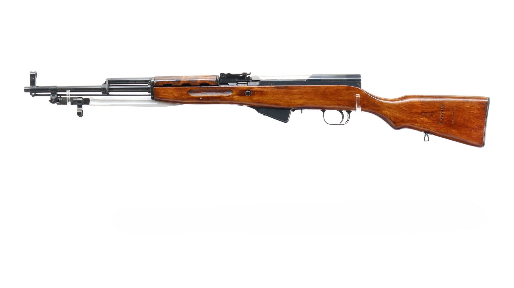 Main Description: Manufactured by Tula 1954, arsenal rebuilt numbered to match. Post front sight with hood and ramp, adjustable u notched rear sight, blued metal finish, silver bolt and carrier. Two piece full military wood stocks, ventilated handguard, finger grooved forearm, pistol grip, smooth steel butt plate with trap and cleaning kit, sling swivels, cleaning rod, attached folding blade bayonet.