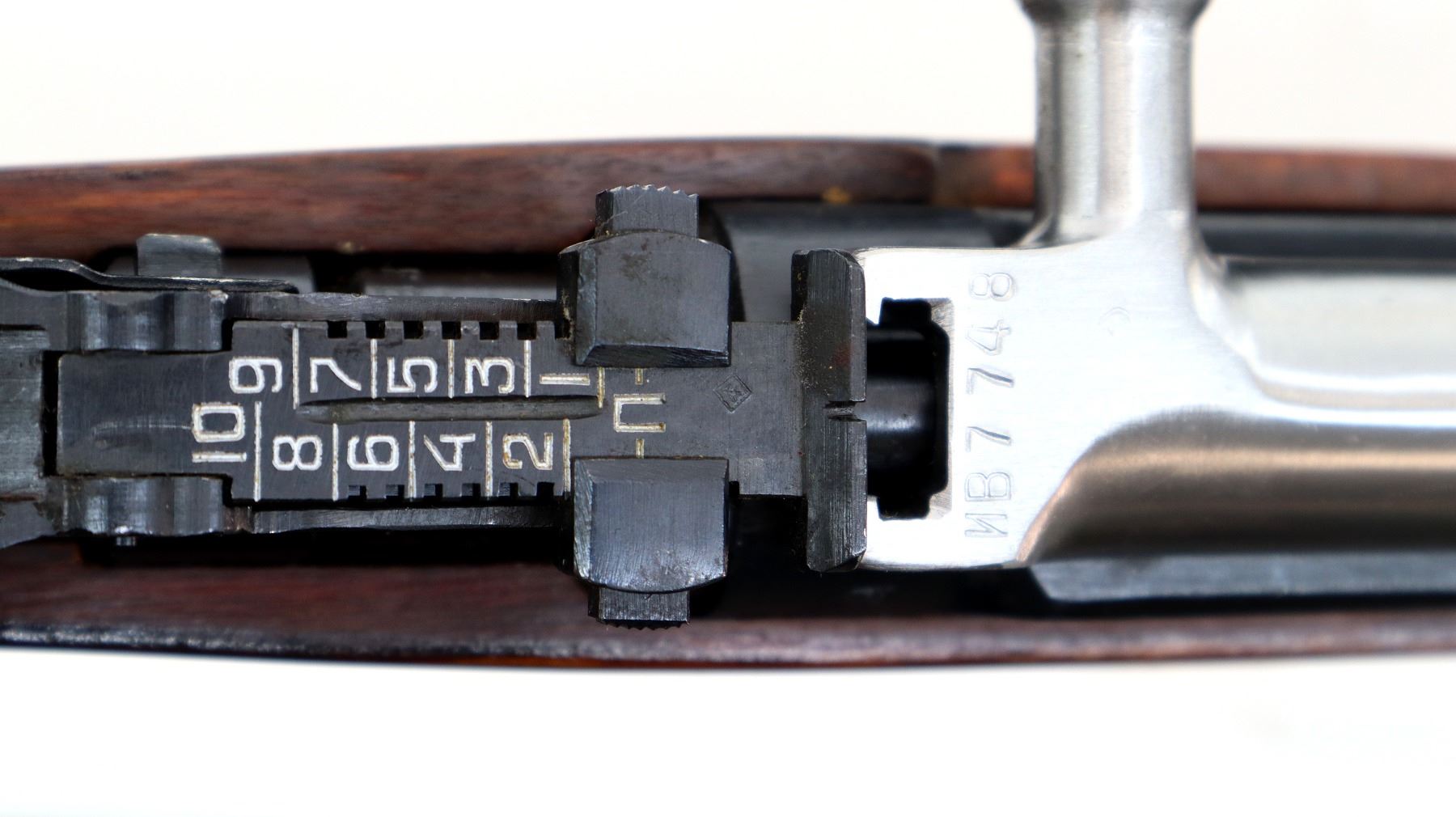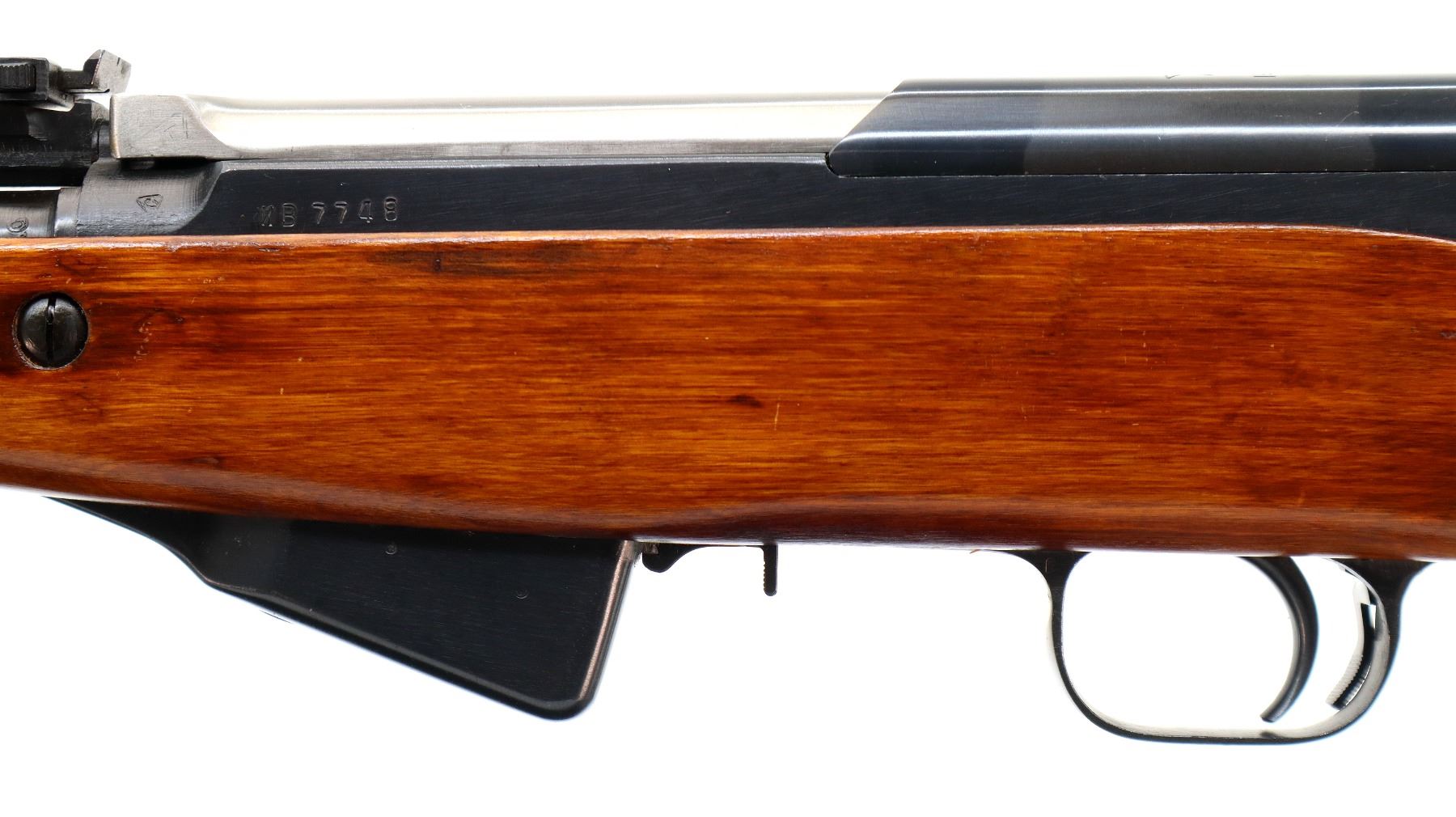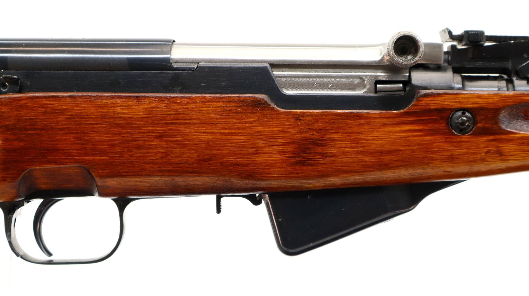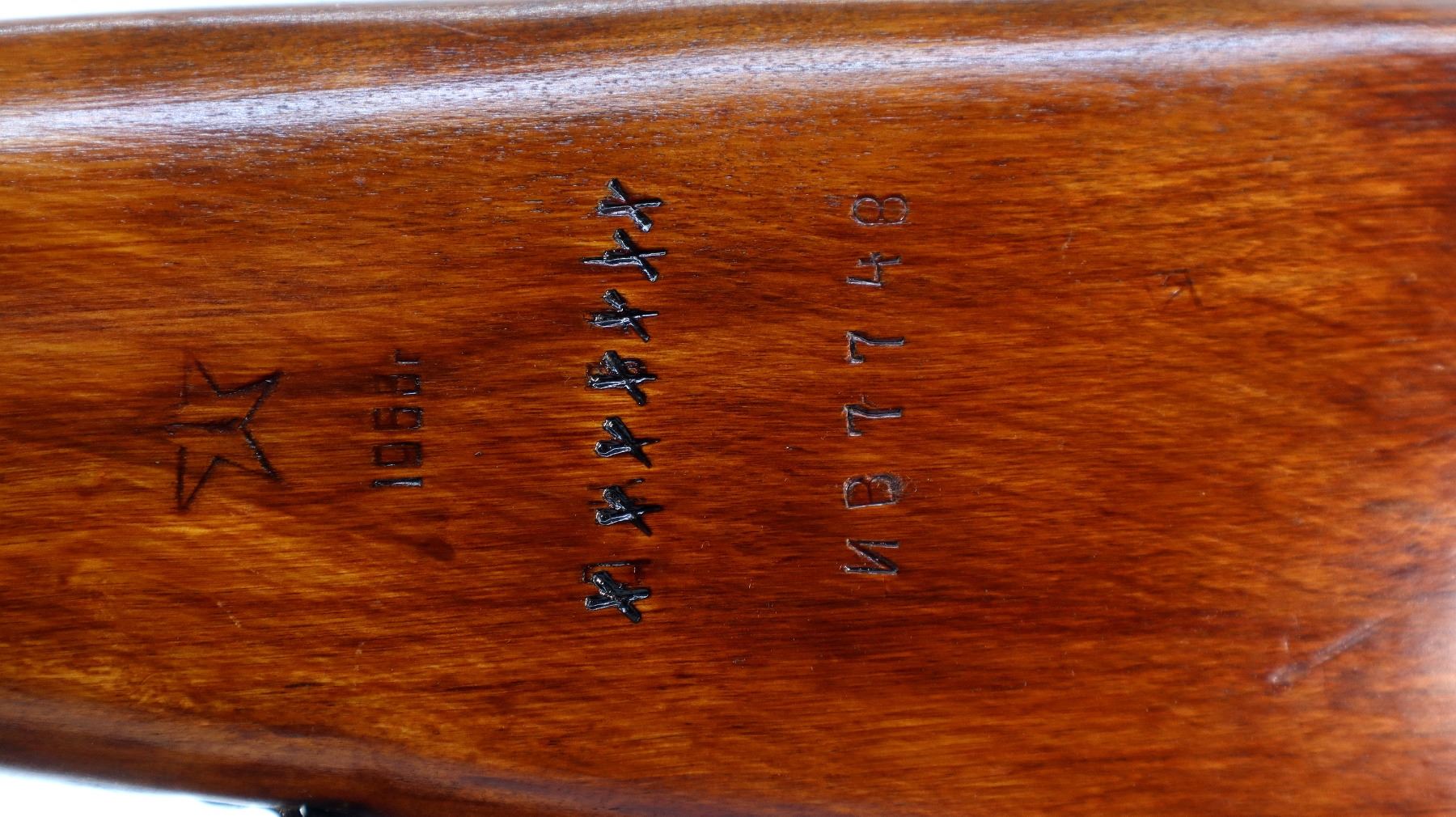 Main Description: Manufactured by Tula 1954, arsenal rebuilt numbered to match. Post front sight with hood and ramp, adjustable u notched rear sight, blued metal finish, silver bolt and carrier. Two piece full military wood stocks, ventilated handguard, finger grooved forearm, pistol grip, smooth steel butt plate with trap and cleaning kit, sling swivels, cleaning rod, attached folding blade bayonet.