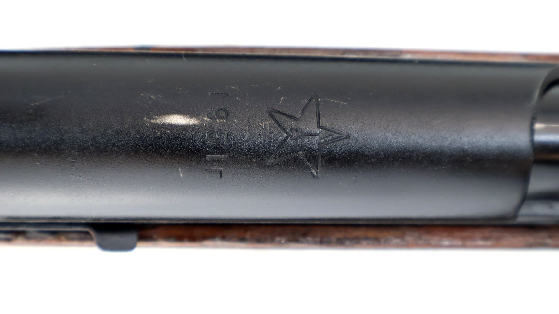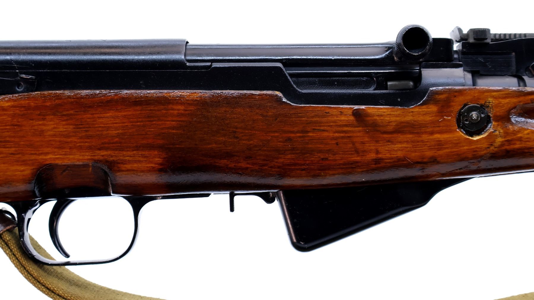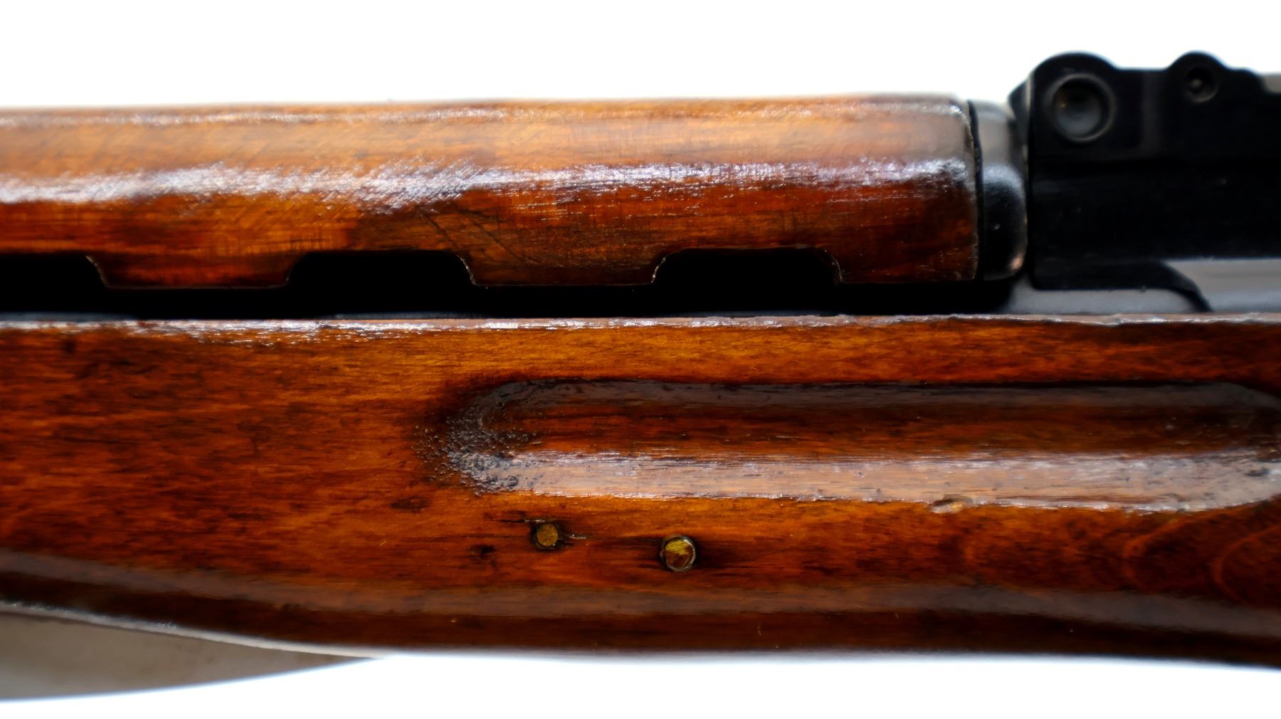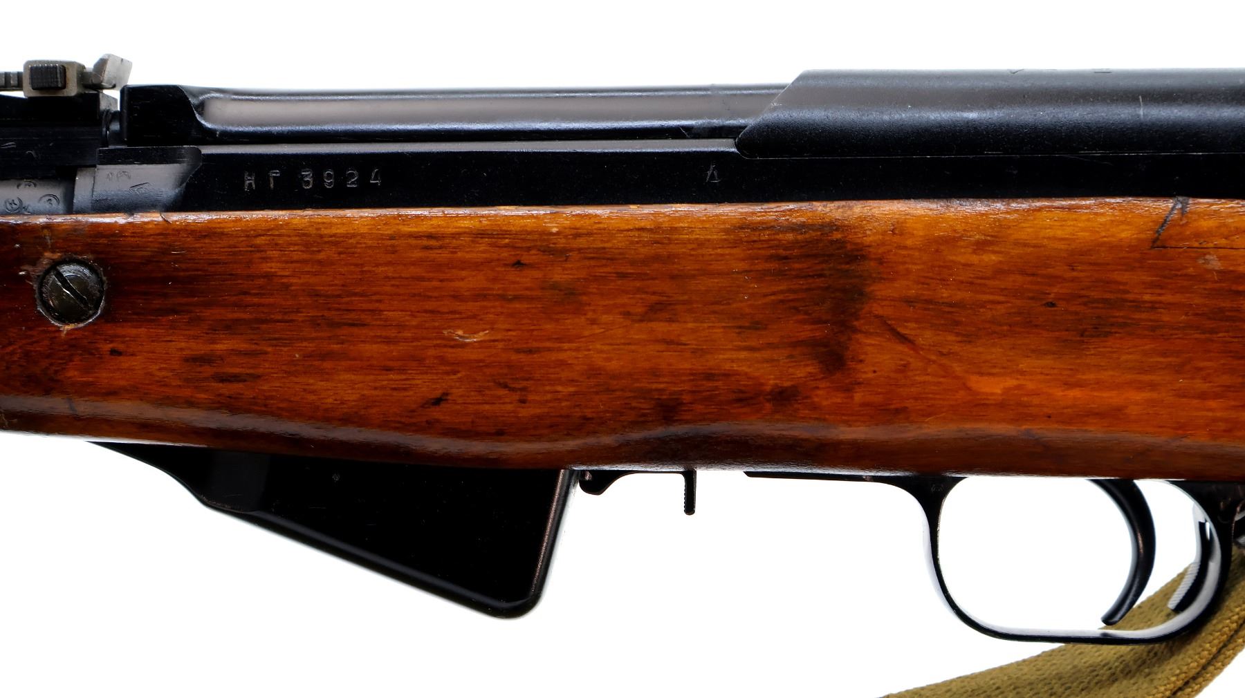 Main Description: manufactured by Tula 1951, Arsenal rebuilt numbered to match. Post front sight with hood and ramp, adjustable u notched rear sight, black painted metal finish. Two piece full military wood stocks, ventilated handguard, finger grooved forearm, pistol grip, arsenal repair on left side, smooth steel butt plate with trap and cleaning kit, sling swivels with canvas military sling, cleaning rod, attached folding blade bayonet.
