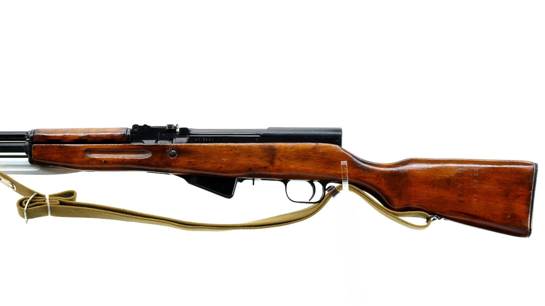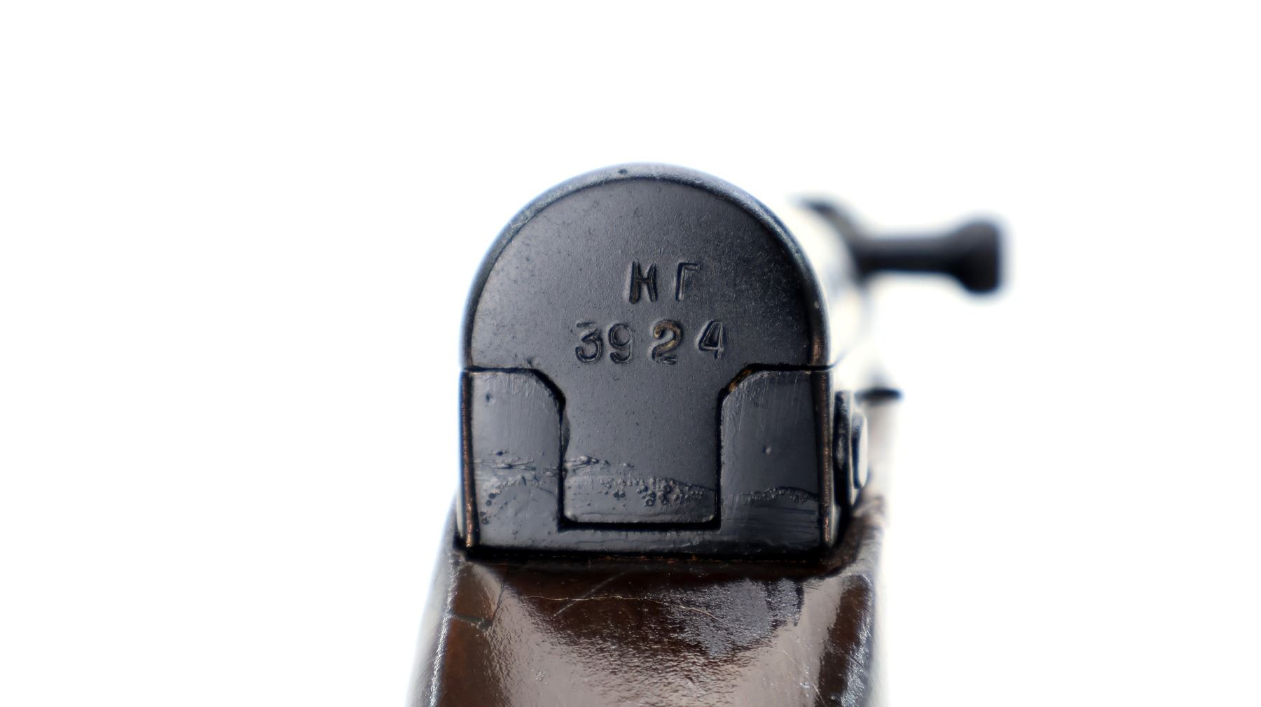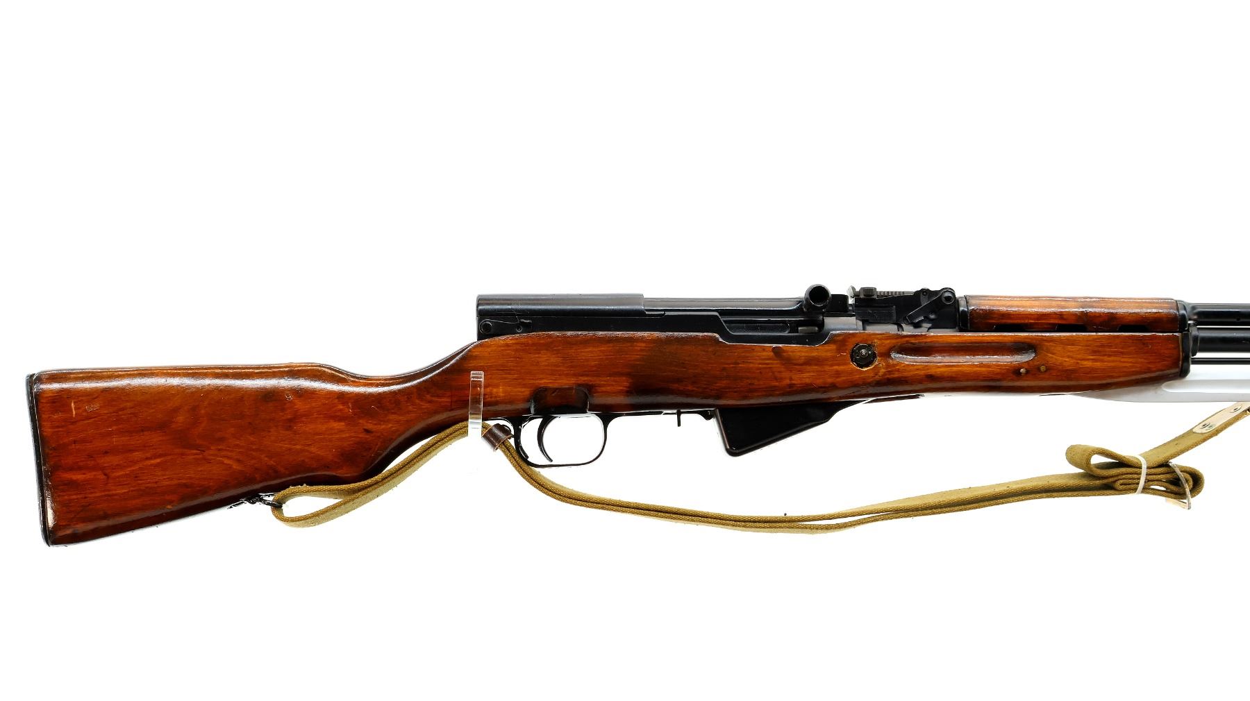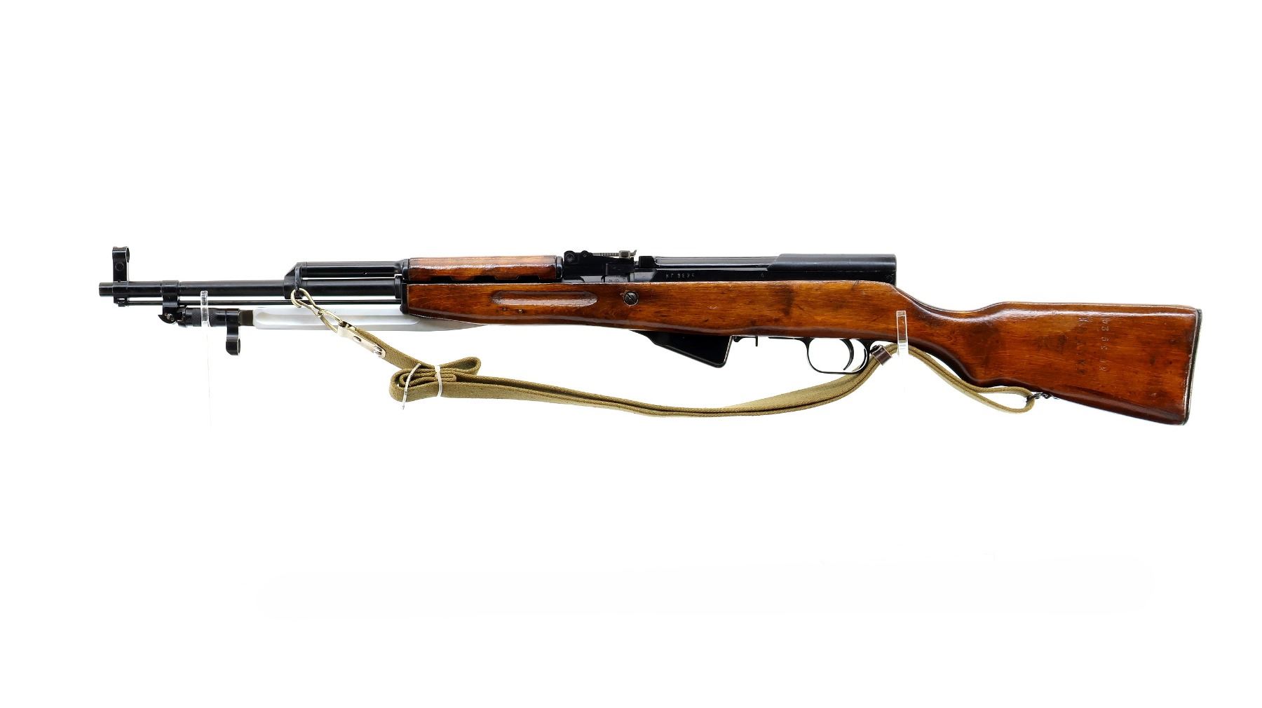 Main Description: manufactured by Tula 1951, Arsenal rebuilt numbered to match. Post front sight with hood and ramp, adjustable u notched rear sight, black painted metal finish. Two piece full military wood stocks, ventilated handguard, finger grooved forearm, pistol grip, arsenal repair on left side, smooth steel butt plate with trap and cleaning kit, sling swivels with canvas military sling, cleaning rod, attached folding blade bayonet.