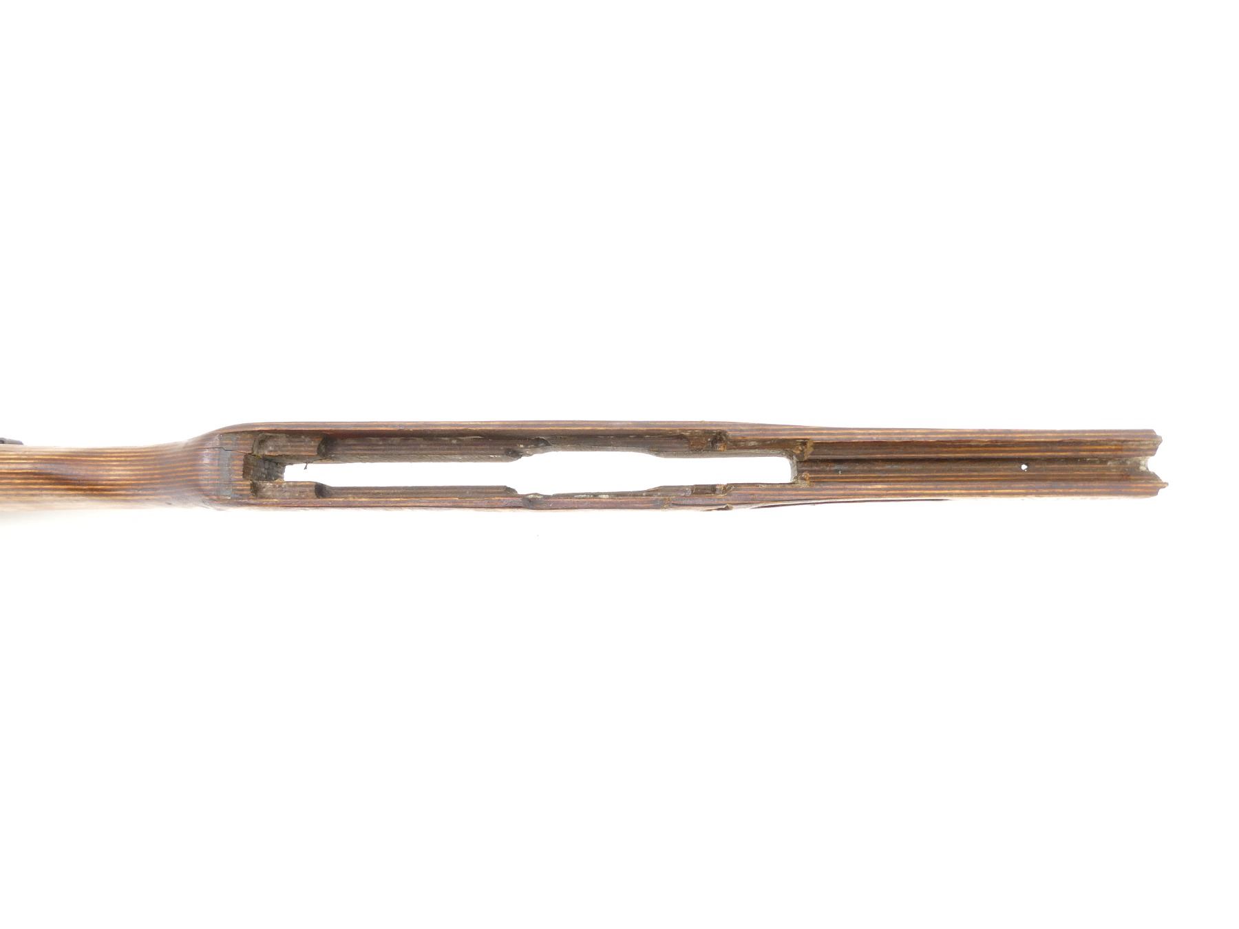 (1) WOODEN STOCK, SMOOTH, SIDE SLING SWIVEL, INDISTINCT MARKINGS, MISSING BUTT PLATE, MAY HAVE SMALL CRACKS / CHIPS, OVERALL LENGTH APPROX. 28 7/8". MAY REQUIRE FITTING. SEE PHOTOS.