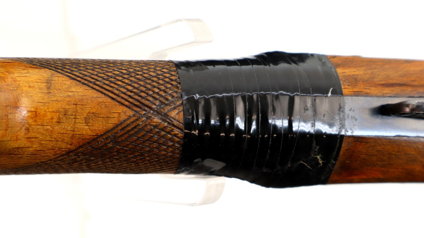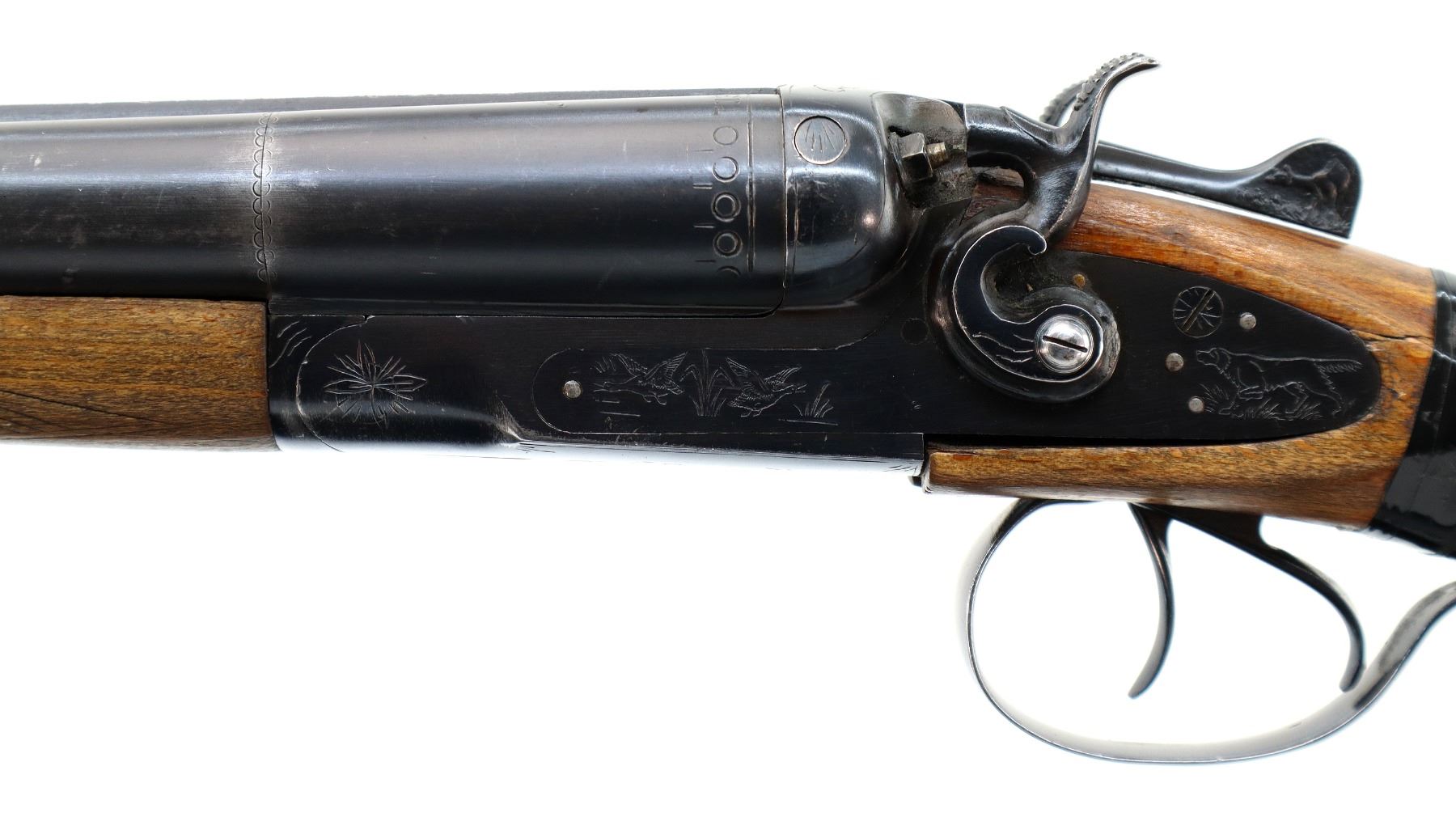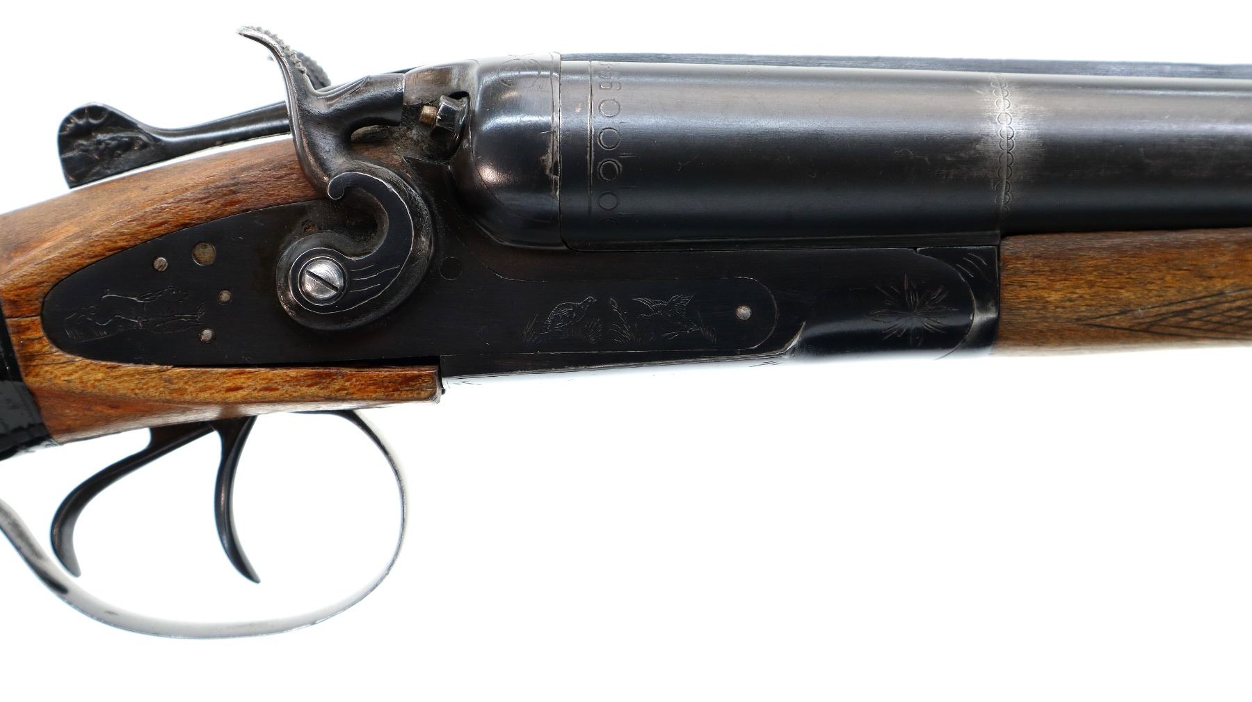 Main Description: Brass bead, blued finish, raised rib, engraved receiver and side locks with grooved spur hammers that function, extractor, double triggers. Two piece wood stocks, checkered forearm and pistol grip, stock chipped, cracked and broken wrapped with black tape. Grooved red polymer butt plate, grip cap, sling swivels. Front swivel has a replaced screw