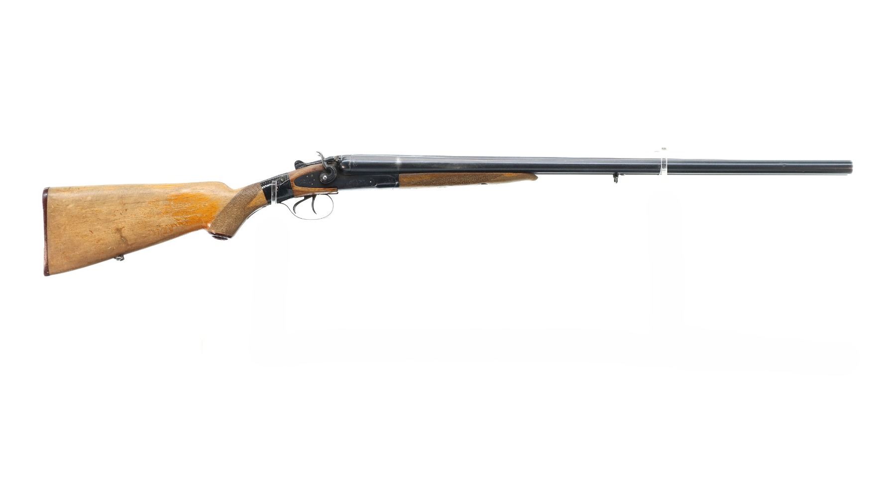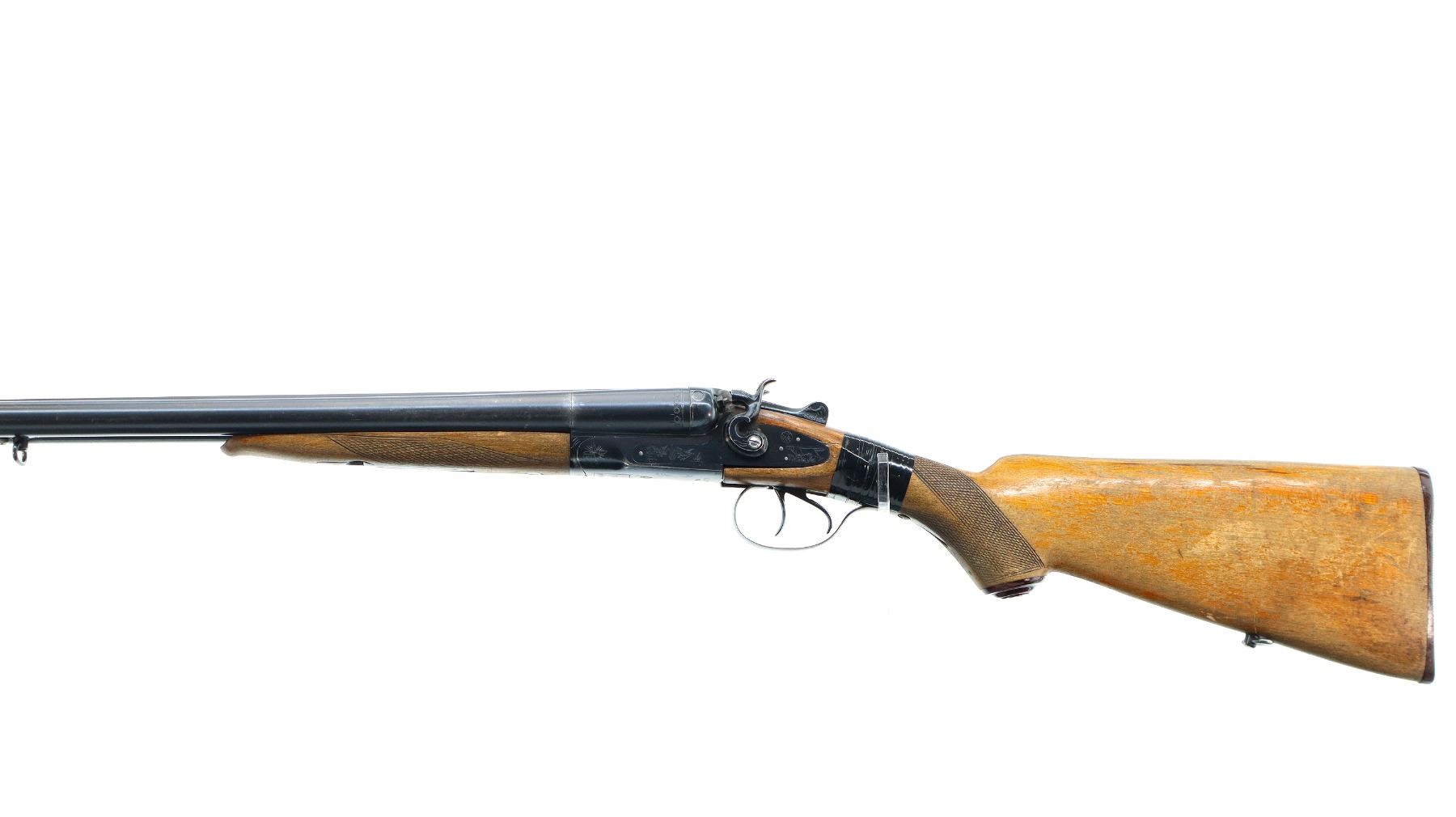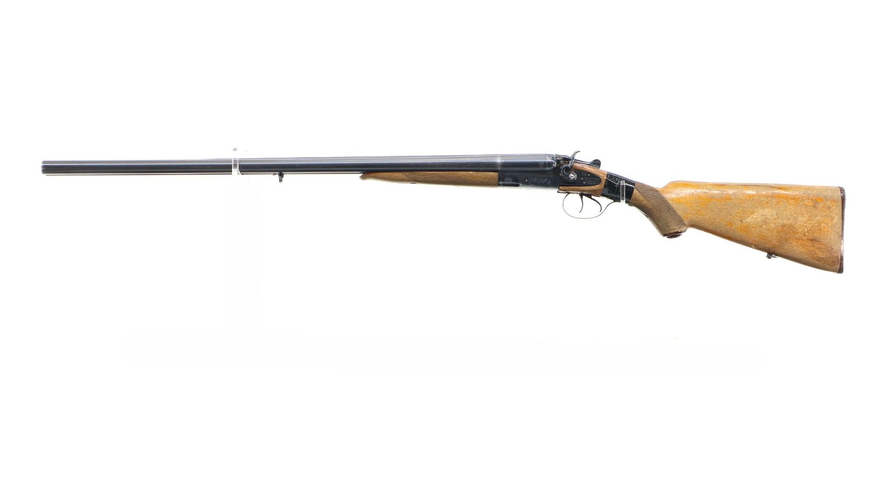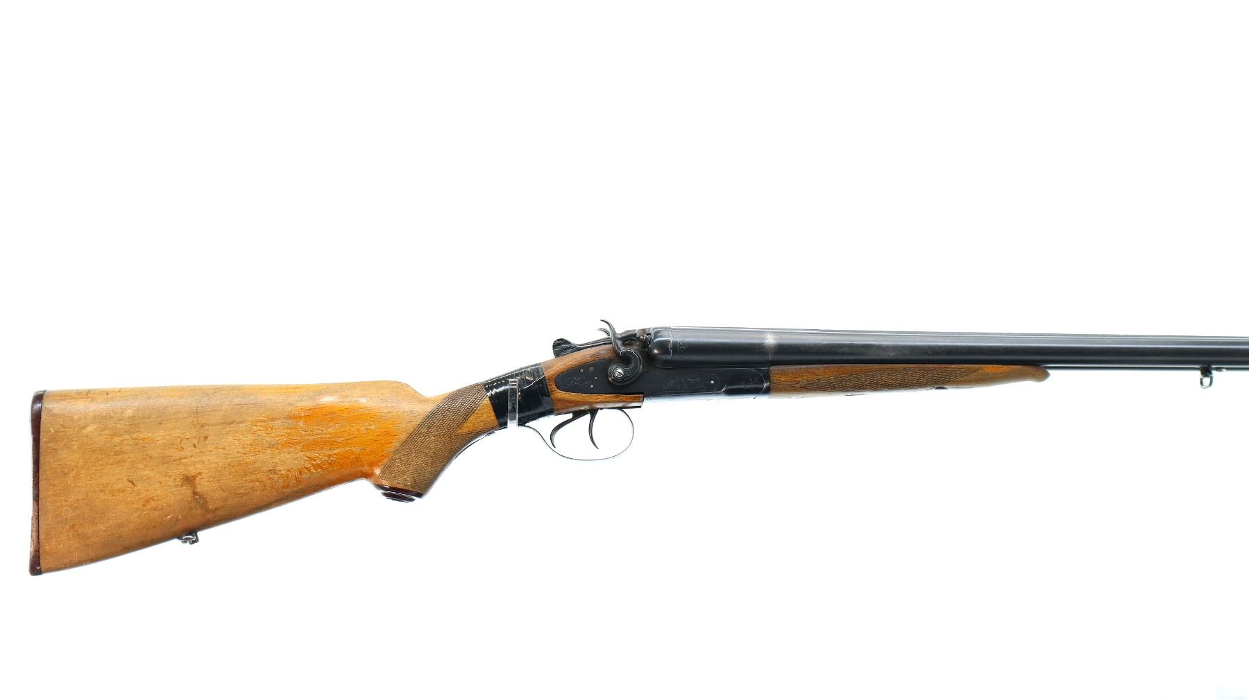 Main Description: Brass bead, blued finish, raised rib, engraved receiver and side locks with grooved spur hammers that function, extractor, double triggers. Two piece wood stocks, checkered forearm and pistol grip, stock chipped, cracked and broken wrapped with black tape. Grooved red polymer butt plate, grip cap, sling swivels. Front swivel has a replaced screw