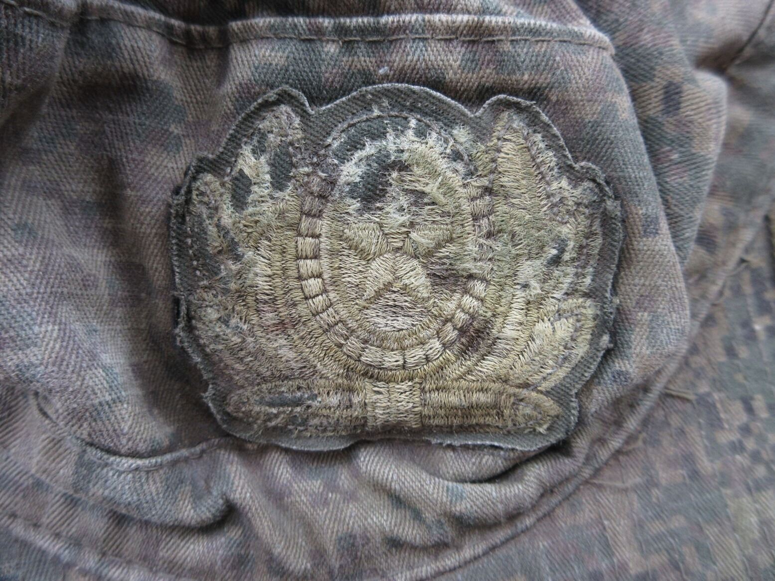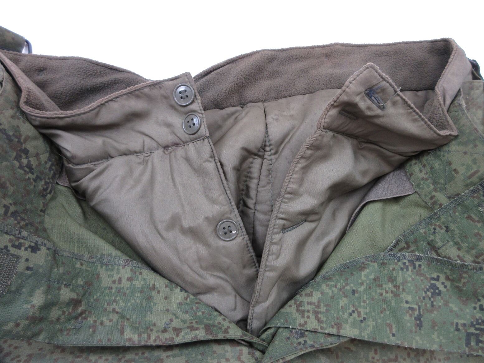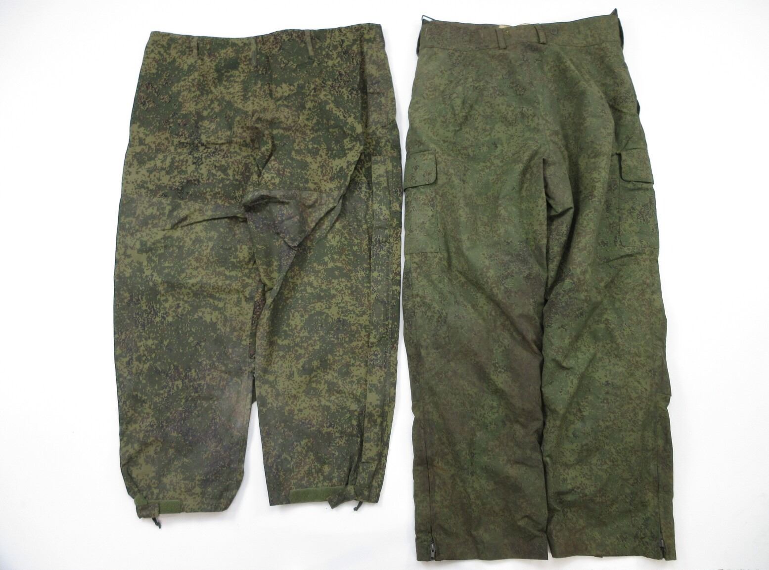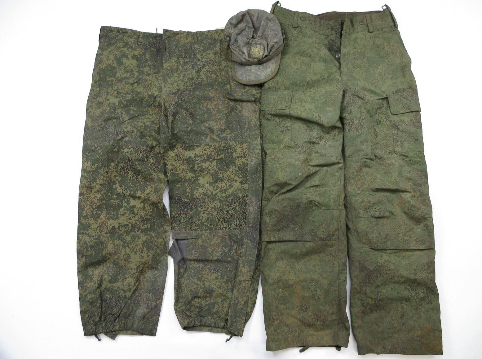 RUSSIAN-UKRAINIAN WAR CAPTURED RUSSIAN ARMY UNIFORM LOT. LOT INCLUDES; (1) EMR CAMOUFLAGE FIELD CAP, VARIOUS MARKINGS, (1) EMR CAMOUFLAGE WIND / RAIN TROUSERS, WAIST APPROX. 42", SHOWS WEAR / TEAR & (1) EMR CAMOUFLAGE WINTER TROUSERS (SNOW PANTS), MARKED: "182-92-81 (46-182)", WAIST APPROX. 37", SHOWS WEAR / TEAR. SEE PHOTOS.
