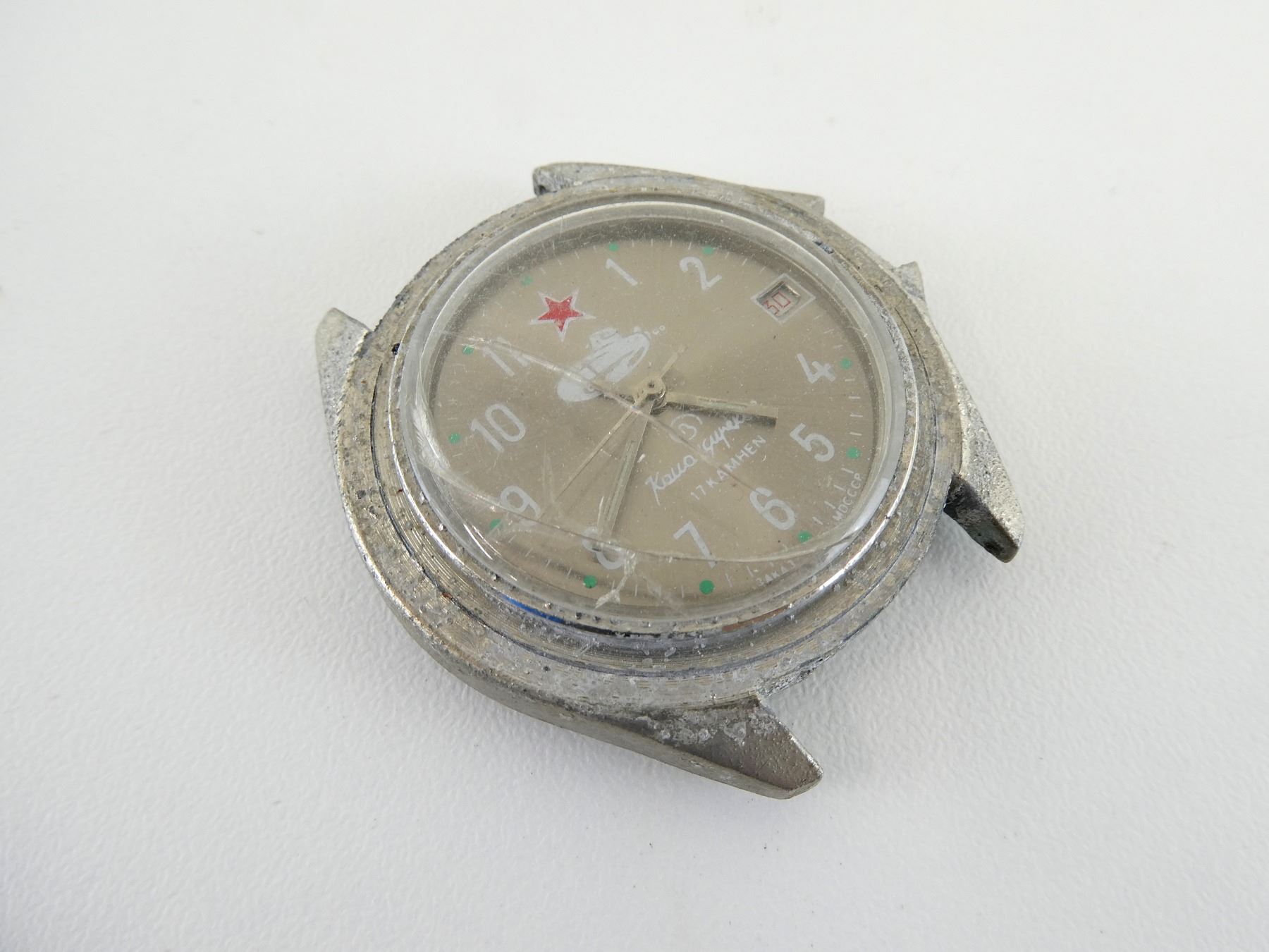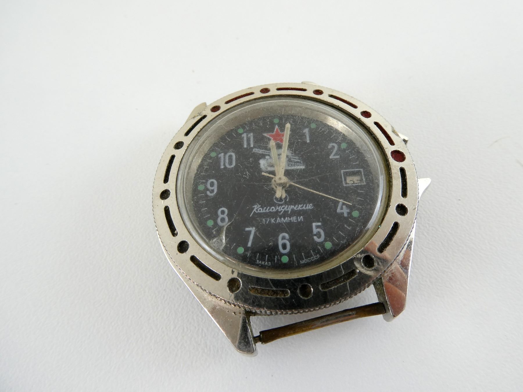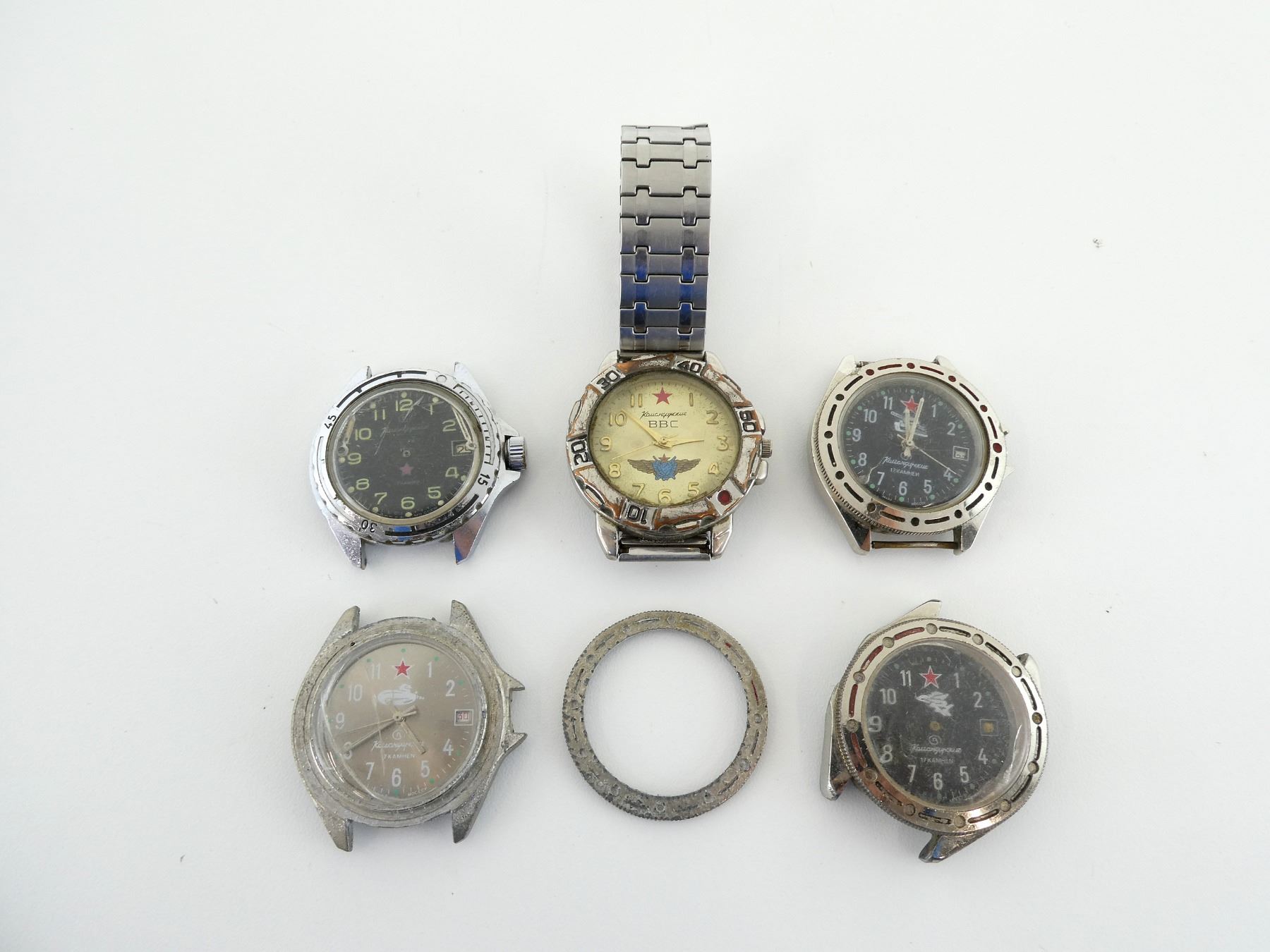 LOT INCLUDES; (5) VOSTOK KOMANDIRSKIE MECHANICAL WRISTWATCHES, FOUR HAVE CHIPPED / CRACKED WATCH FACES, ONLY ONE HAS WRIST BAND, TWO HAVE BROKEN / MISSING CLOCK HANDS, THE OUTER BAND AROUND THE CLOCK FACE HAS FALLEN OFF ONE, VARIOUS MARKINGS, UN-TESTED, ALL SHOW WEAR / TEAR. SEE PHOTOS.