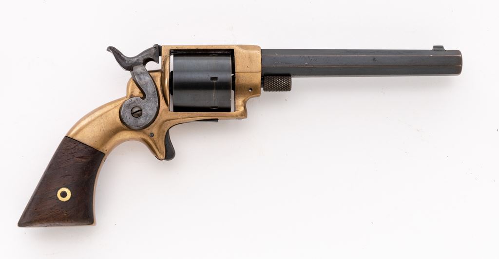 Rare Antique Allen & Wheelock Brass-Frame Sidehammer Spurtrigger Revolver, #177, .38 RF cal., 4.75" octagonal barrel marked "Allen & Wheelock, Worcester MS. U.S." at left flat, has knurled cylinder arbor below; plain round 6-shot cylinder is marked "177" and "6" (or "9") at rear face; rare brass (or bronze) solid frame is marked "July 3, 1860" at left-front, has right sidehammer, integral spurtrigger sheath and gripstraps, with 2-pc. varnished walnut grips. Mfg'd ca. 1859-62. Condition is near excellent retaining approx. 97% original blue and lightly-toned brass having sharp edges and markings. Action is crisp, bore shows uniform moderate erosion and good rifling. Est.: $600-$900. (Antique)