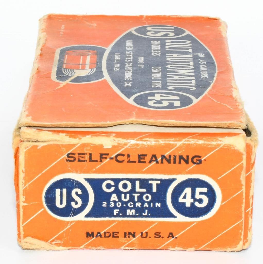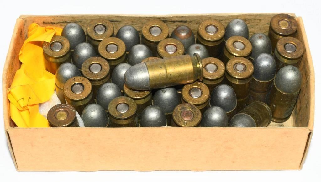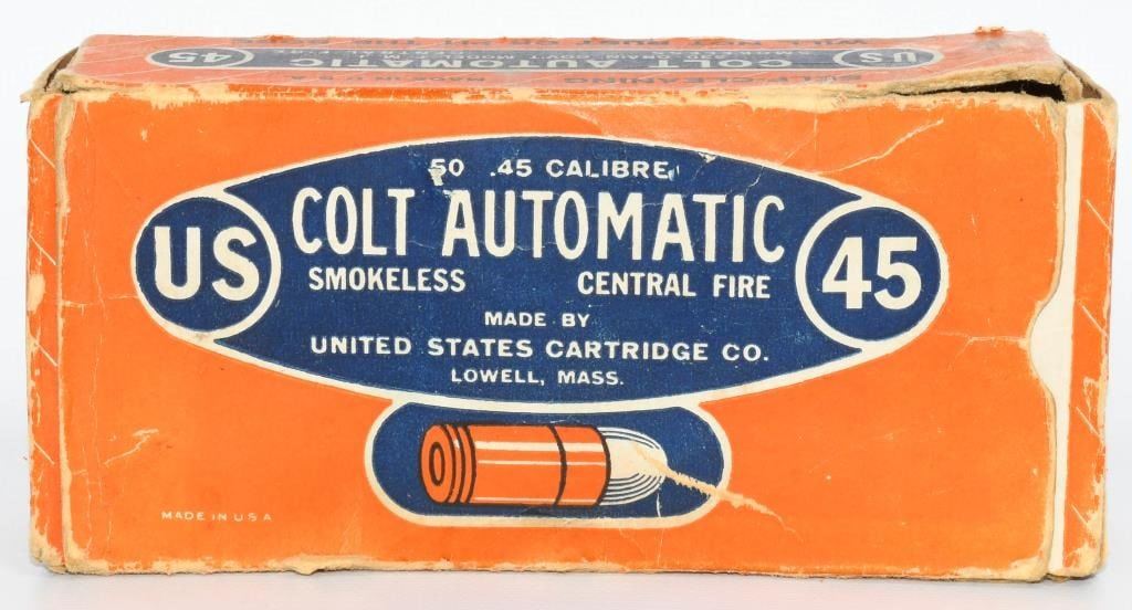 Greetings, avid collectors! Unearth a remarkable piece of firearms history with this rare find ? a collector box of US .45 ACP Ammunition. Crafted by The United States Cartridge Co, this exclusive set contains approximately 41 rounds, each embodying the precision and quality synonymous with US military cartridges. Before you embark on this thrilling bidding experience, savor the rarity of this US treasure and ensure compliance with local ammunition regulations for a seamless and joyous addition to your esteemed collection. Bid with enthusiasm, collectors, and may the acquisition of this US .45 ACP box bring both joy and a distinctive touch of historical artistry to your esteemed collection! Happy bidding!
