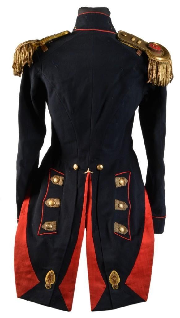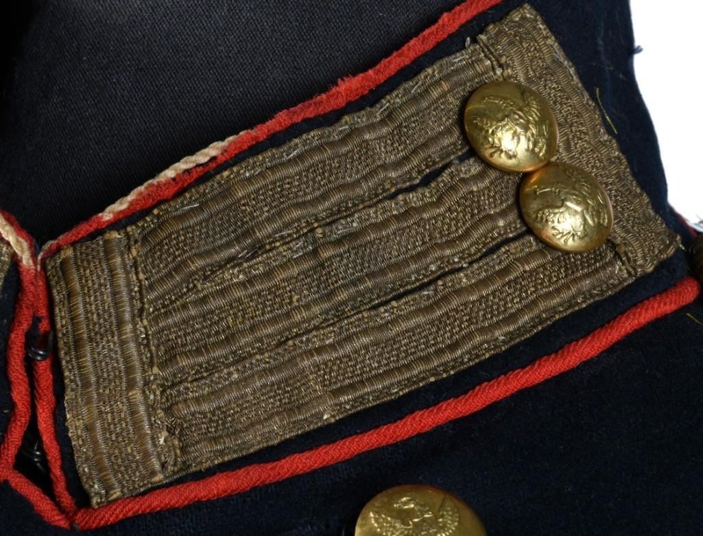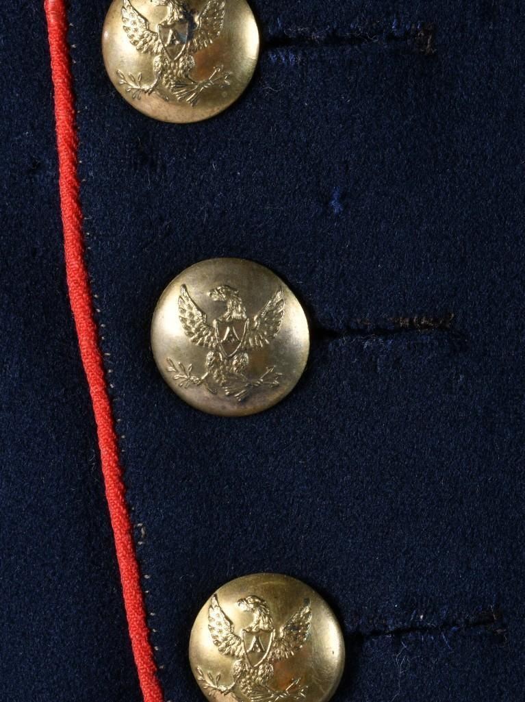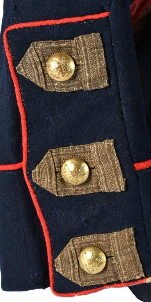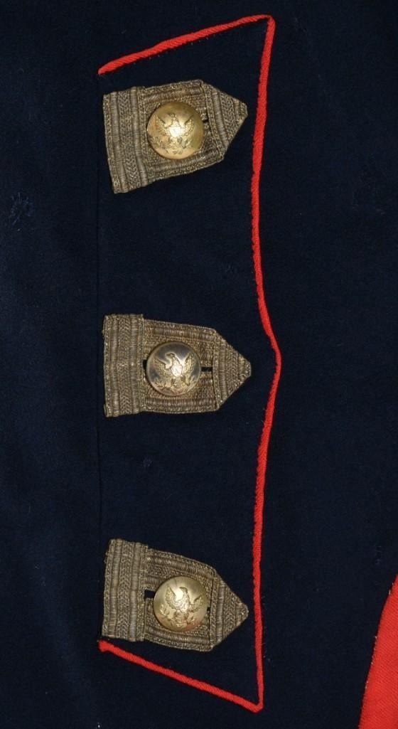 Blue wool body, trimmed in Red around the edges. Gold bullion on the collar and sleeves, the sleeves also outlined in red around the edges. The rear coat tails are outlined and red trim. Gold bullion and ordnance bomb on each tail on yellow background. Coat is lined with brass eagle buttons marked with & #34;A& #34;. Both brass epaulettes with red background round disk with a brass gilt & #34;3& #34; and Captains bars. These early Officers uniform seldom come up for sale in this condition.