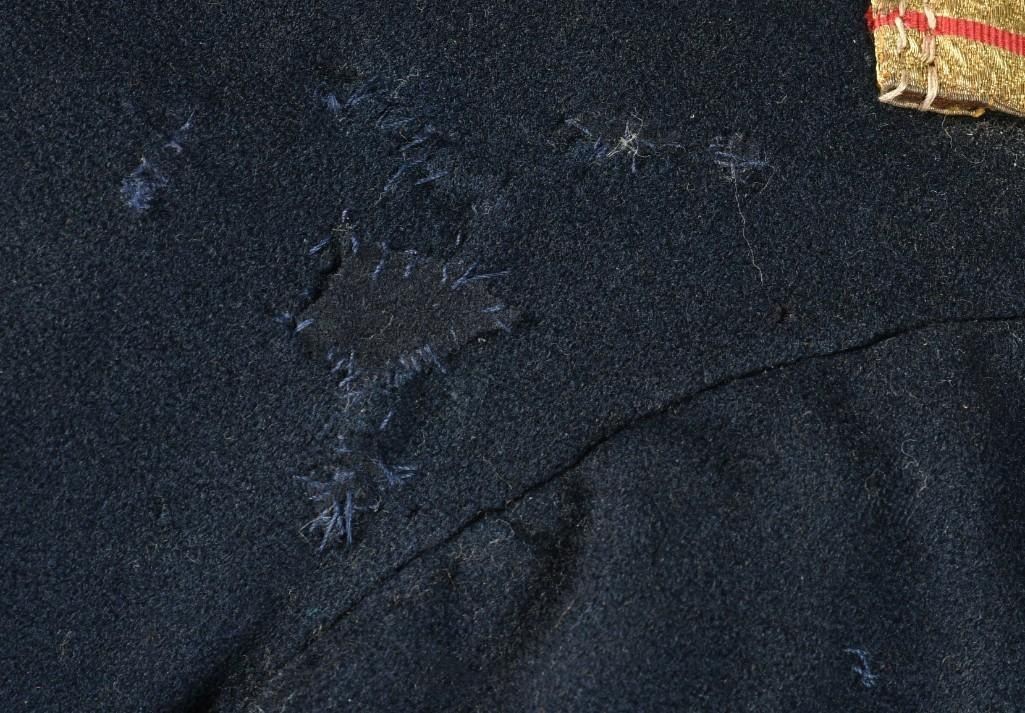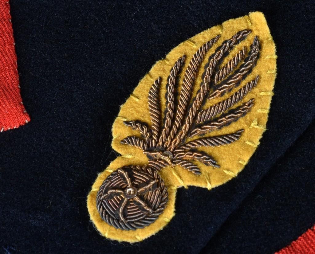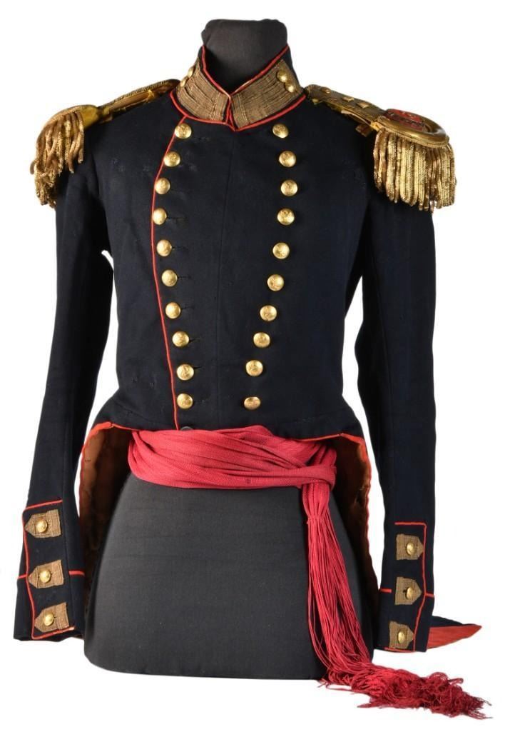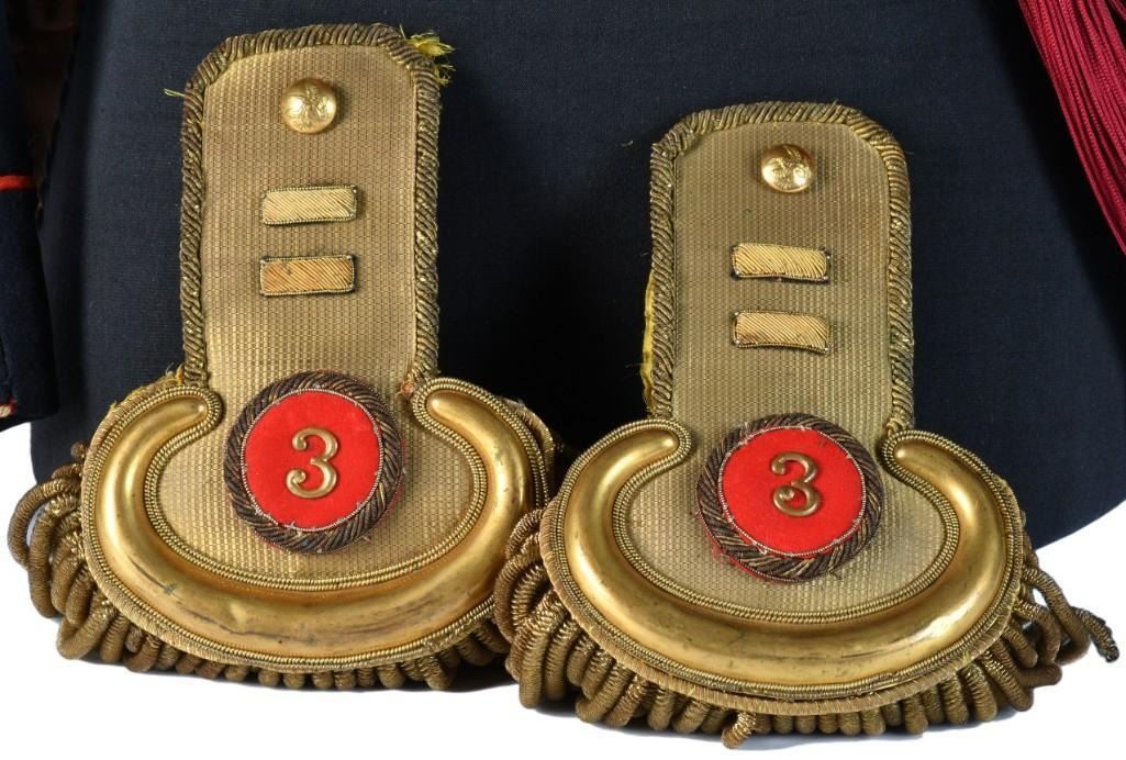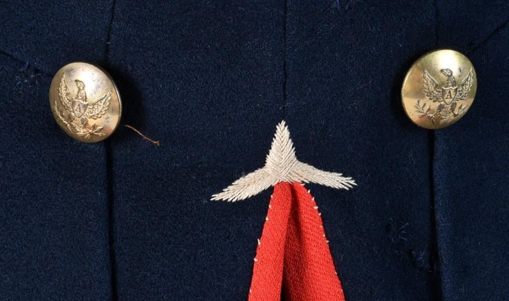 Blue wool body, trimmed in Red around the edges. Gold bullion on the collar and sleeves, the sleeves also outlined in red around the edges. The rear coat tails are outlined and red trim. Gold bullion and ordnance bomb on each tail on yellow background. Coat is lined with brass eagle buttons marked with & #34;A& #34;. Both brass epaulettes with red background round disk with a brass gilt & #34;3& #34; and Captains bars. These early Officers uniform seldom come up for sale in this condition.