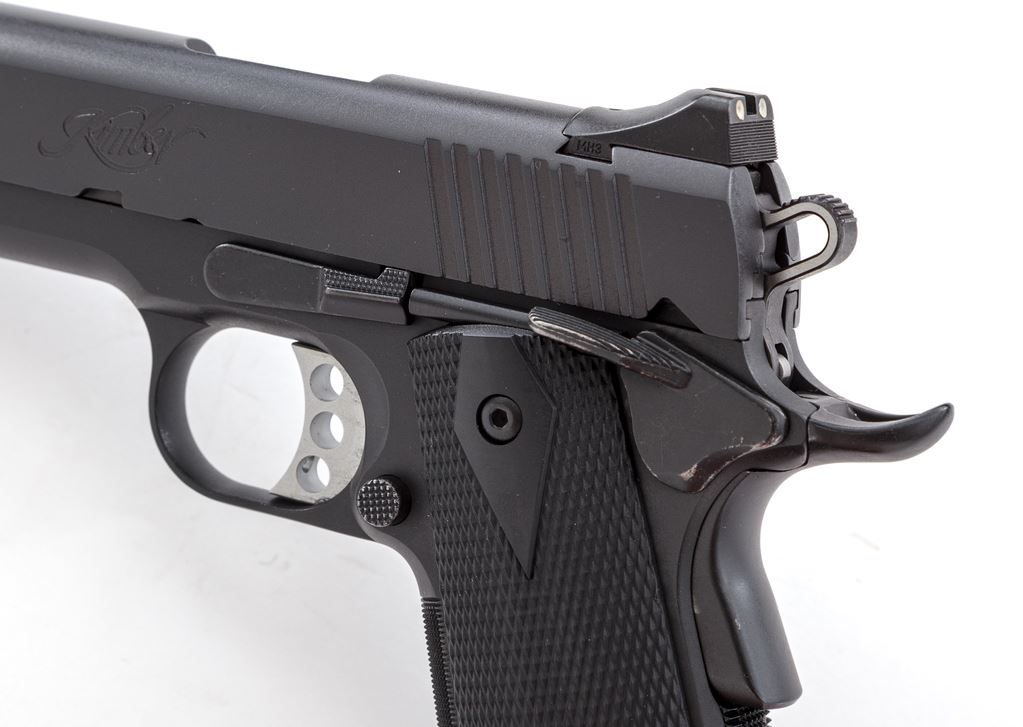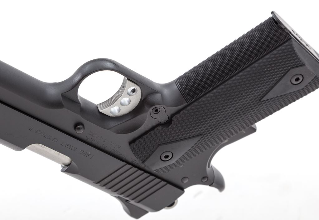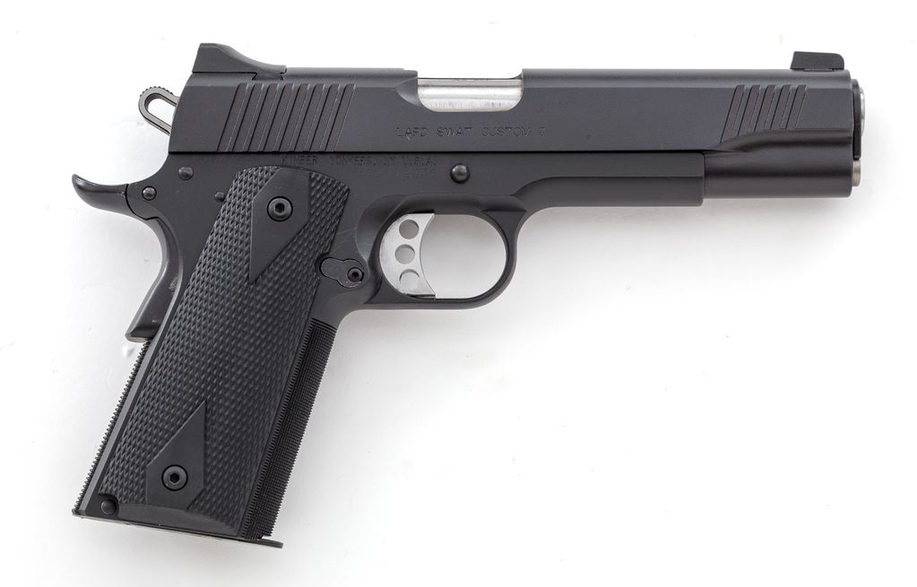Rare and Desirable Kimber LAPD Swat Custom II Semi-Automatic Pistol, #KLA114402, .45ACP cal., 5'' barrel, matte dark oxide coated stainless steel slide and frame, diamond checkered rubber grips. Low profile Metrolight 3-dot night sights, 30 lines-per-inch checkered front strap, flat checkered mainspring housing, and one Kimber magazine. Weigh in at 38 oz. Mfg'd 2002. Following extensive testing LAPD SWAT choose a Kimber Stainless Custom II and had it enhanced to their own specifications, made strictly for law enforcement and not sold to the public with just 300 produced. These are very rarely found for sale with just one showing up on the internet for $8000. The serial number has the distinct coded meaning of K (Kimber) LA (Los Angeles) 114 (SWAT radio code based on their room number at Parker Center) followed by its 3-digit number. Quite possibly the most collectible Kimber available. From the collection of a retired LAPD Captain. Condition is as new and unfired, in its original hard case with all accessories. Est.: $2,500-$3,500. (Modern/PPT)