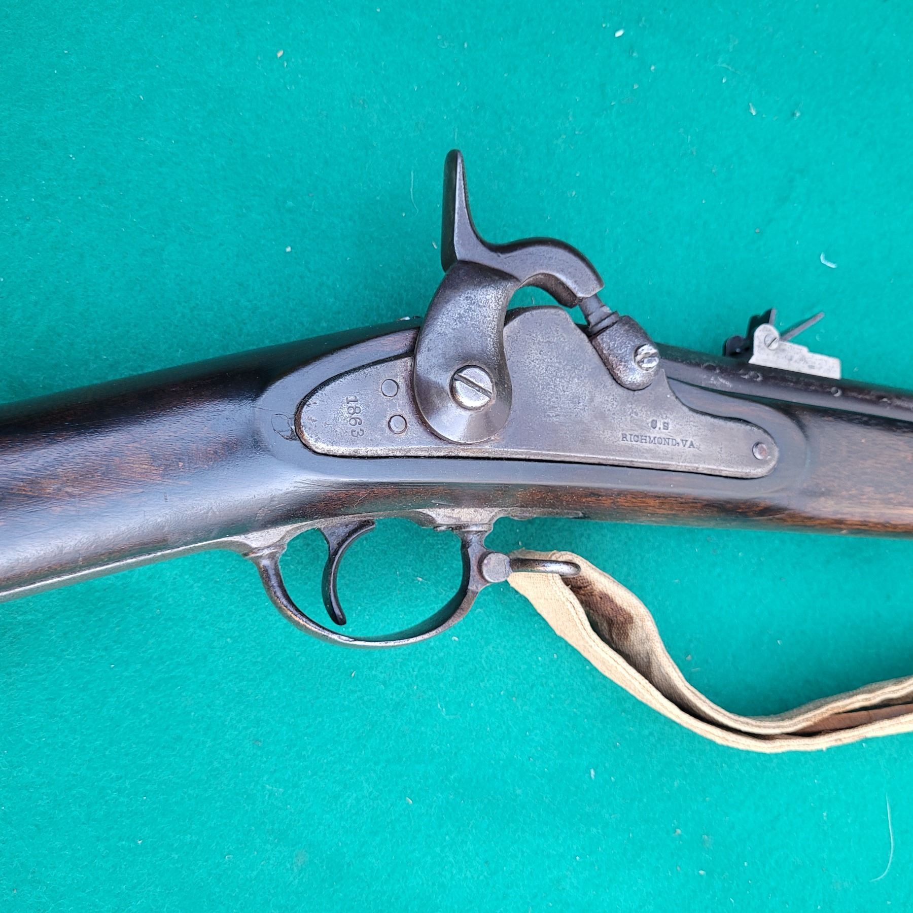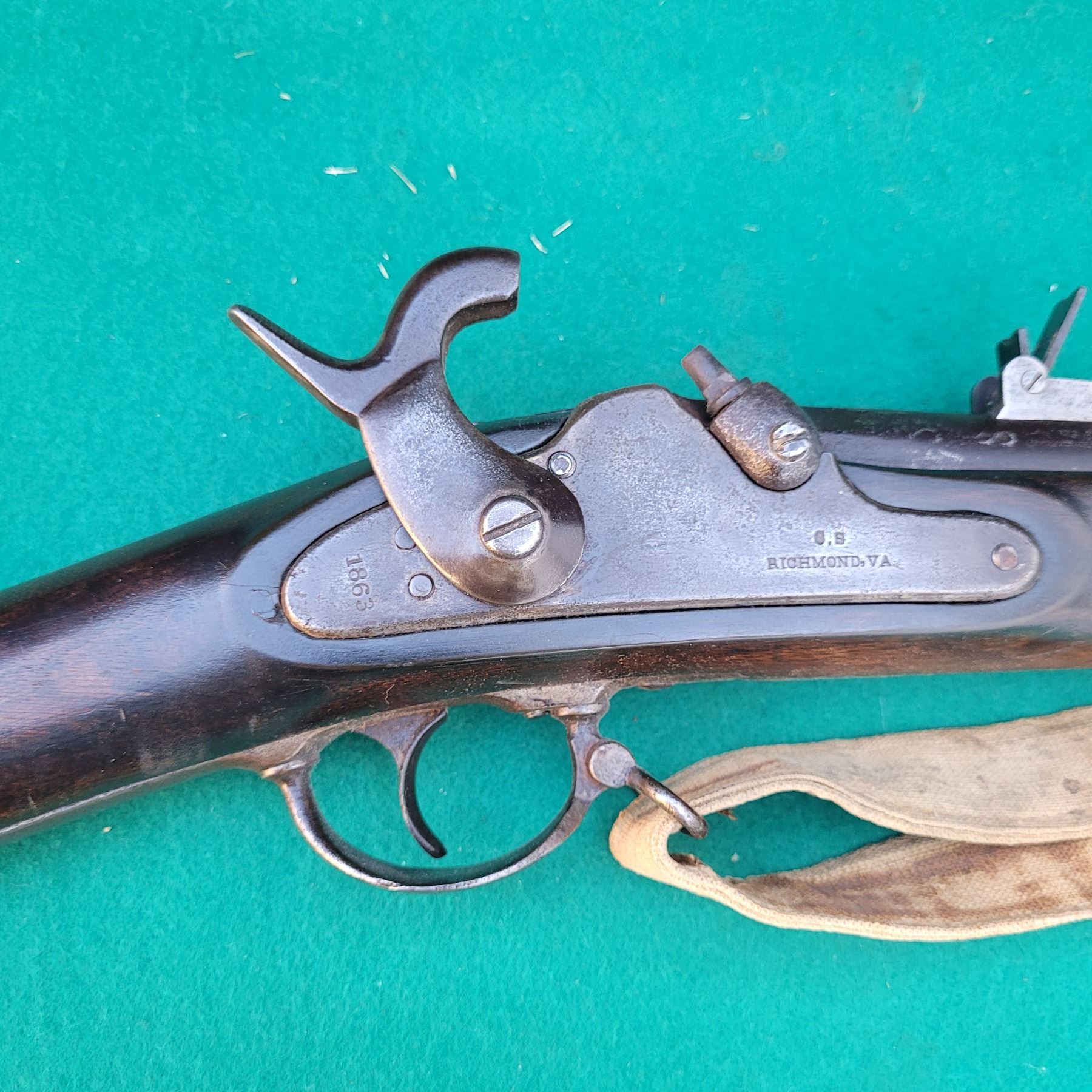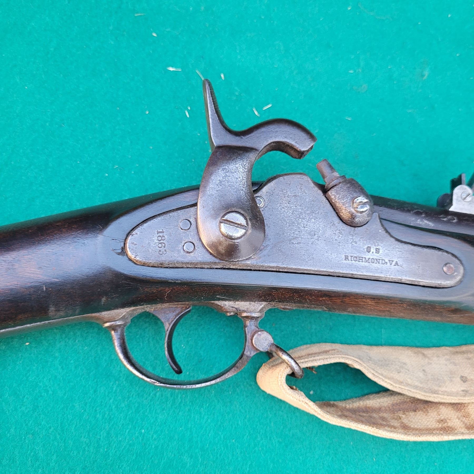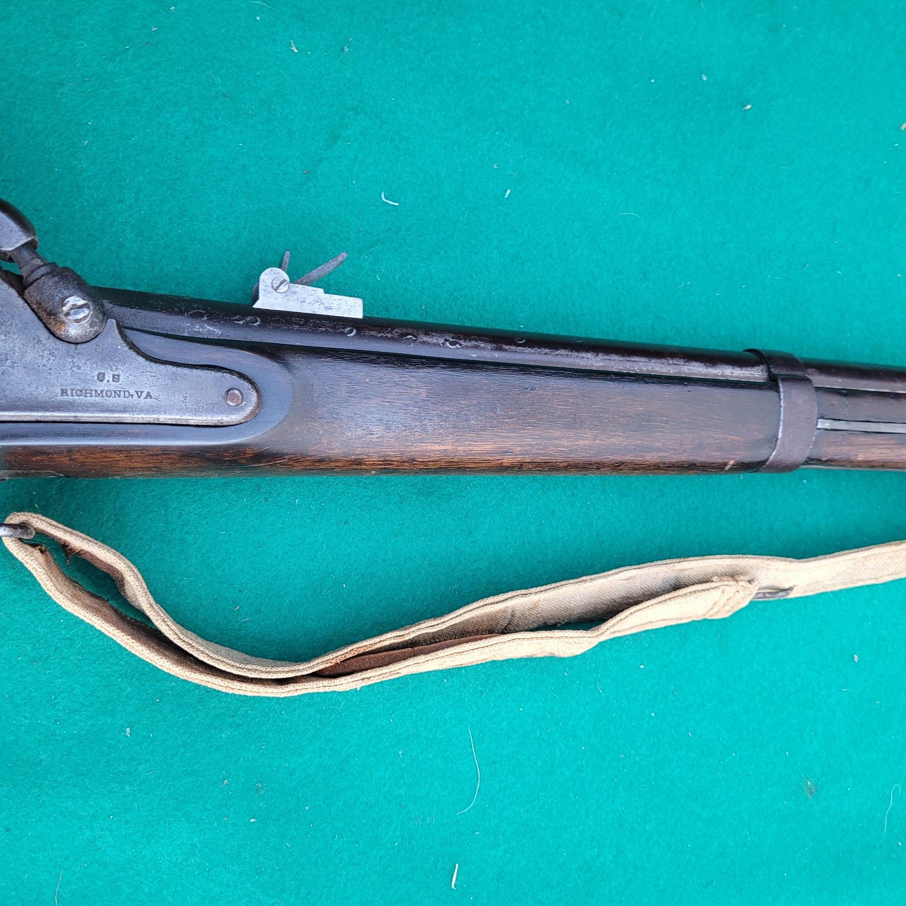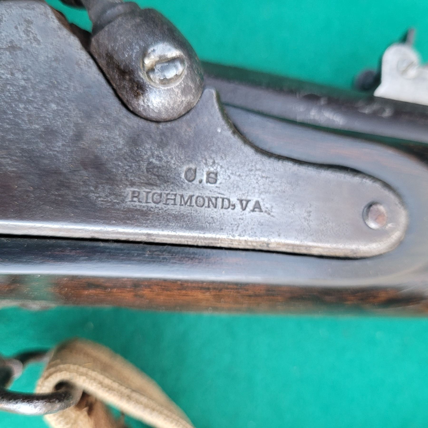 Made at the Richmond Armory, Virginia. Marked on the lock "C.S. over Richmond, VA" dated 1863. Also marked "C.S." on the top tang of the brass buttplate. Bonus: comes complete with original linen shoulder strap.