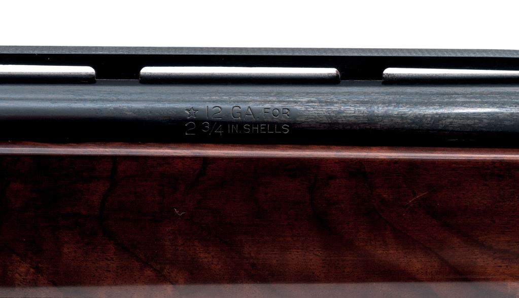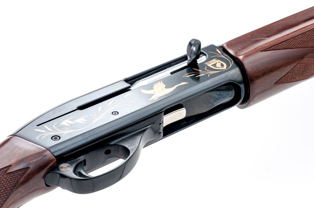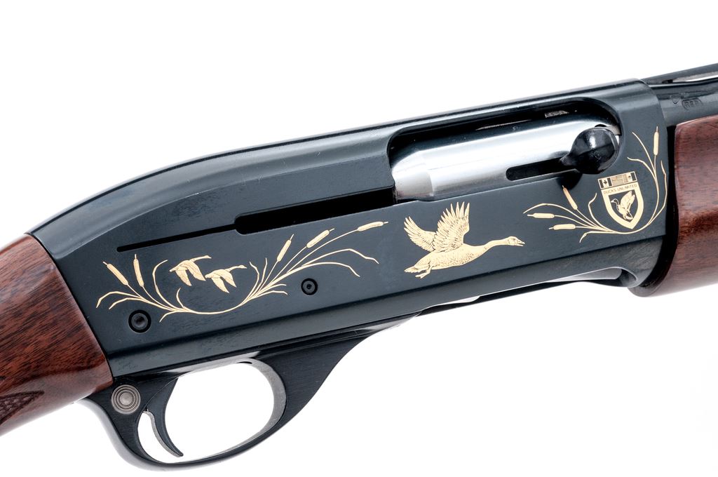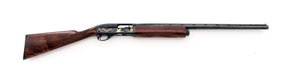 Remington 1100 Upland Special 1985 Ducks Unlimited Model Semi-Automatic Shotgun, #DU851262. 12 ga. 25.5'' vent rib barrel has a 2-3/4'' chamber, target beads, and is fitted for Briley screw-in choke tubes (one IM included). Action is classic 1100, but receiver has gold ducks in flight and DU logos. The full forend and straight grip buttstock are of ''B'' Grade walnut, satin finished, with 14-1/4'' length of pull. Mfg'd 1985. Condition is very good showing little use and a few handling marks on the wood. A handsome and functional Upland bird gun. Est.: $450-$600. (Modern)