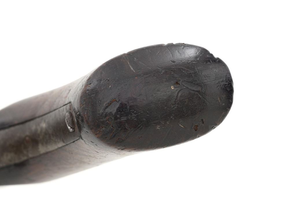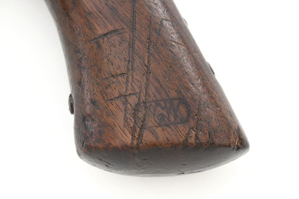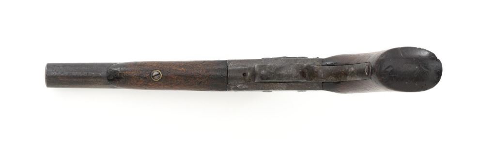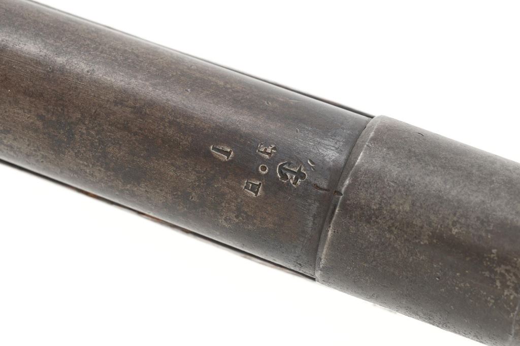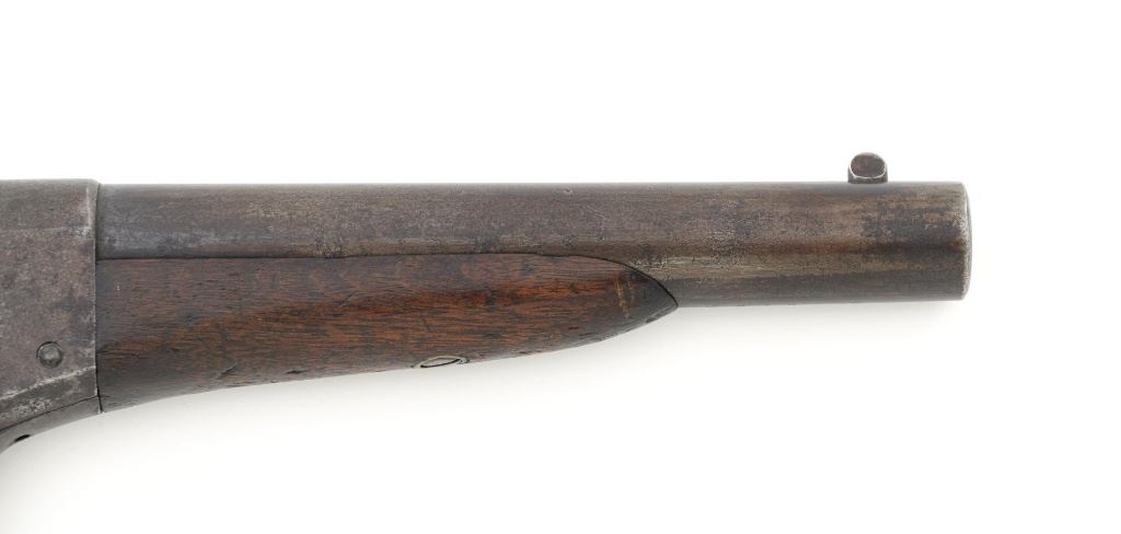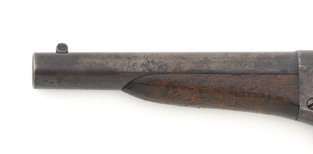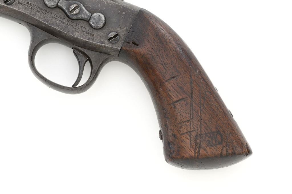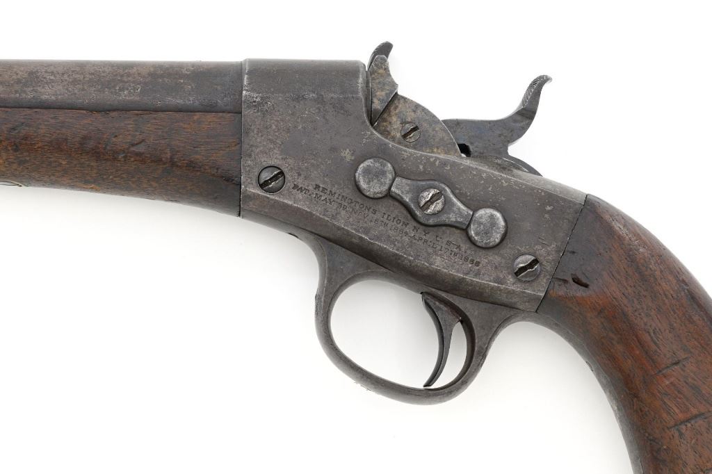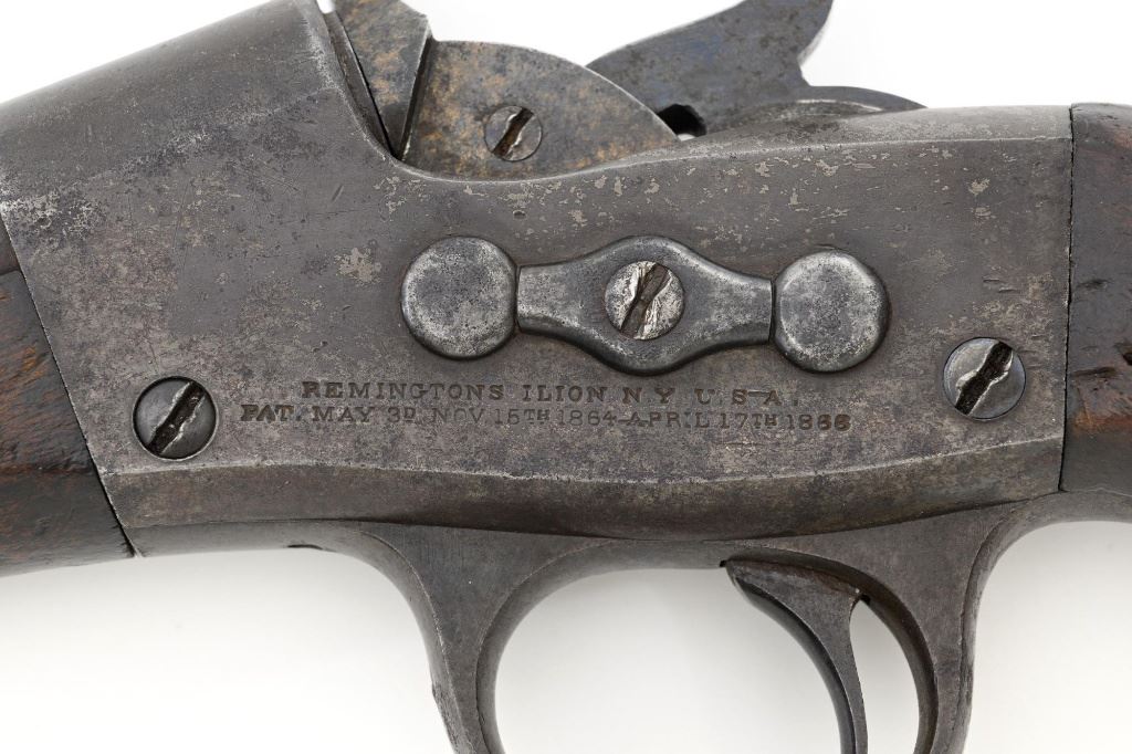 Remington 1867 Navy Rolling Block Single Shot Pistol, #6120, .50 CF cal., 7" round barrel, originally with blue and case hardened finish, smooth one-piece walnut grip, fixed blade front sight, with small "V"-notched groove located on the breechblock. Marked on top of the barrel near the breech "I/H.E./(Naval anchor)" Right side of the frame is marked "P/F. C. W.", with another "F. C. W." stamped on the underside of the barrel at the breech. Matching visible numbers on the underside of the barrel, forend, left side of the grip frame, and inside the lower section of the grip. Bottom left side of the grip also displays the "F. C. W." inspectors cartouche. Left side of the frame is marked in two-lines "REMINGTONS ILION N.Y. U.S.A./PAT. MAT 3D NOV. 15TH 1864 APRIL 17TH 1866". Mfgd circa early 1870s. Overall condition of this pistol is good as un-cleaned, with general brown patina, scattered light erosion, and traces of silvered case colors on the receiver. Grip and forend exhibit age and wear consistent with that of the metal surfaces, displaying four old "hash marks" and two longer horizontal scratches to left side of the grip. Factory lettering and Naval markings are clear. Action is strong. Bore is fine with well-defined rifling and intermittent spots of mild erosion and pitting. Est.: $1,000-$1,400. (Antique) (Michael Strietbeck Collection)