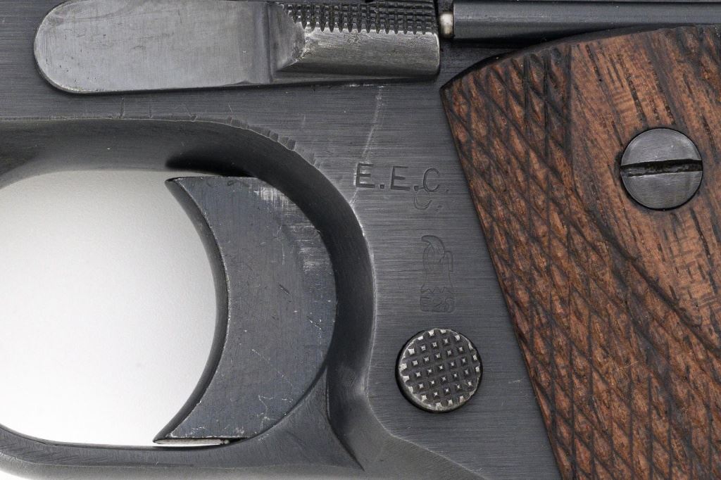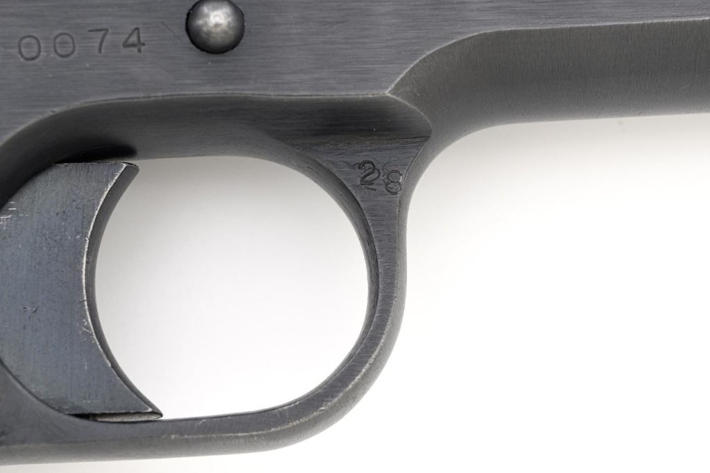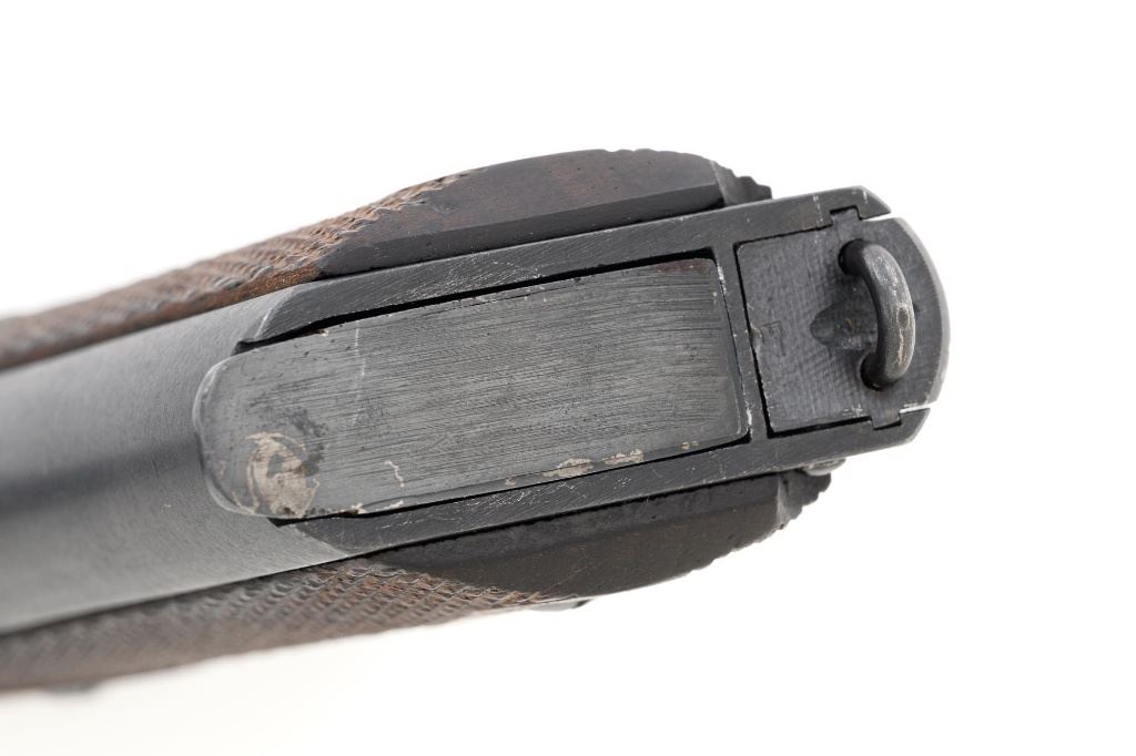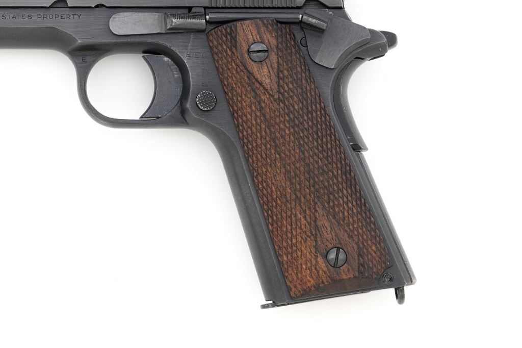 Remington Arms-UMC Model 1911 U.S. Army Semi-Automatic Pistol, #10074, .45 ACP cal., 5" barrel, reblued finish, replacement checkered double diamond walnut grips, with standard blade front sight and "U"-notched rear sight. Includes two (2) WWI two-tone magazines, one is marked "A". Mfgd Dec. 1918. Frame is marked "UNITED STATES PROPERTY" and "E.E.C." (Maj. E.E. Chapman) inspection mark over an "(eagle)" on the left side. Slide has patent dates to Aug. 19, 1913, "REMINGTON/UMC" in a circle, and "MANUFACTURED BY/REMINGTON ARMS UMC CO. INC./BRIDGEPORT. CONN. U.S.A." on the left side. Right side is marked "MODEL OF 1911/U.S. ARMY CALIBER .45". An "E" is stamped on the trigger guard, mainspring housing, and back of the slide. Barrel has the correct "P" on top. and the bore is good with light frosting. Pistol is in excellent overall condition as professionally restored, retaining approx. 98% blue, barrel was polished white, markings on right side of the slide may have been redone or enhanced. Grips are like new. Action functions properly. Bore is lightly frosted and good overall, with clear rifling. Est.: $2,000-$2,500. (C&R/PPT)(Michael Strietbeck Collection)