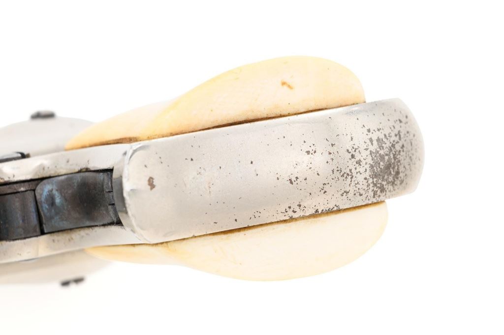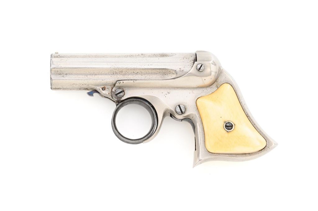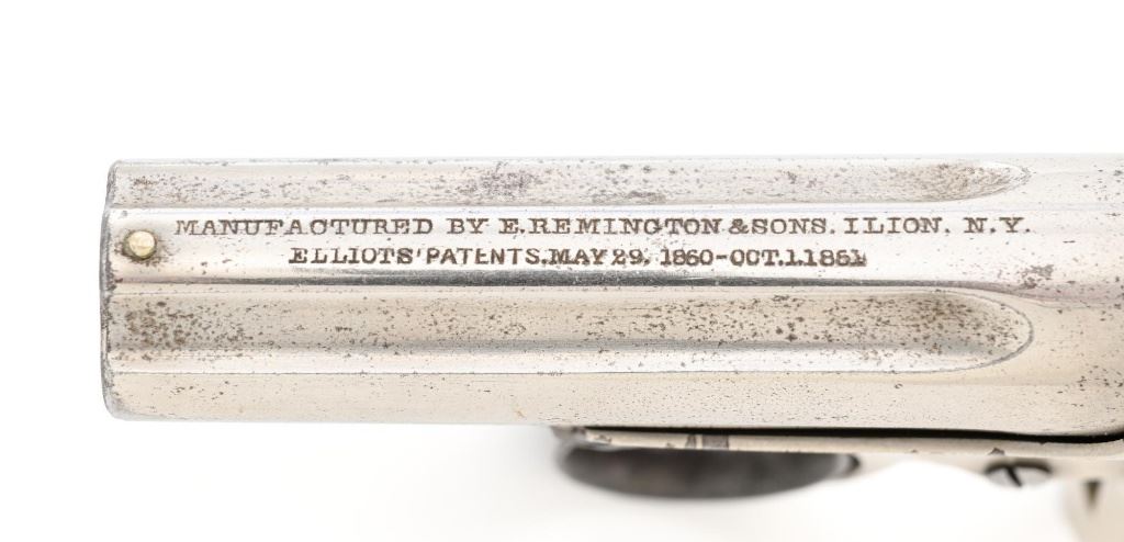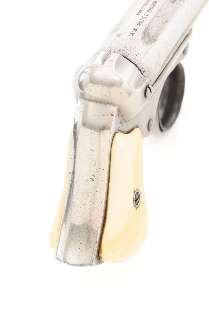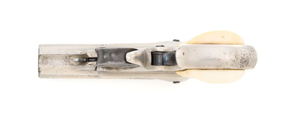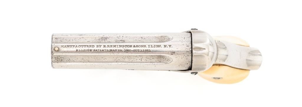 Remington-Elliot Ring Trigger 5-Shot .22 Caliber Derringer, #12443, .22 RF cal., 3" fluted 5-shot barrel assembly, nickel finish, blued ring trigger mechanism and barrel release lever, period two-piece ivory grips, small bead front sight, and notched rear sight. Barrel address is marked in two-line "MANUFACTURED BY E. REMINGTON & SONS. ILION, N.Y./ELLIOTS PATENTS. MAY 29, 1860-OCT. 11, 1861". Manufactured circa 1863-1870, total production was approx. 25,000, with estimated production in .22 caliber being around 7,500. Overall condition is fine, retaining approx. 93%-95% nickel finish, with intermittent spots of very mild flaking. Blue finish shows moderate darkening. Beautifully toned ivory grips are in fine condition. Markings are sharp. Action functions correctly, but sluggish for the ring trigger returning to its forward position. Bores are fair with visible rifling and scattered erosion. An exceptional example of this scarce Remington derringer. Est.: $600-$800. (Antique) (Michael Strietbeck Collection)