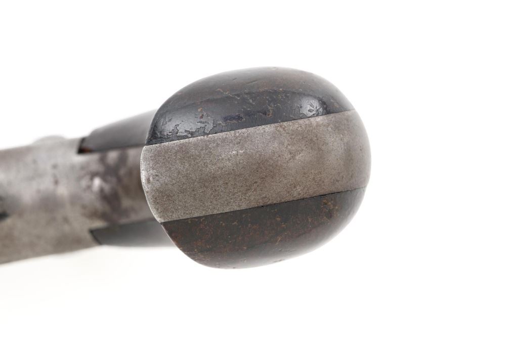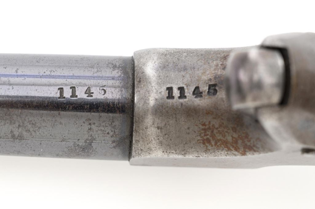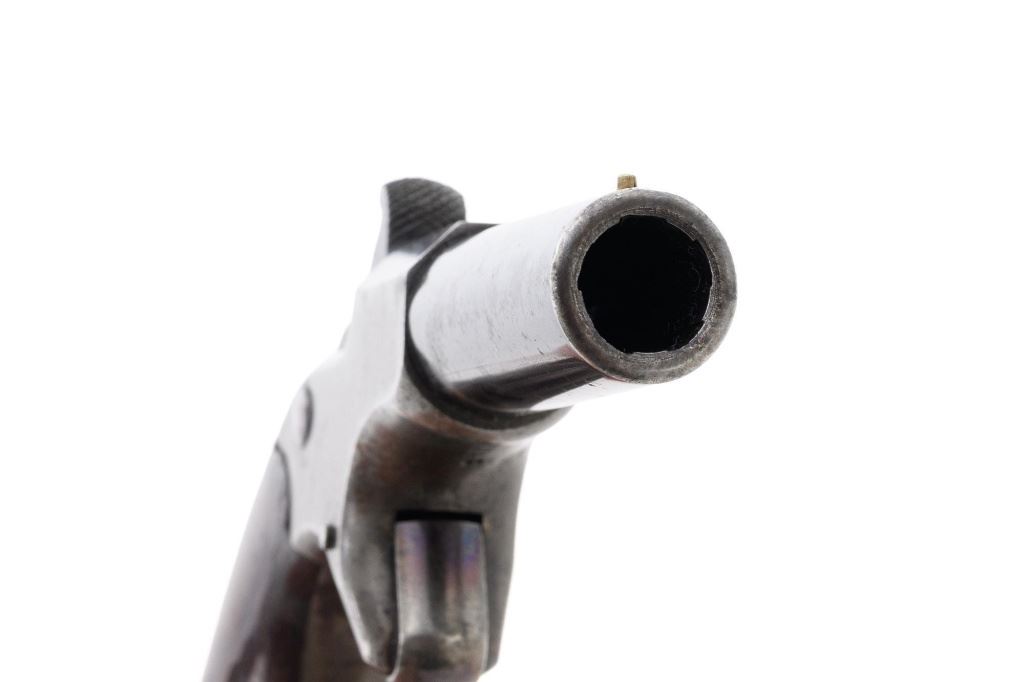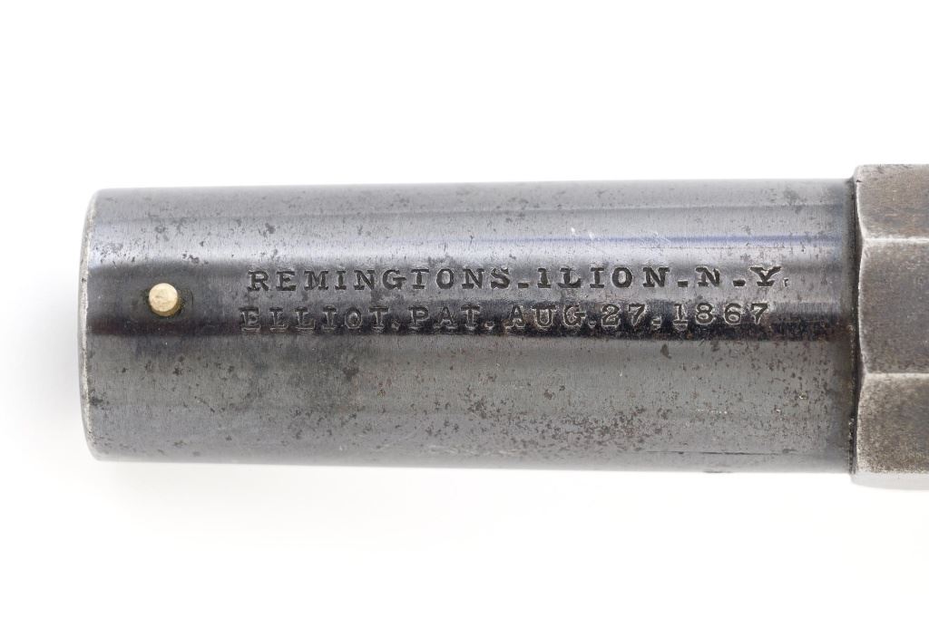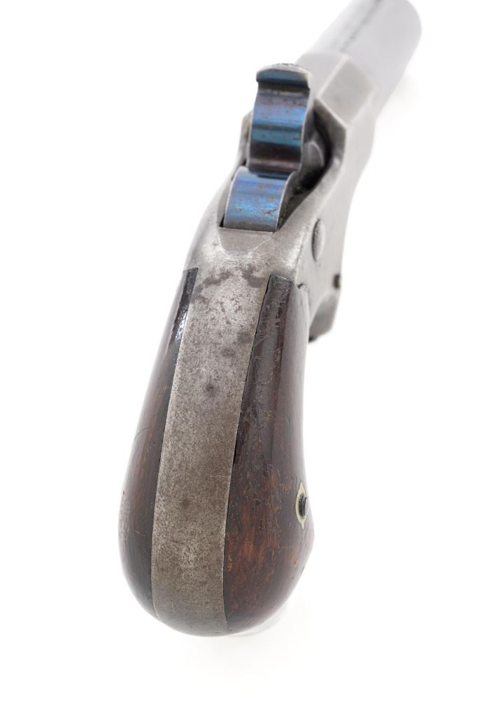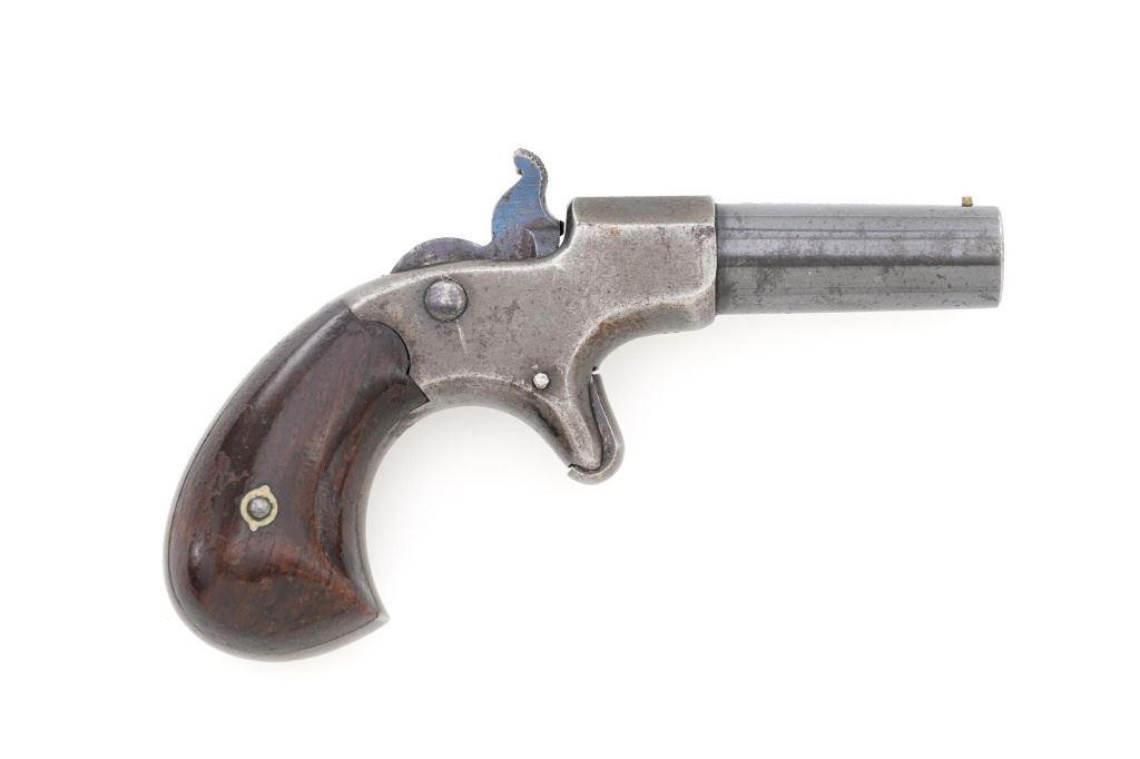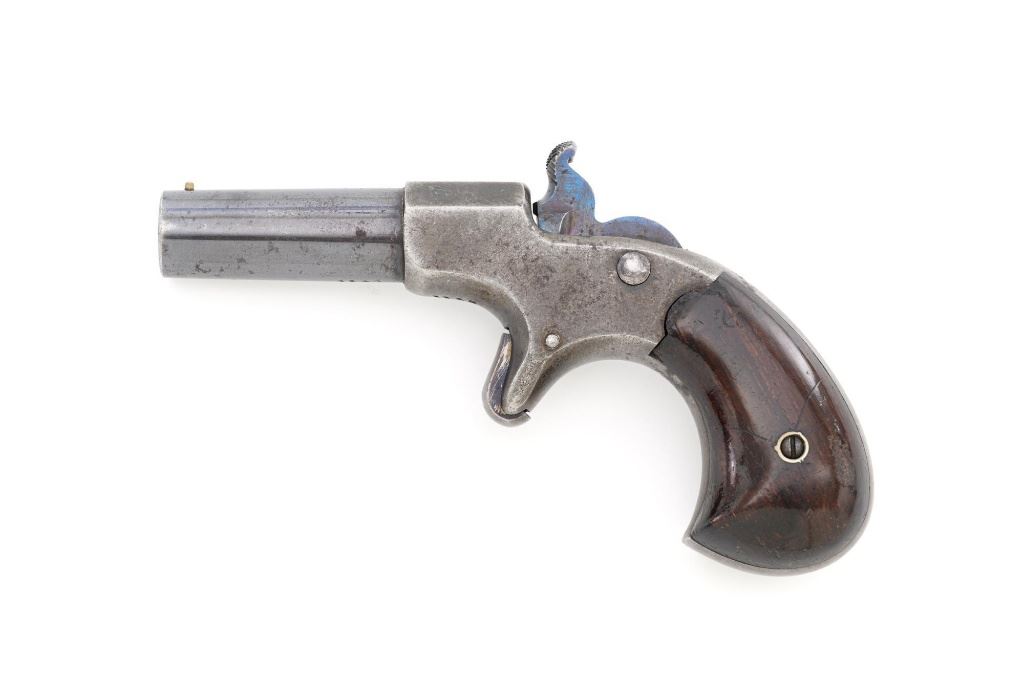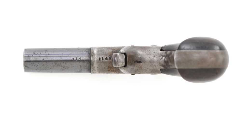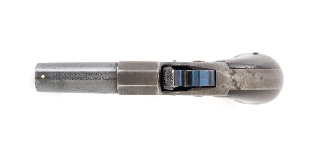 Remington-Elliot Single Shot Derringer, #1145, .41 RF cal., 2.5" barrel, blue finish to the barrel, nitre blued hammer and trigger, two-piece walnut grips, with small bead front sight. Matching numbers on bottom of the frame and barrel. Barrel address is marked in two-lines "REMINGTONS. ILION, N.Y./ELLIOT. PAT. AUG. 27, 1867." Mfgd circa 1867-1888 with an estimated total production of approx. 10,000. Overall condition is very good. Majority of the barrel finish remains, showing areas of thinning and mild patina. Hammer retains approx. 90% nitre blue, finish on the trigger is mostly toned dark, except for the edges. Frame displays a gray/brown patina. Grips are fine, with intermittent moderate handling marks, and areas of flaking to the varnish finish on the lower half of each grip. Factory lettering is sharp. Action is crisp. Bore is primarily bright, with a few small spots of minor erosion, excellent rifling. Est.: $800-$1,200. (Antique) (Michael Strietbeck Collection)