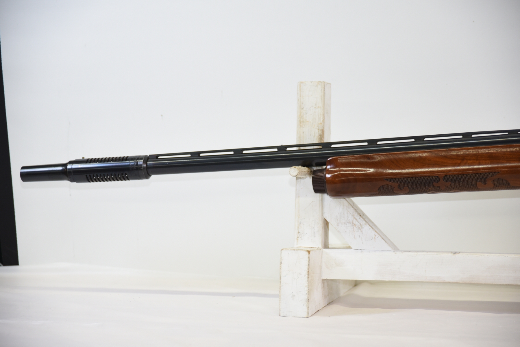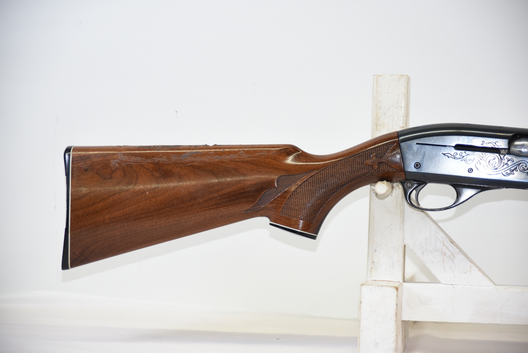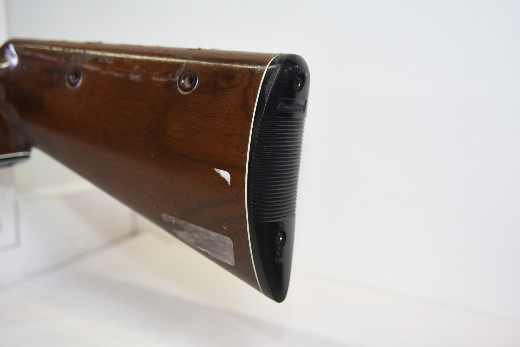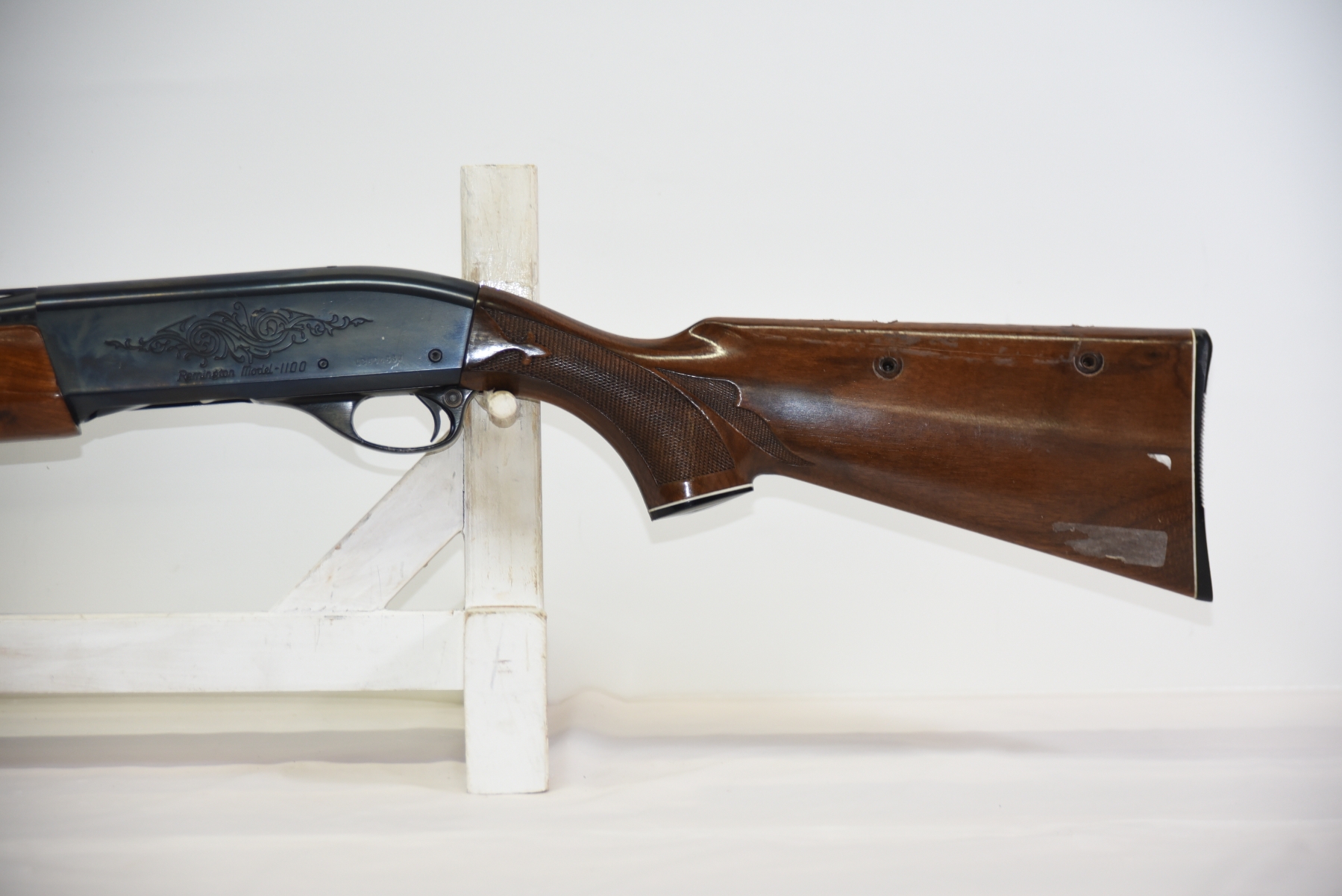 Wood stock shows scratches, scuffs, dents, holes for cheek piece in rear stock; condition is good.