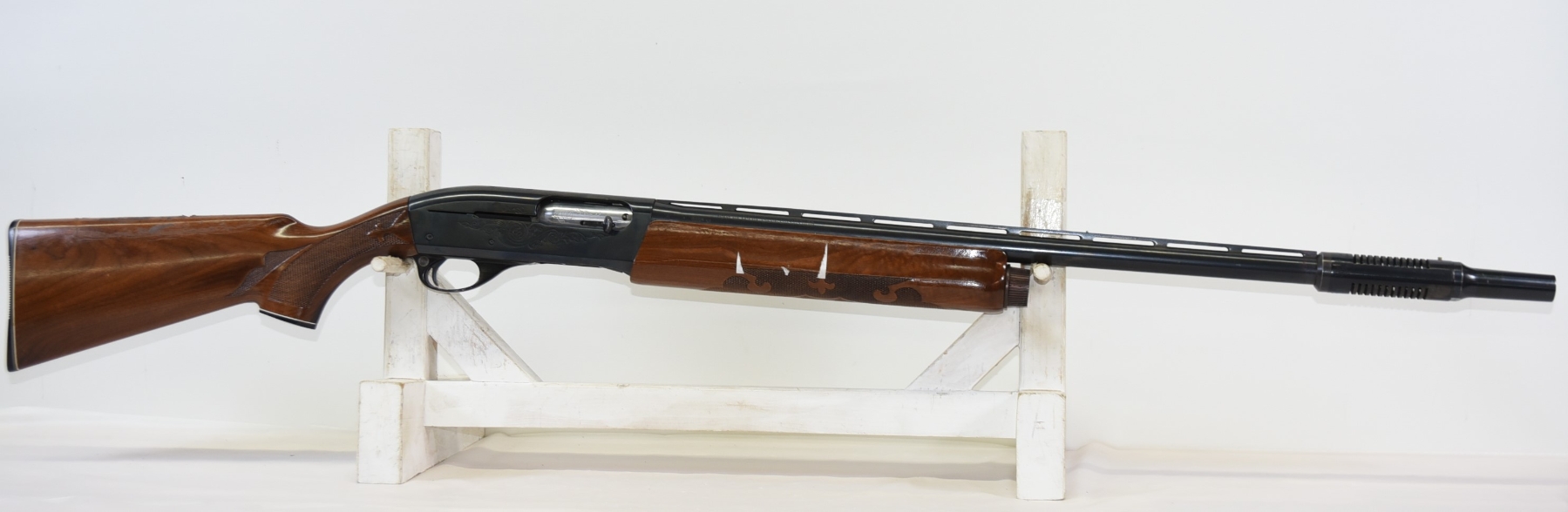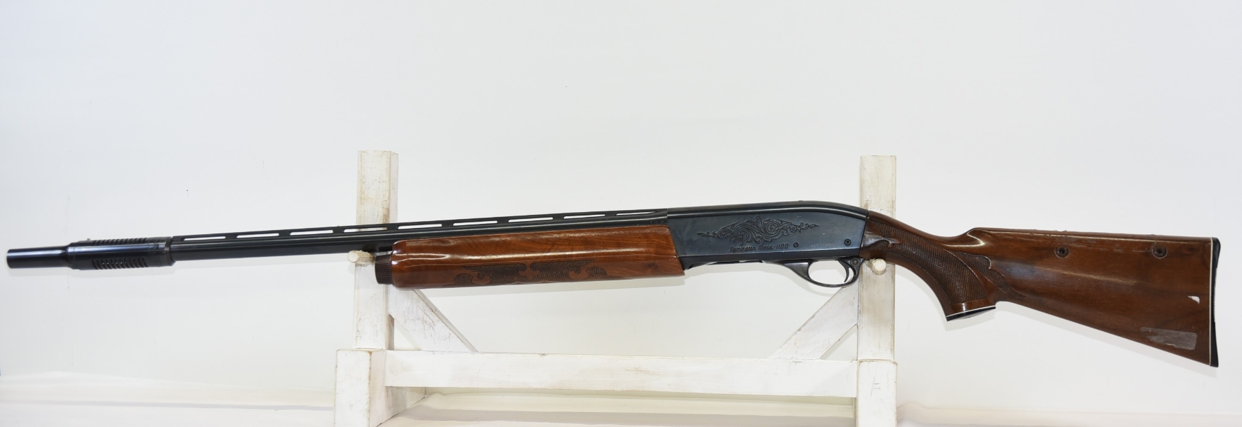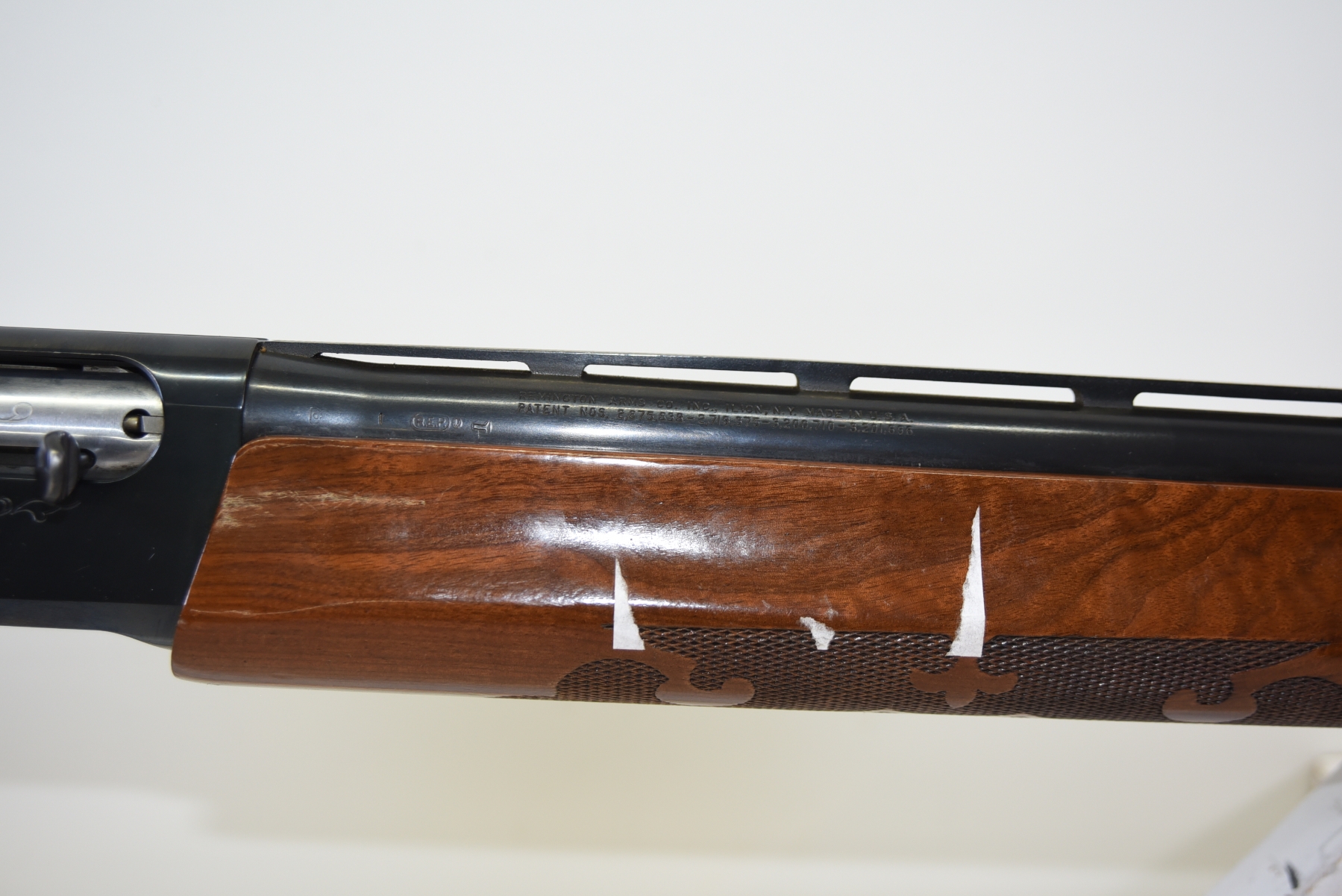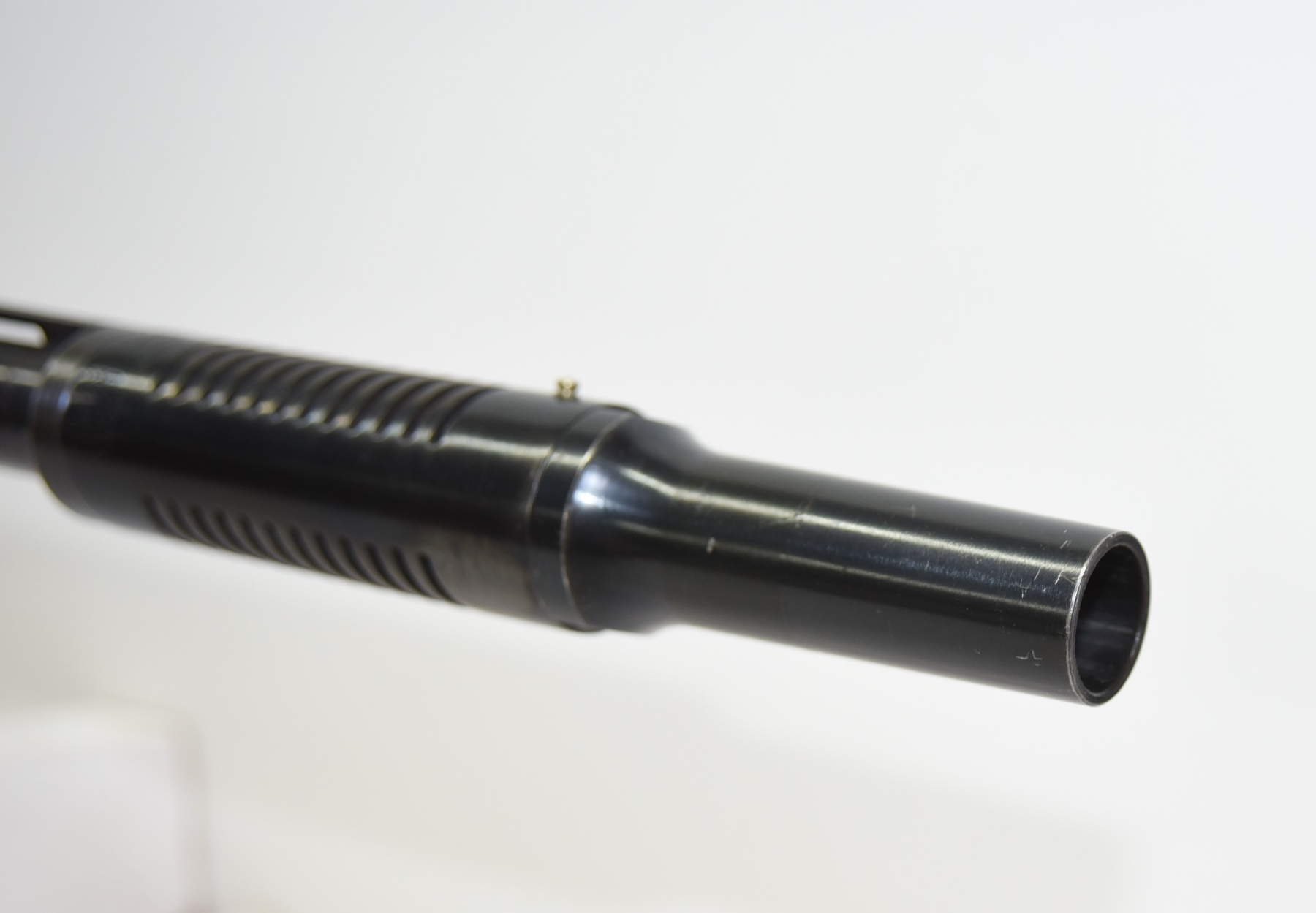 Wood stock shows scratches, scuffs, dents, holes for cheek piece in rear stock; condition is good.