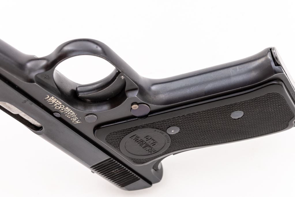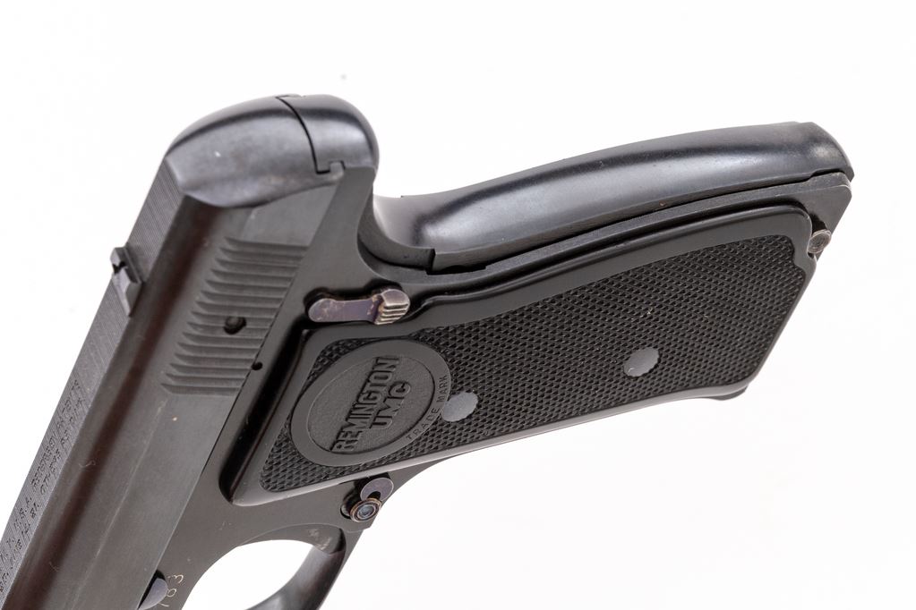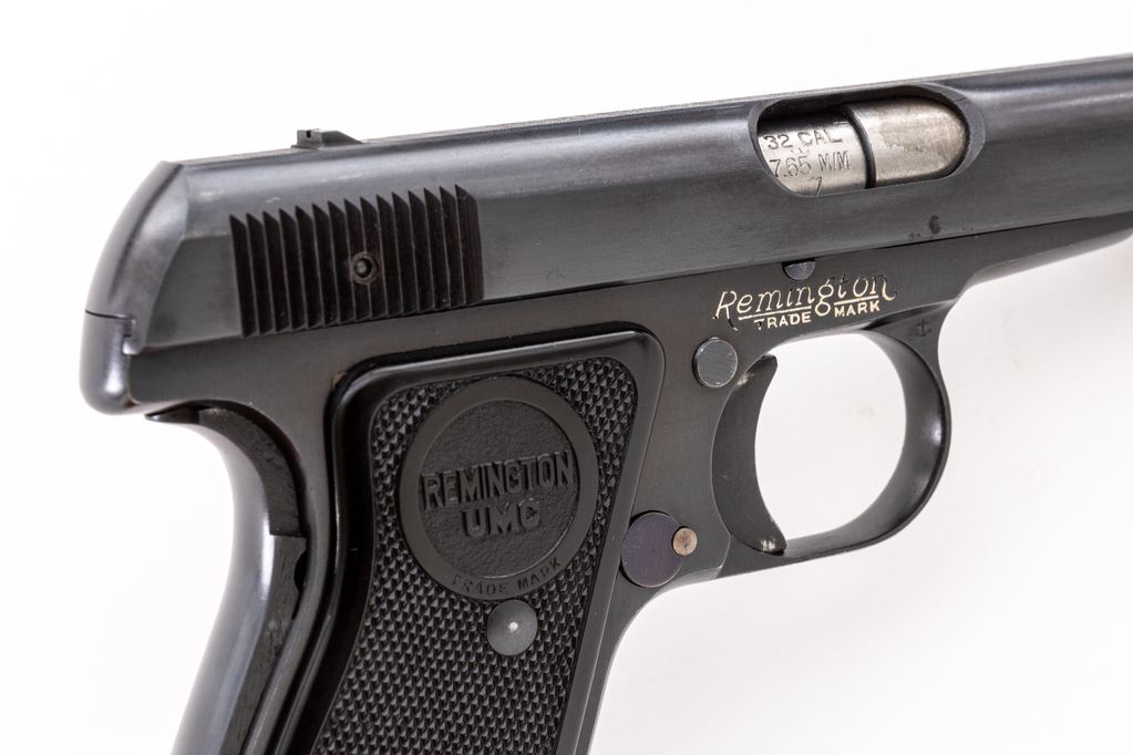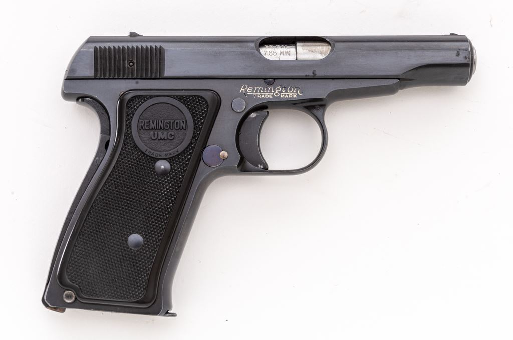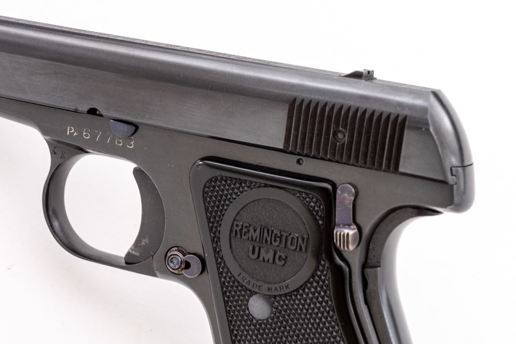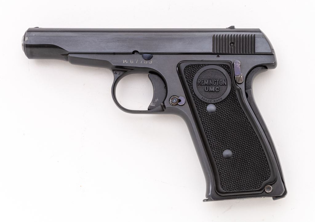 Remington Model 51 Semi-Automatic Pistol, #PA67783, .32 ACP cal., 3.5" barrel, blue finish, checkered black plastic factory grips with Remington-UMC logo, standard sights, and one magazine. Magazine is marked on left side "32 CAL". Condition is near excellent retaining approx. 98% blue. There are a few small pits and spots of finish loss on the front edges of the slide, as well as a small spot of pitting to the bottom right edge. Factory lettering is clear. Grips are very nice with only a few minor handling marks, no chips or cracks. Good action, bright bore with excellent rifling. Est.: $500-$800. (C&R/PPT)