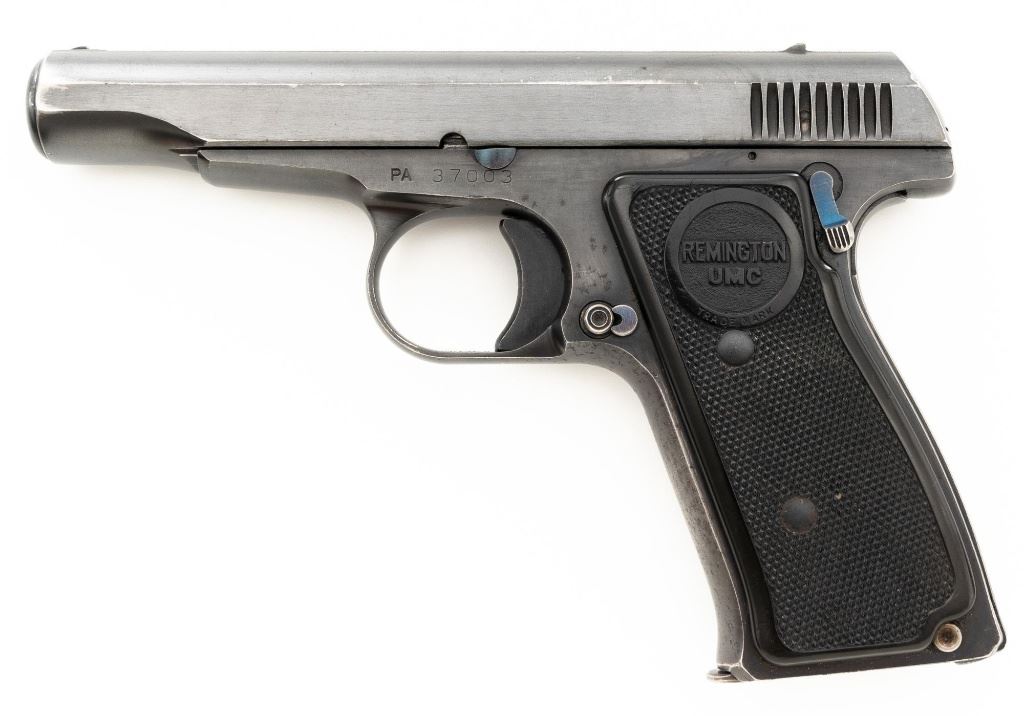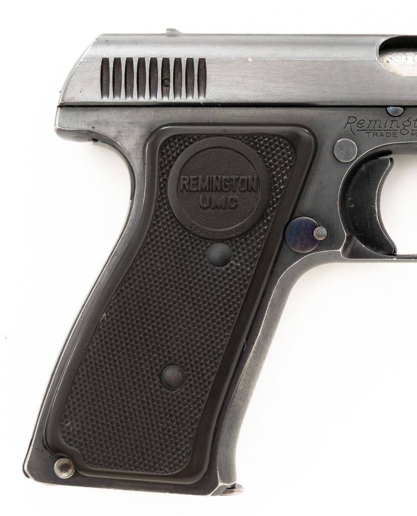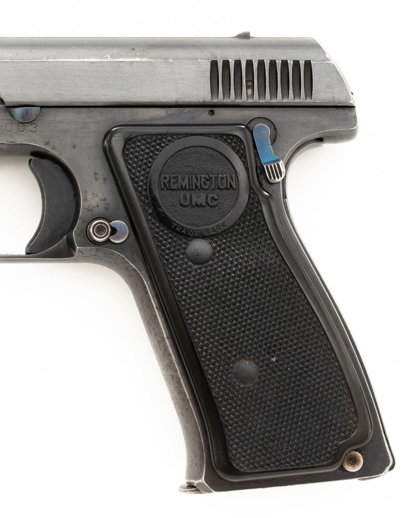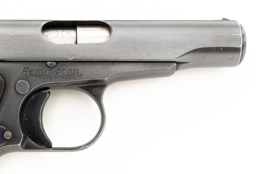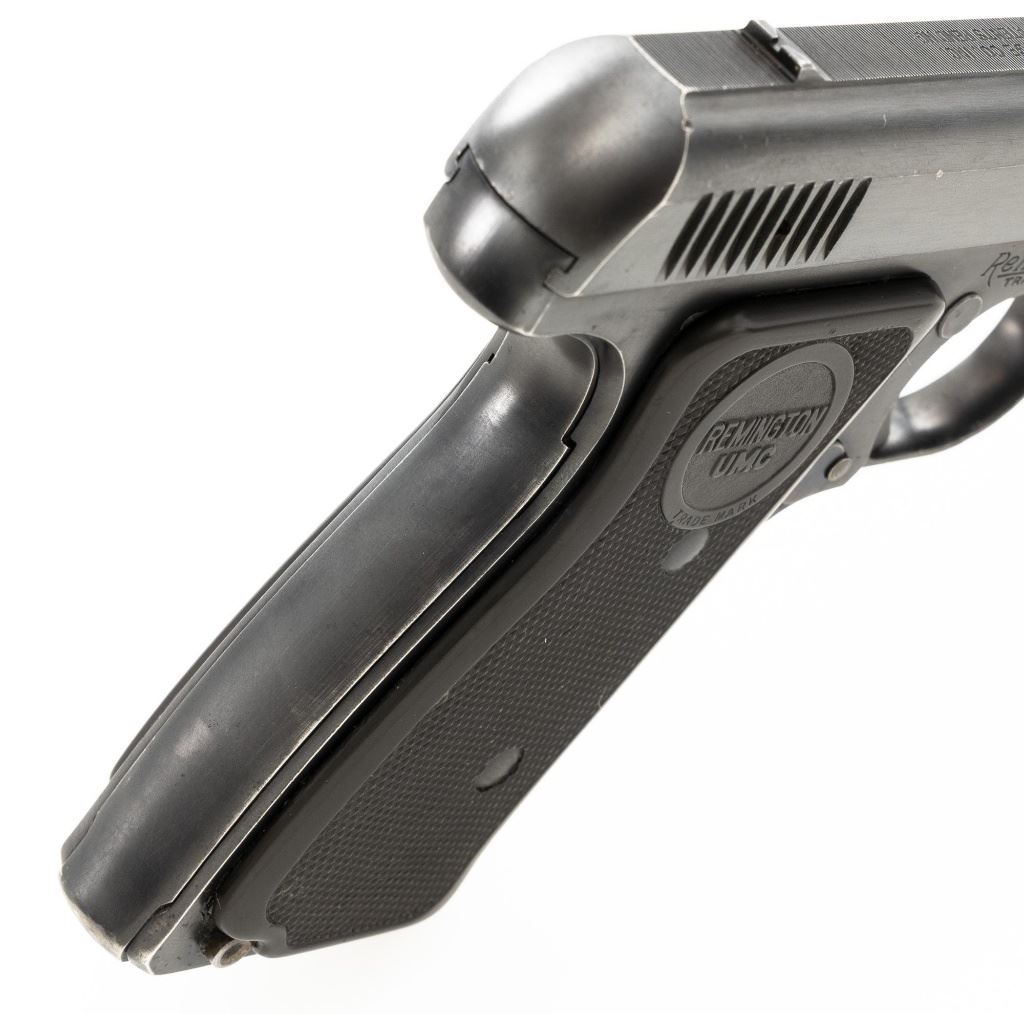 Remington Model 51 Semi-Automatic Pistol, #PA37003, .380 ACP cal., 3.25" barrel, blued finish, checkered black plastic grips embossed with "REMINGTON/UMC" logos on each side, low profile blade front sight, and fixed rear sight with square-notched groove. Includes one blued steel magazine, marked "380 CAL". Pistol is marked "THE REMINGTON ARMS UNION METALLIC CARTRIDGE CO.INC./REMINGTON ILION WKS.ILION.NY.U.S.A. PEDERSONS PATENTS PENDING" on top of the grooved slide, with "Remington/TRADE MARK" on right side of the frame. Condition overall is very good, retaining approx. 85%-87% blue, showing wear and scratches to left side of the slide, and toning to the grip straps. There is a dent to the slide below the ejection port. Grips are very good, showing normal light handling wear, particularly to the left side. Action operates smoothly. Bore is bright with very good, clearly defined rifling. Est.: $300-$500. (C&R/PPT)